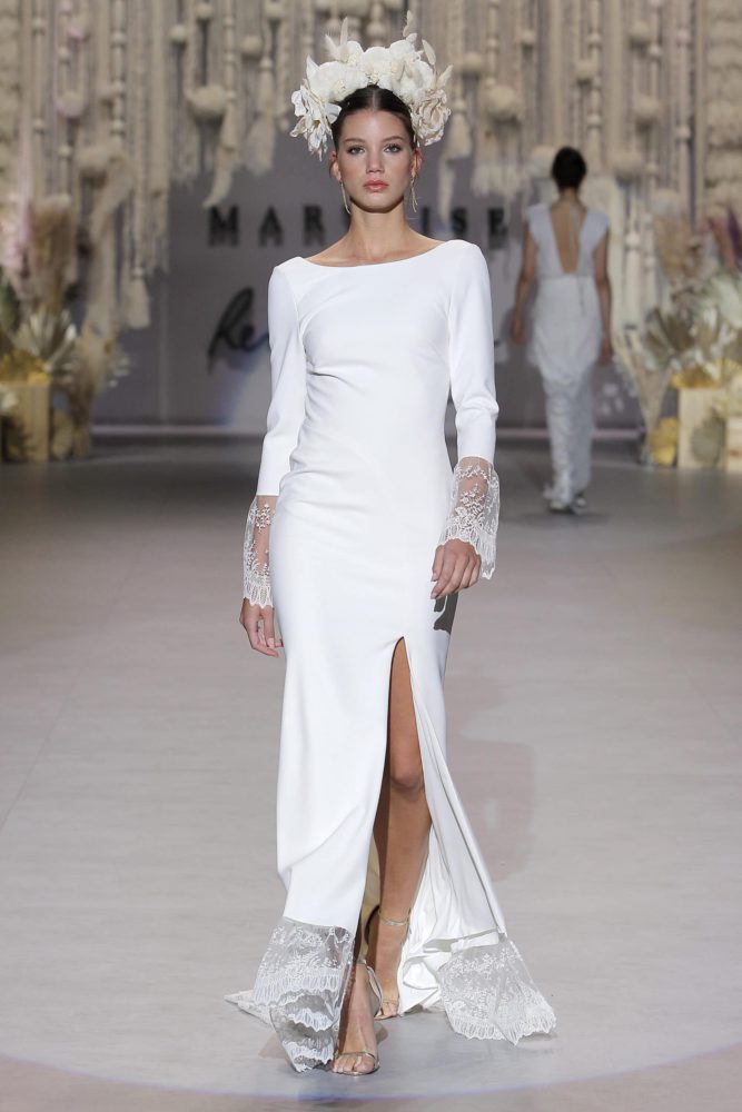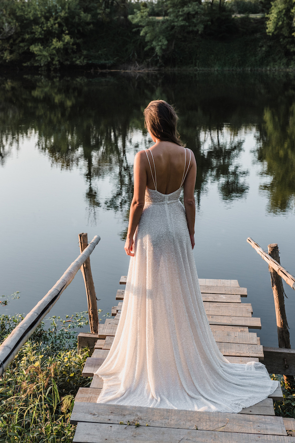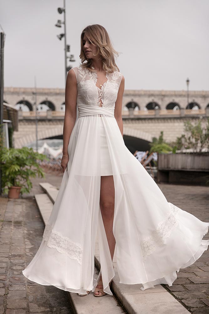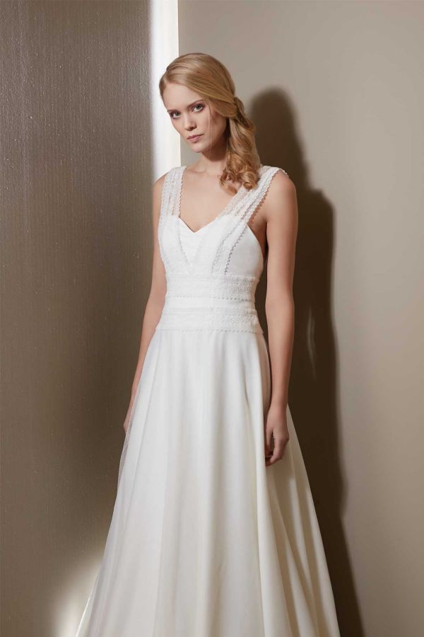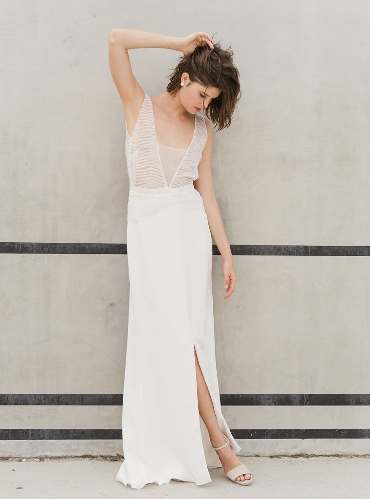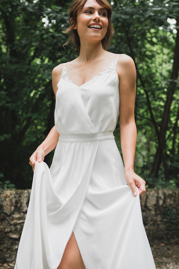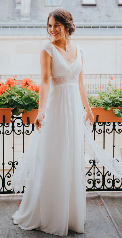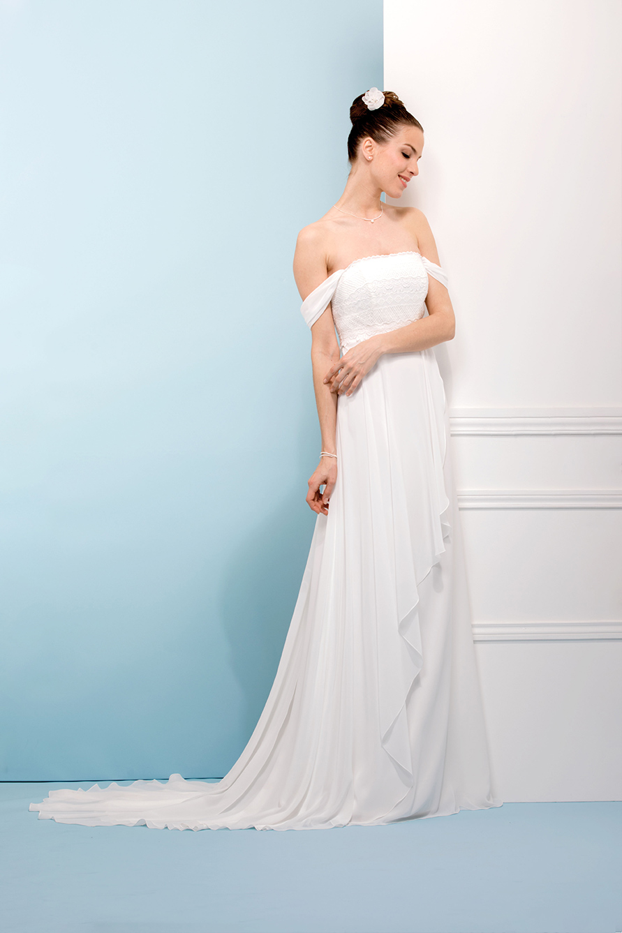 Ce mois-ci, on reste sur des tenues de mariée blanches. Par contre, on se laisse aller sur des petits détails qui attirent l’œil avec un tombé qui magnifie la silhouette.