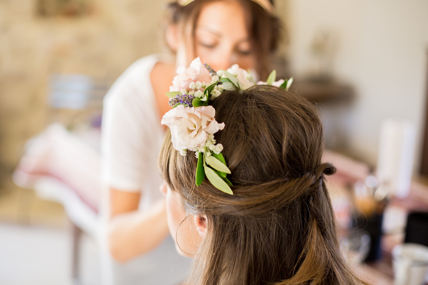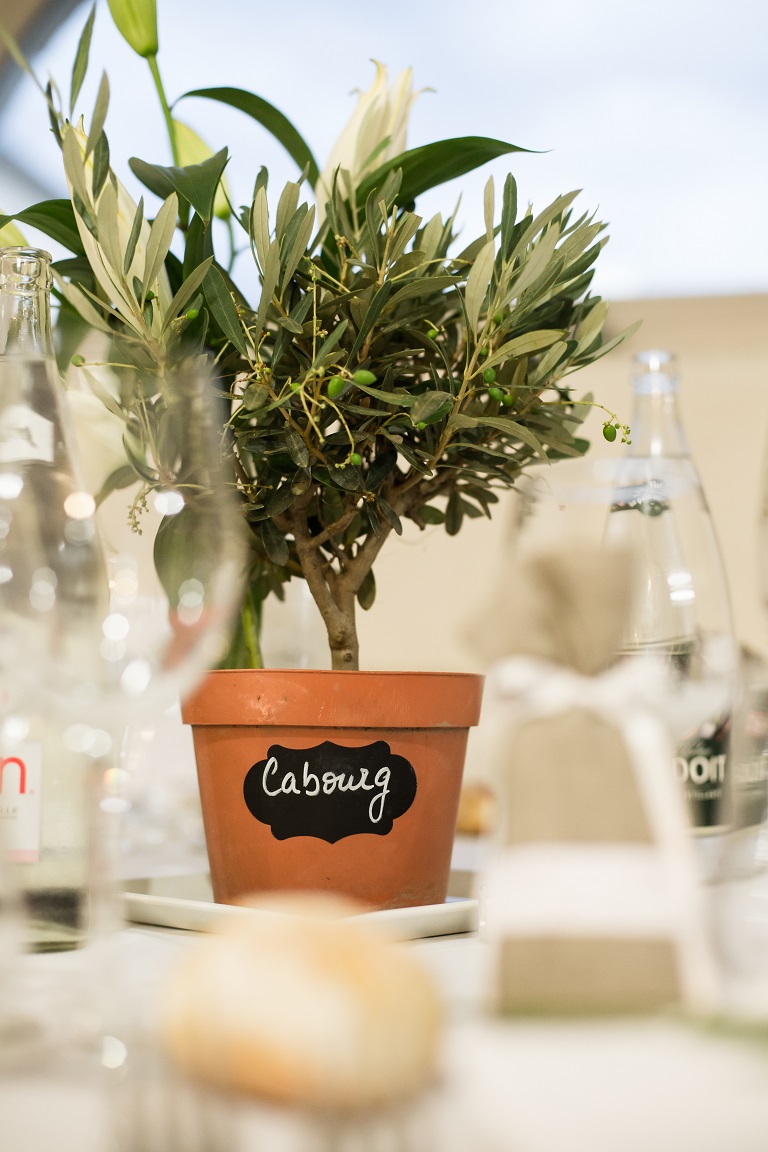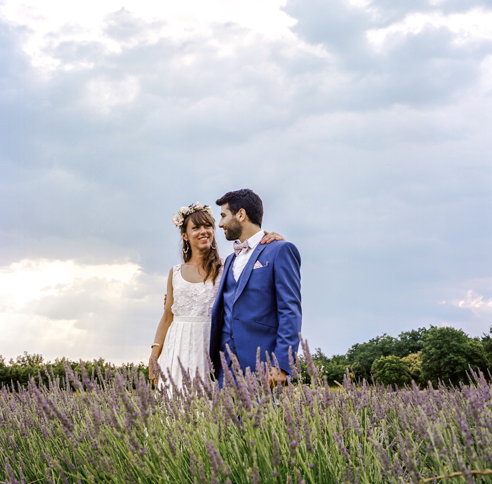 Champêtre chic. Le lieu s’y prêtait puisque nous nous sommes mariés dans un mas provençal, entouré de champs de lavande et d’oliviers. La déco était très naturelle : petits oliviers sur les tables, pots de lavande sur une échelle pour les plans de table, couronnes de vraies fleurs pour les témoins et demoiselles d’honneur, etc.