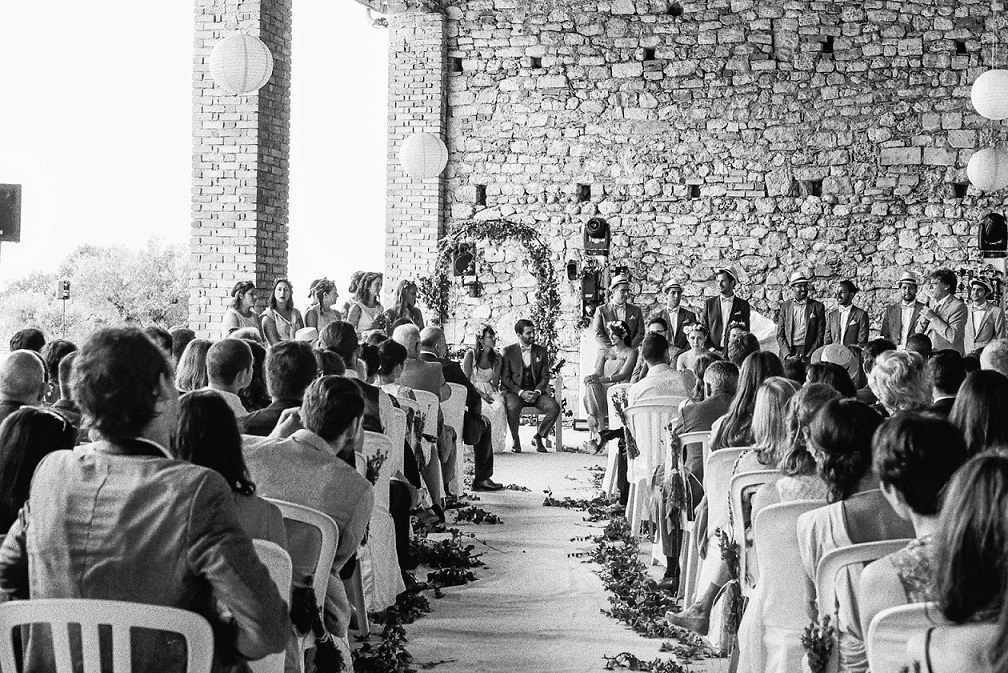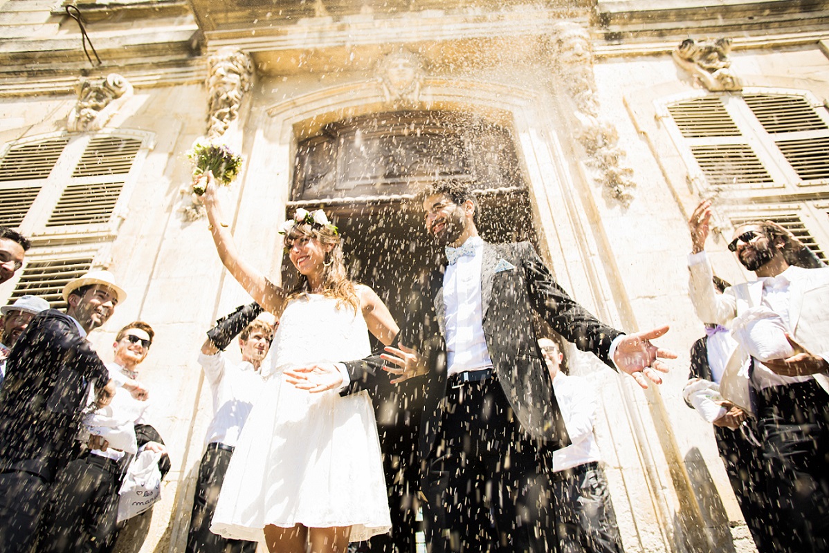 Le mariage devait nous ressembler, être simple, drôle, dans la bonne humeur… pour nous le plus important était d’être entourés des gens que l’on aime. Nous le souhaitions laïc, avec une cérémonie très personnelle. Je ne voulais pas d’une soirée qui passe trop vite. Nous avons donc organisé toute une semaine en Provence avec nos amis et notre famille et celle-ci se clôturait par le mariage, la fête et le brunch.