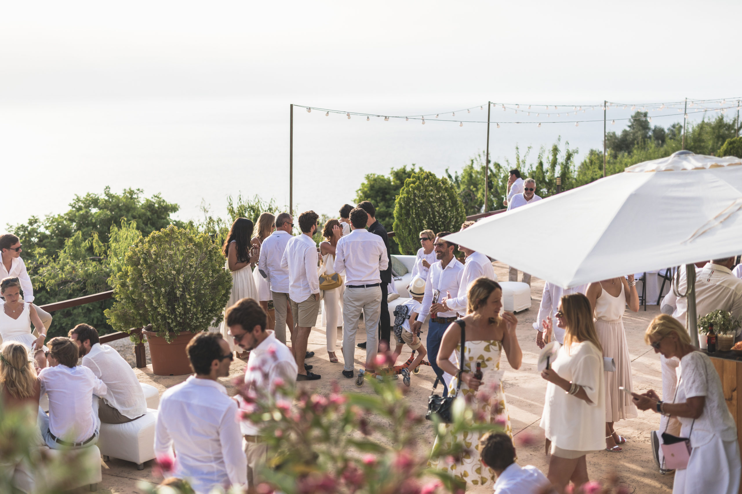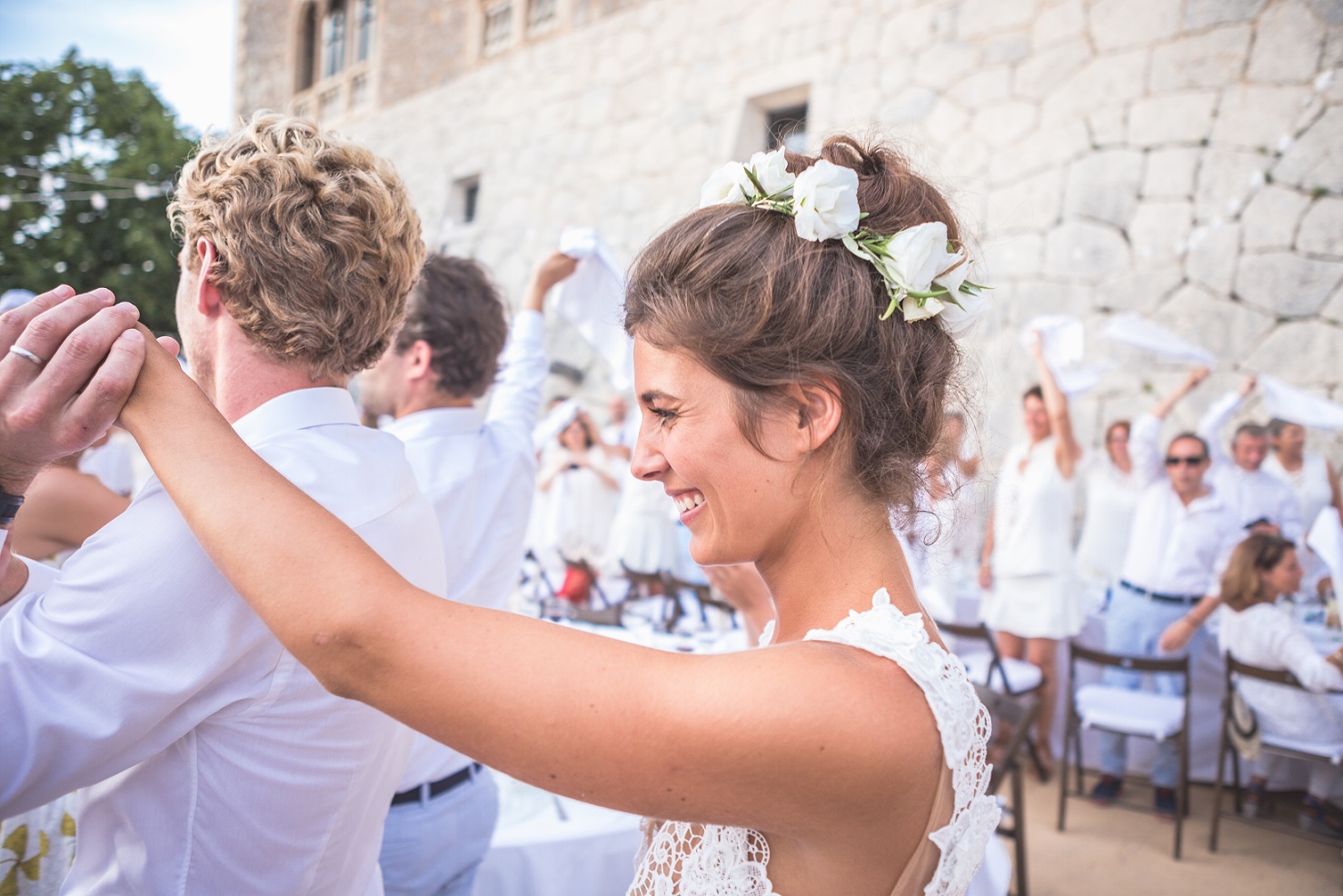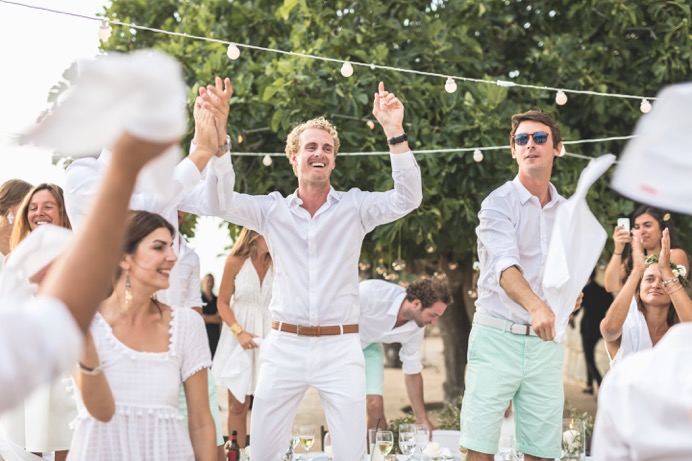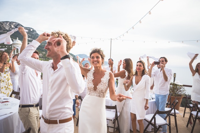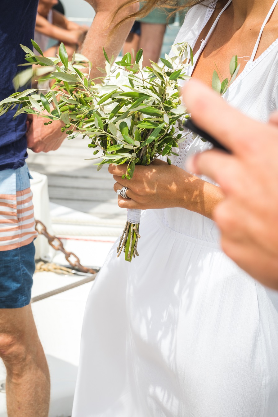 « Tous nos invités étaient en blanc, la décoration était blanche aussi. Les fleurs (pivoines, roses, lisianthus) étaient accompagnées de branchage d’olivier, pour rappeler le Sud et le soleil. »