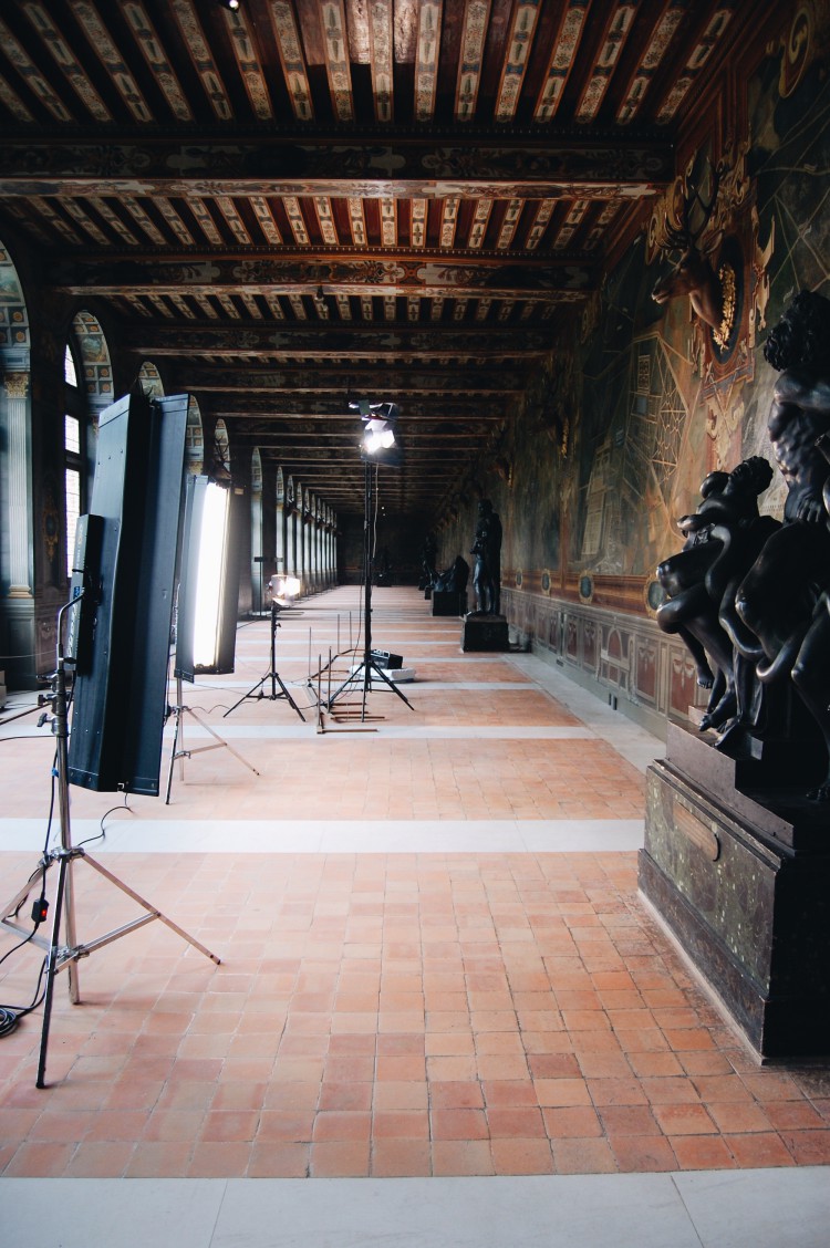 Le second shooting avait lieu dans la galerie des Cerfs, pour un contraste plus marqué avec l’univers masculin/féminin. “Ornée sous Henri IV de vues à vol d’oiseau des châteaux appartenant à la couronne et entourés de leur domaines de chasse, la galerie des Cerfs est en outre scandée de têtes de cerfs en plâtre surmontées de ramures naturelles. Elle abrite depuis les années 1960, les grands antiques du Vatican, moulés par Primatice pour François Ier en Italie, dont les bronzes ont été fondus à Fontainebleau même.” Cette pièce a quelque chose de très onirique et les rayons du soleil en cette fin d’après-midi ont joliment souligné cet effet.
