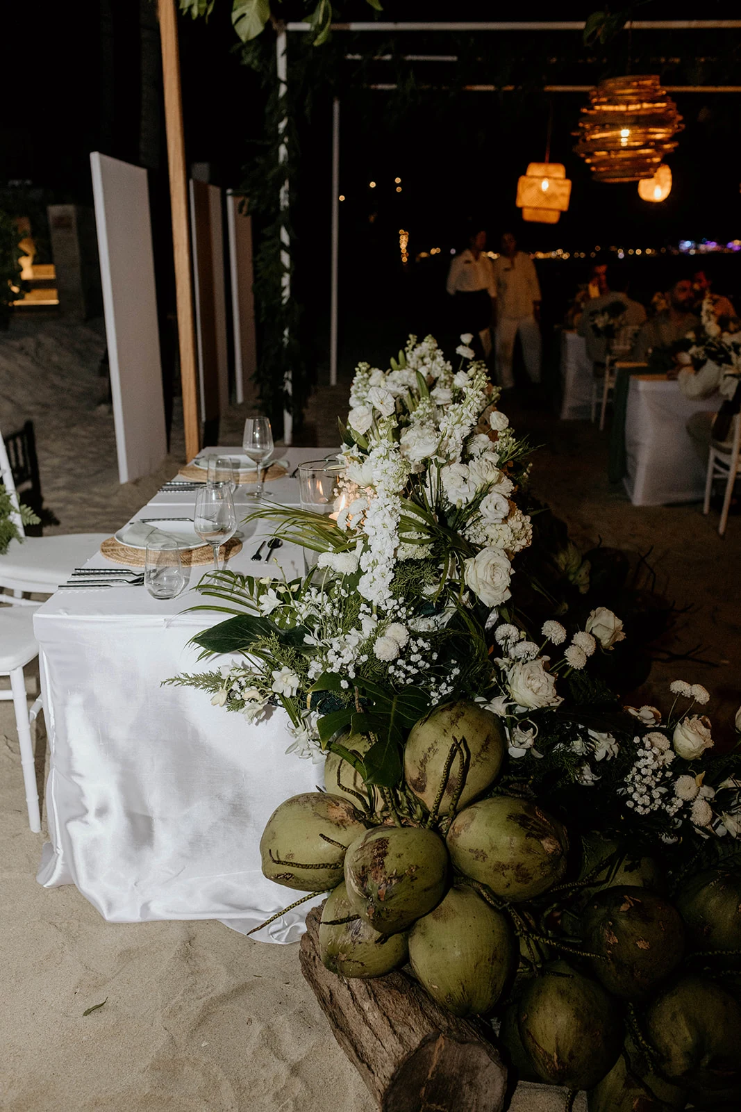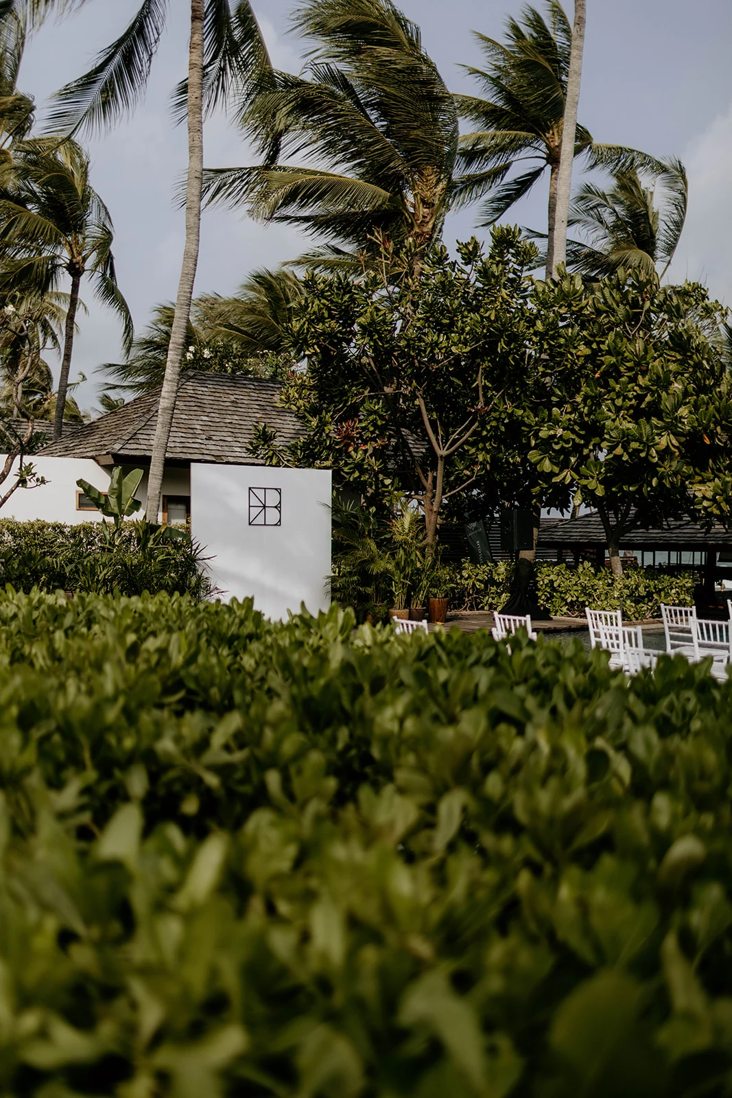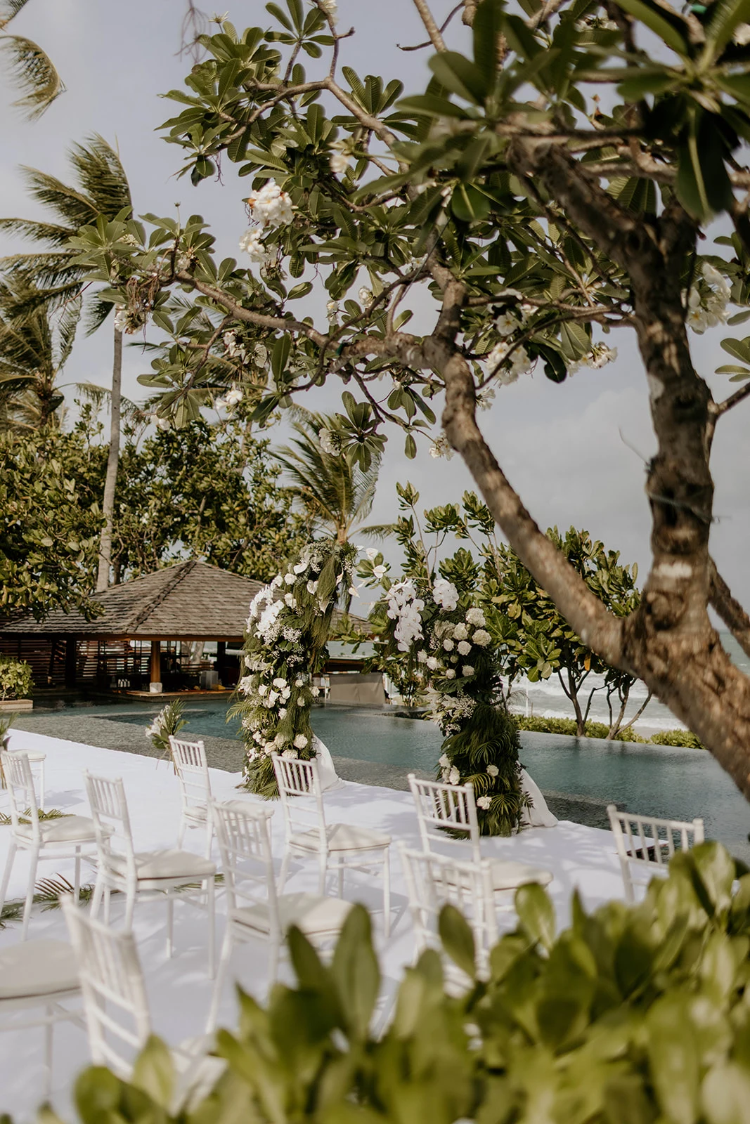 Nous voulions un mariage à la fois festif et chic, en harmonie avec le lieu, avec une décoration végétalisée qui se fonde dans le paysage paradisiaque de l’île de Koh Samui. L’équipe de l’hôtel a parfaitement su comprendre et retranscrire ce que nous avions en tête.