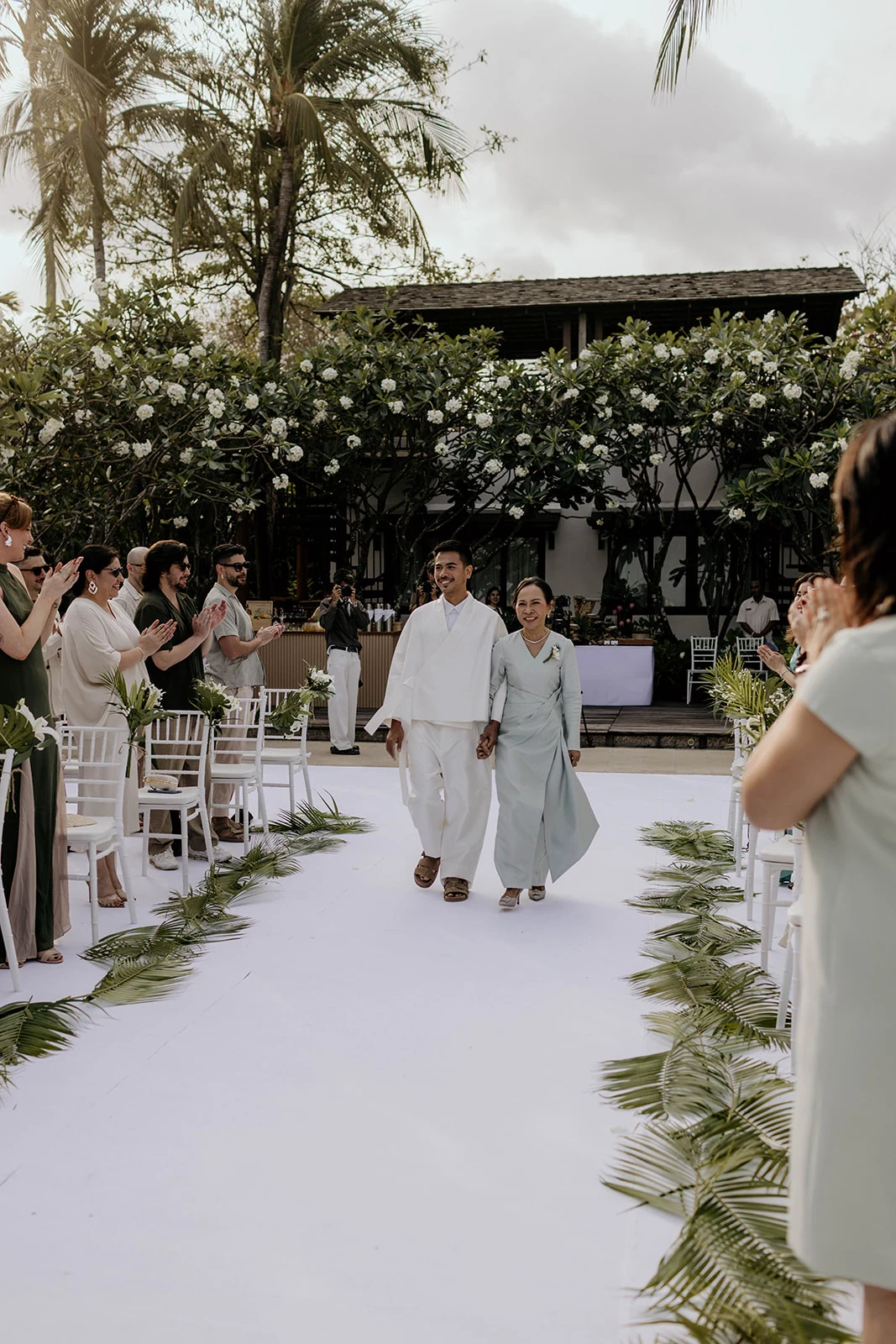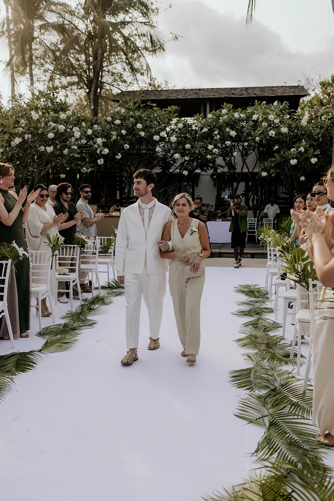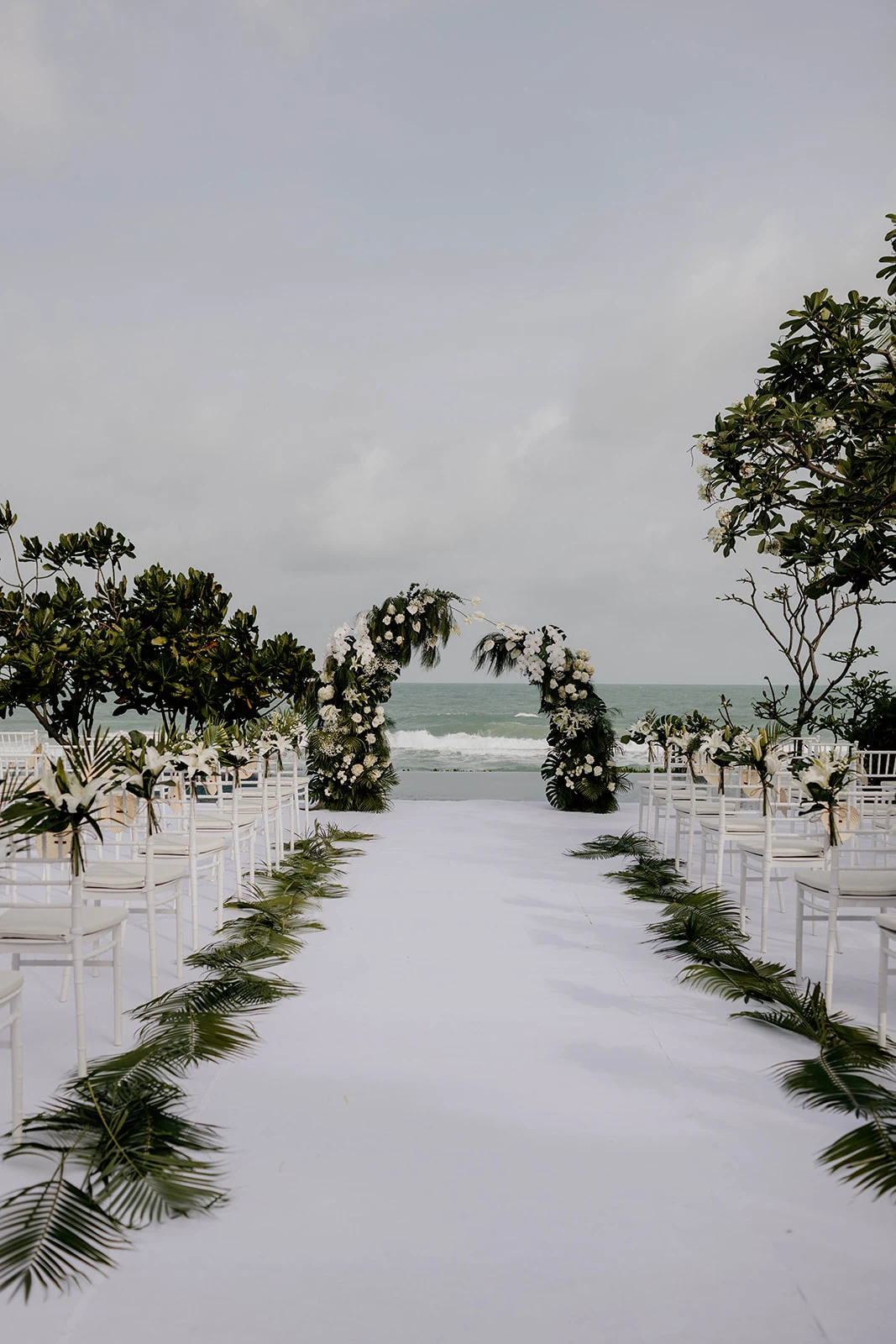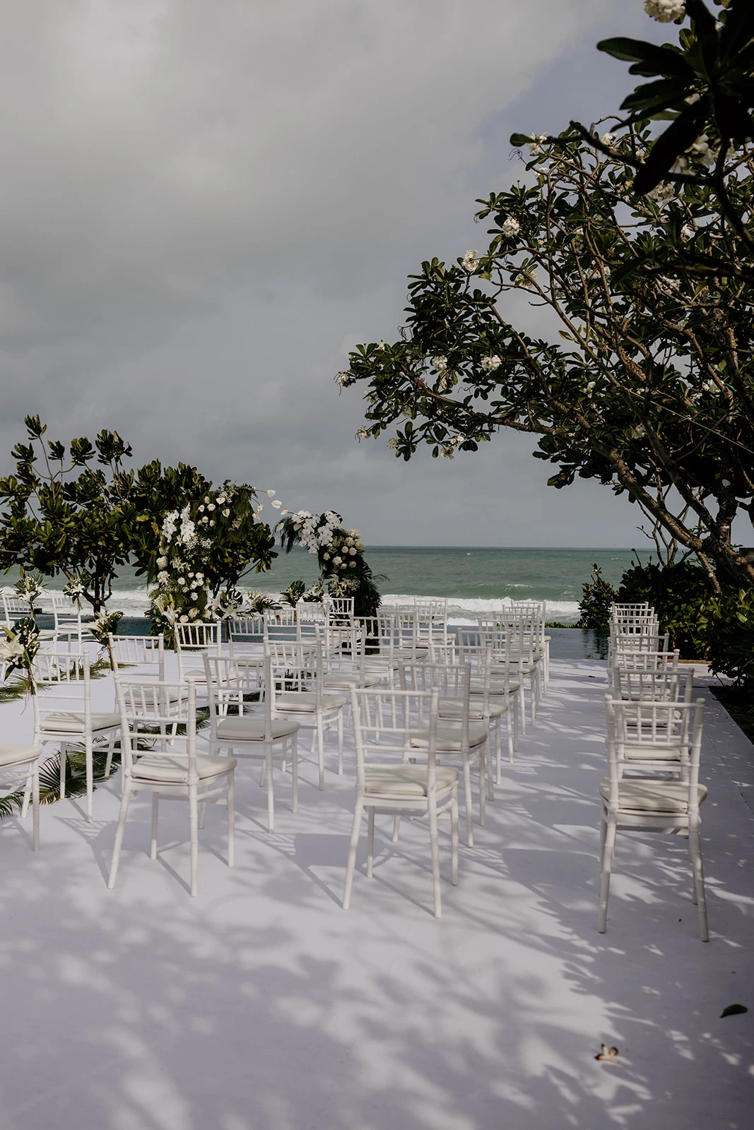 Nous voulions un mariage à la fois festif et chic, en harmonie avec le lieu, avec une décoration végétalisée qui se fonde dans le paysage paradisiaque de l’île de Koh Samui. L’équipe de l’hôtel a parfaitement su comprendre et retranscrire ce que nous avions en tête.