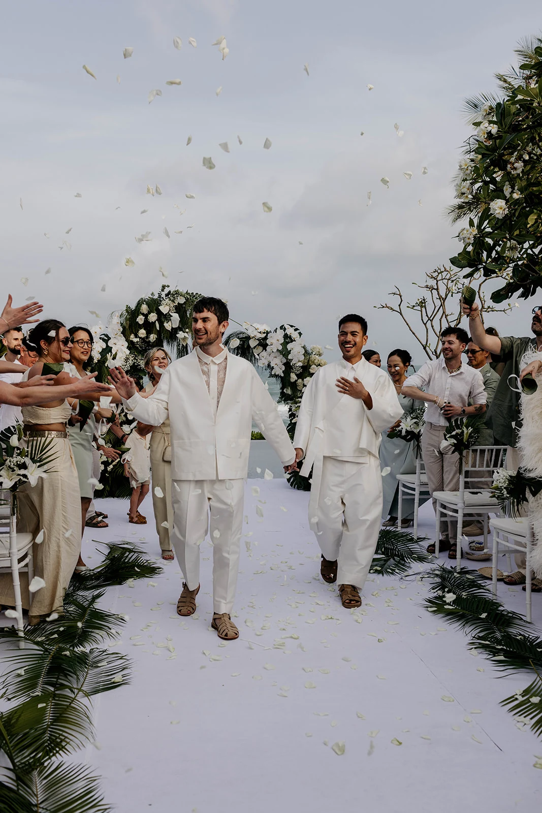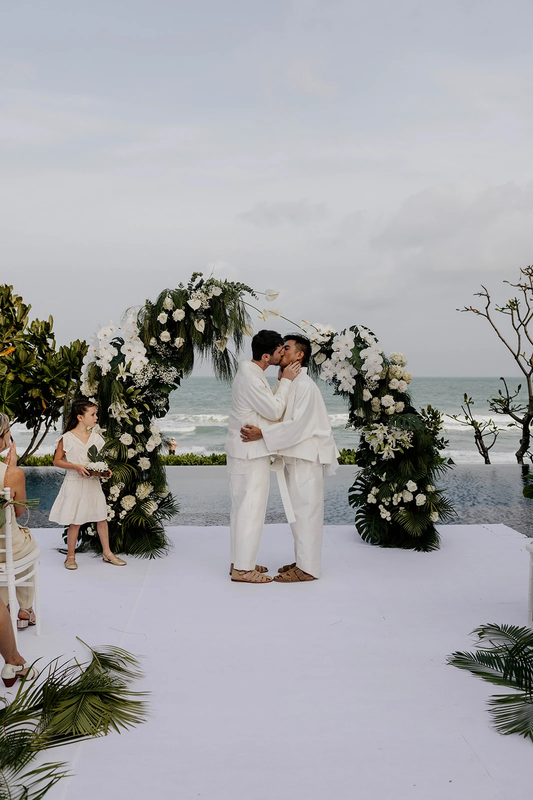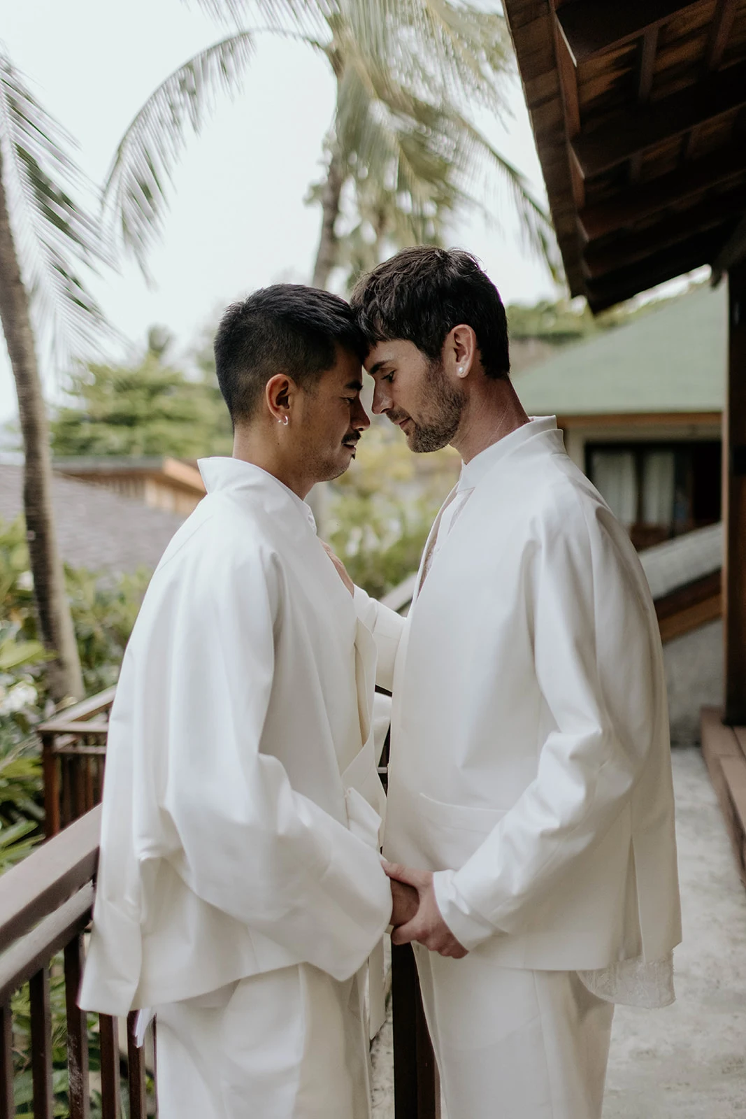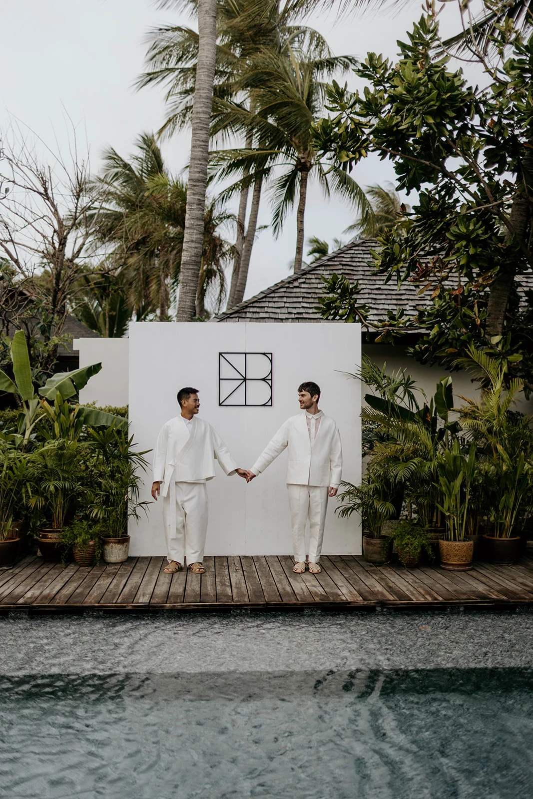 De notre côté, nous avons organisé un cocktail de bienvenue dans un restaurant cosy sur les hauteurs de Koh Samui, avec une vue panoramique sur l’ensemble de l’île. Le lendemain du mariage, nous avons également privatisé la piscine de l’hôtel pour une pool party avec nos invités, et quelques drag queens pour le fun.