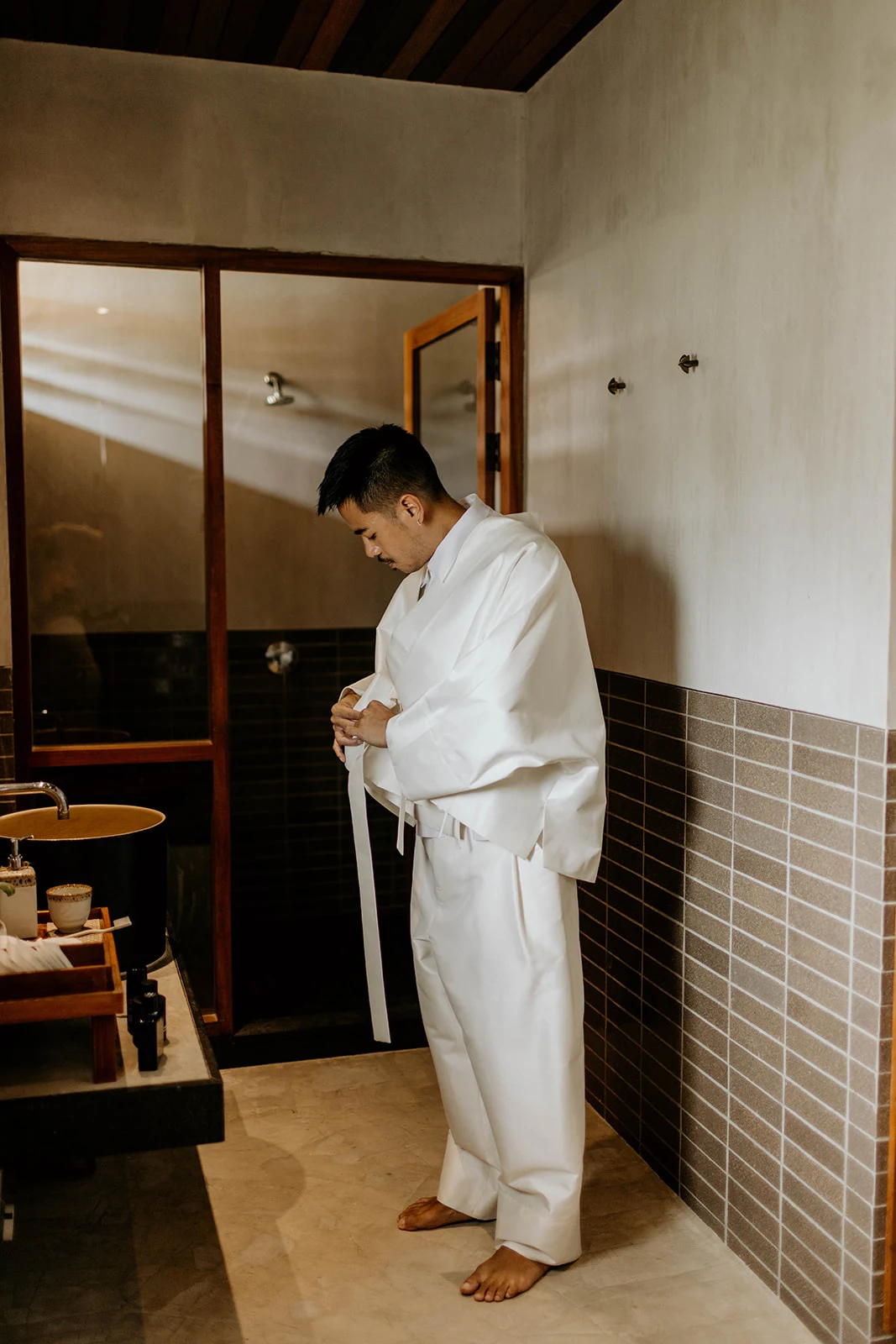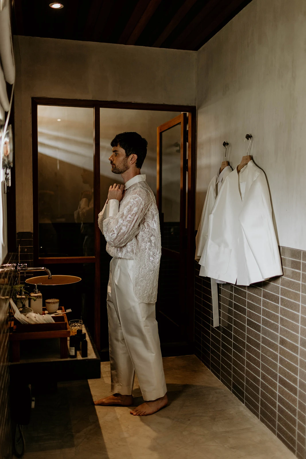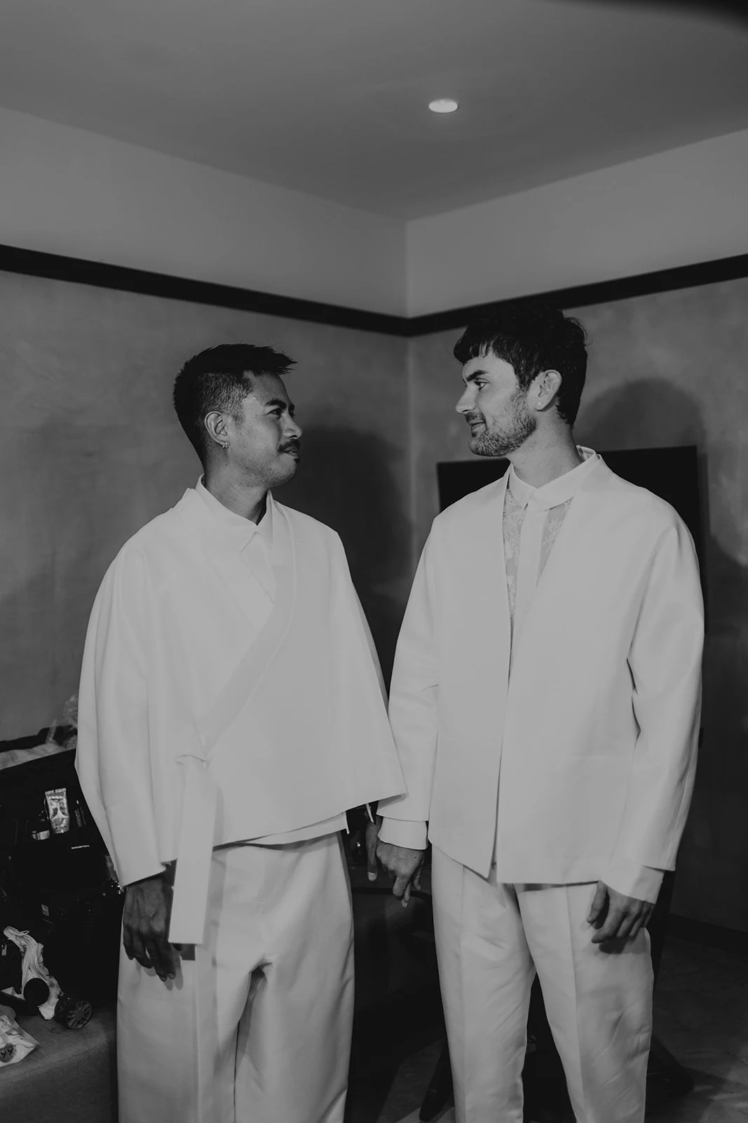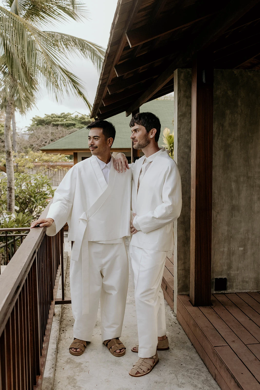 Nos tenues ont été conçues par Por, créateur de la maison de couture House of Faithe à Bangkok. Nous voulions des tenues blanches, faites de matériaux locaux, par un designer local, et surtout fidèles à la personnalité de chacun : inspirées de traditions thaï pour Krit, et avec une French touch pour moi.