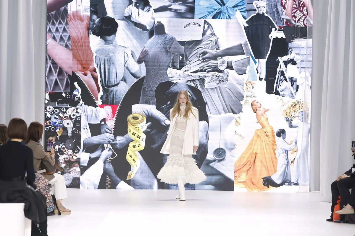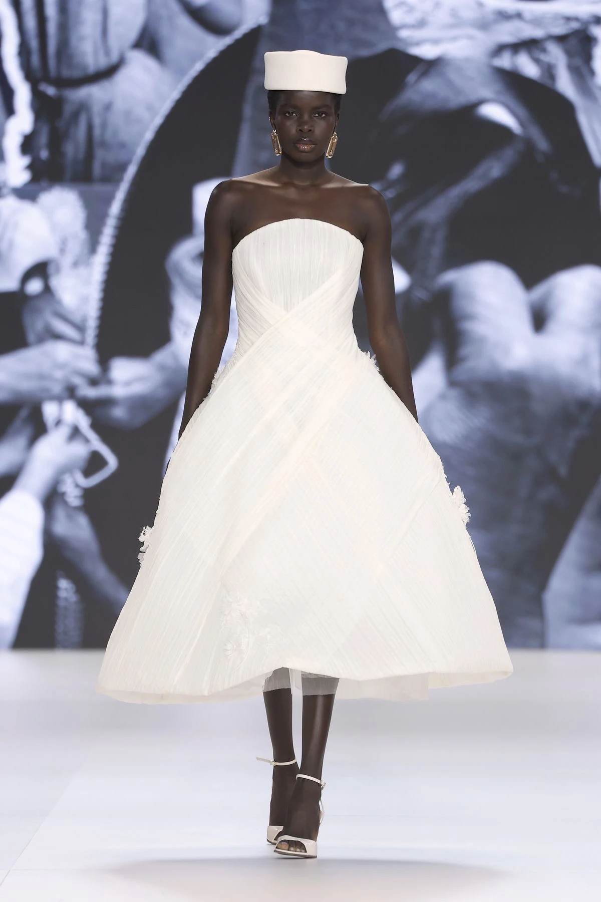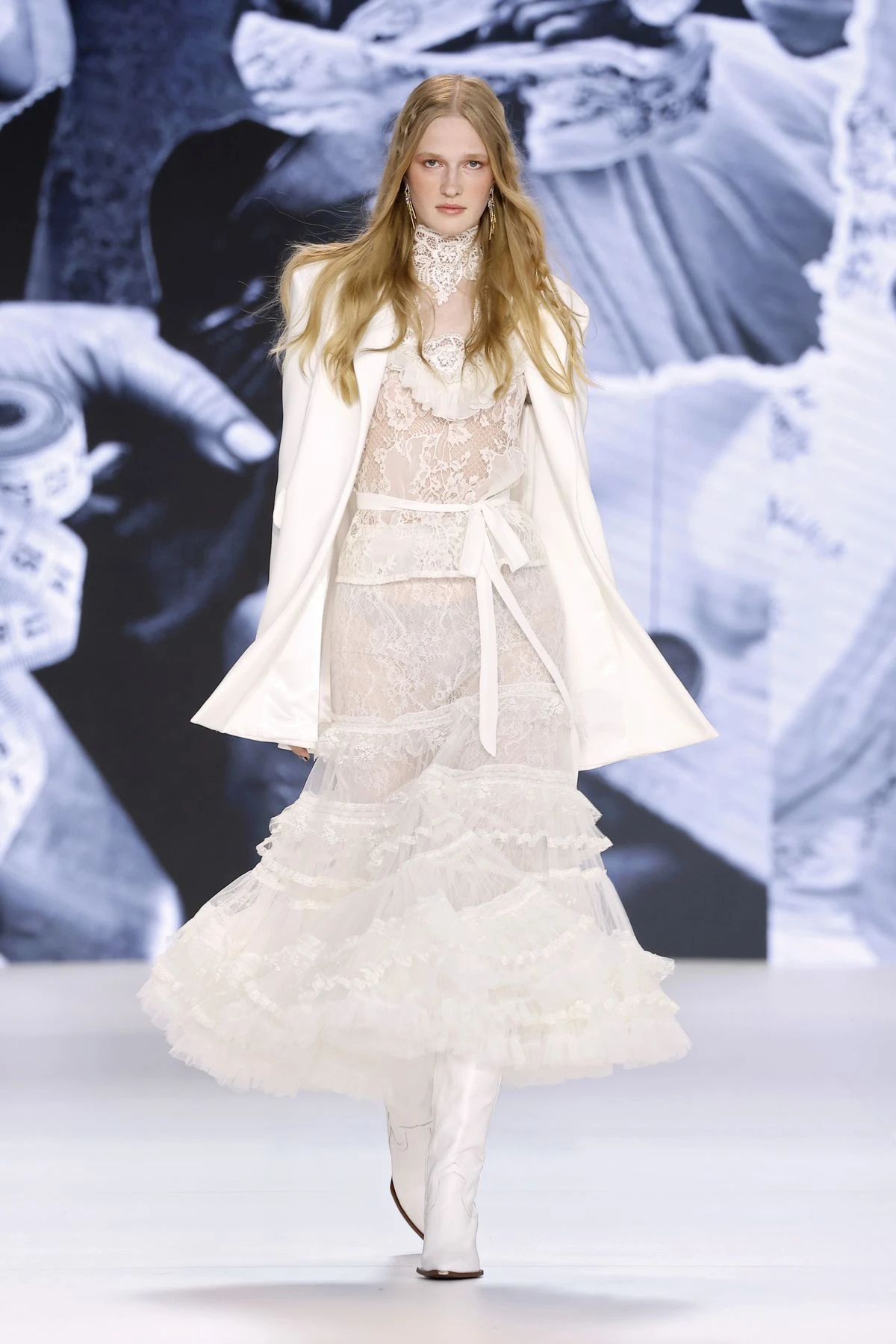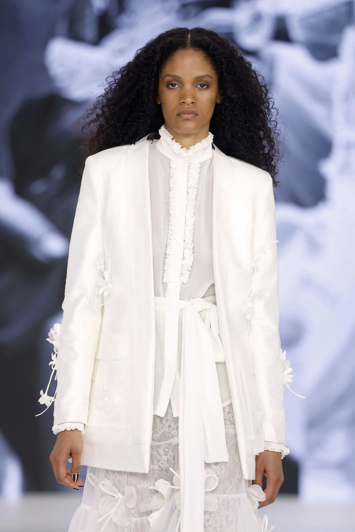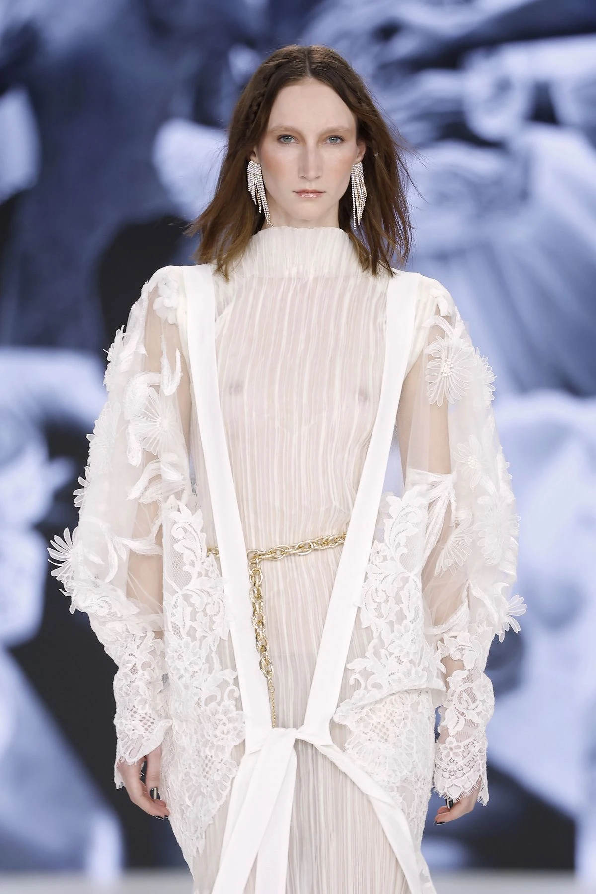 Le défilé a également mis en lumière une maîtrise exceptionnelle des plissés. Qu’ils soient réalisés dans des matières souples ou directement dans la dentelle, ils apportent un relief et un mouvement permanent aux silhouettes.