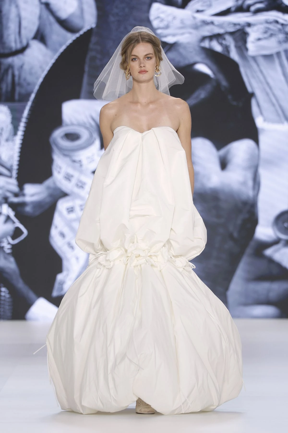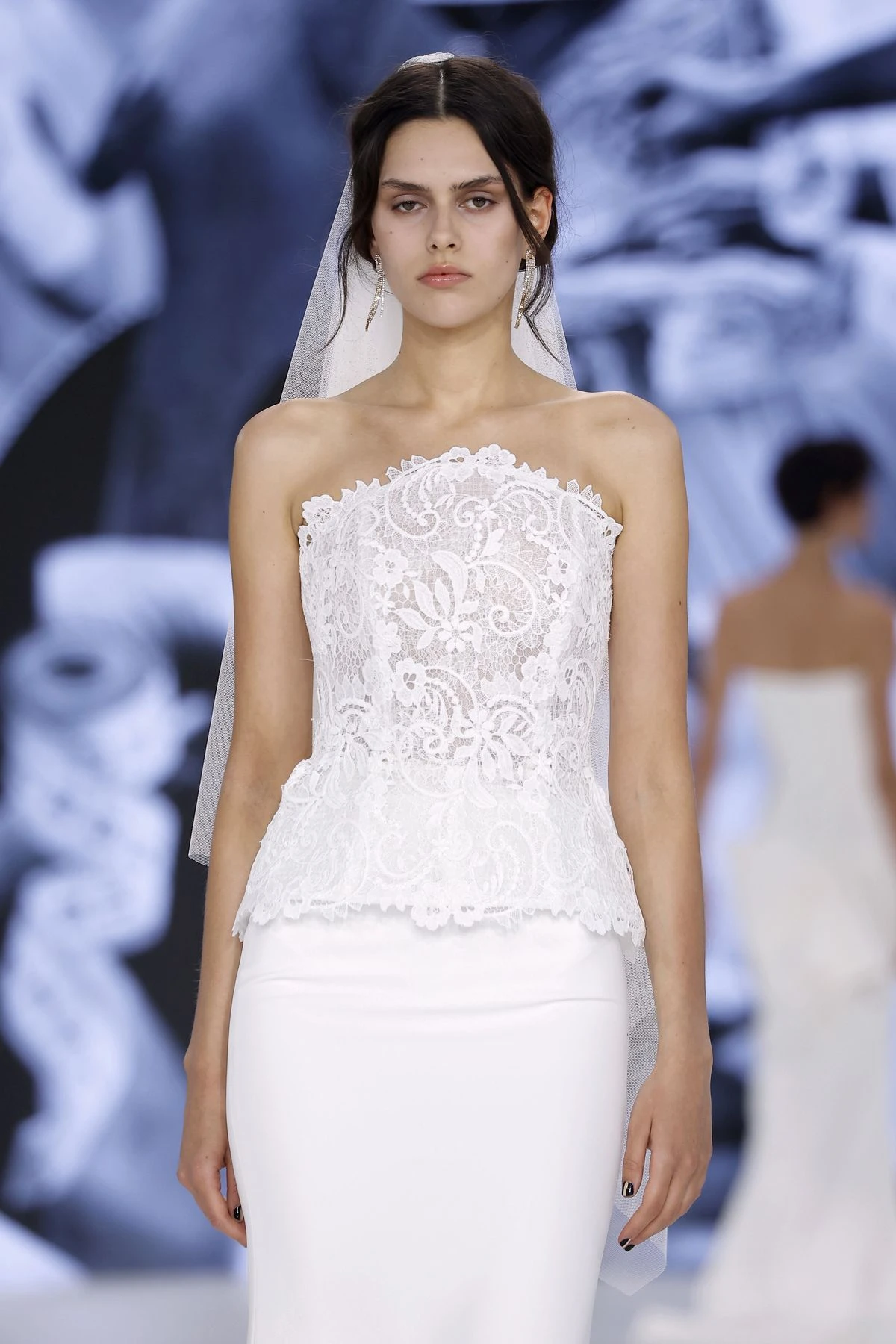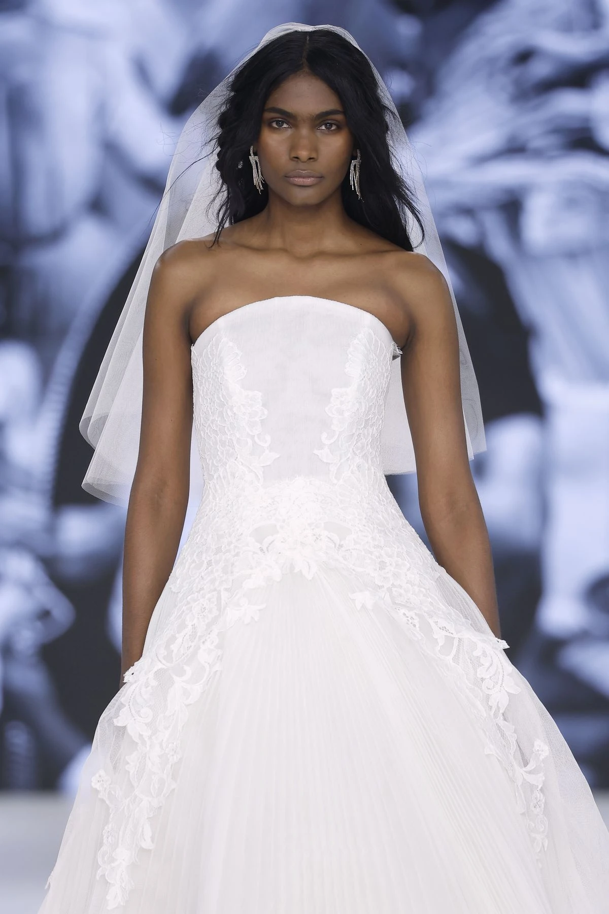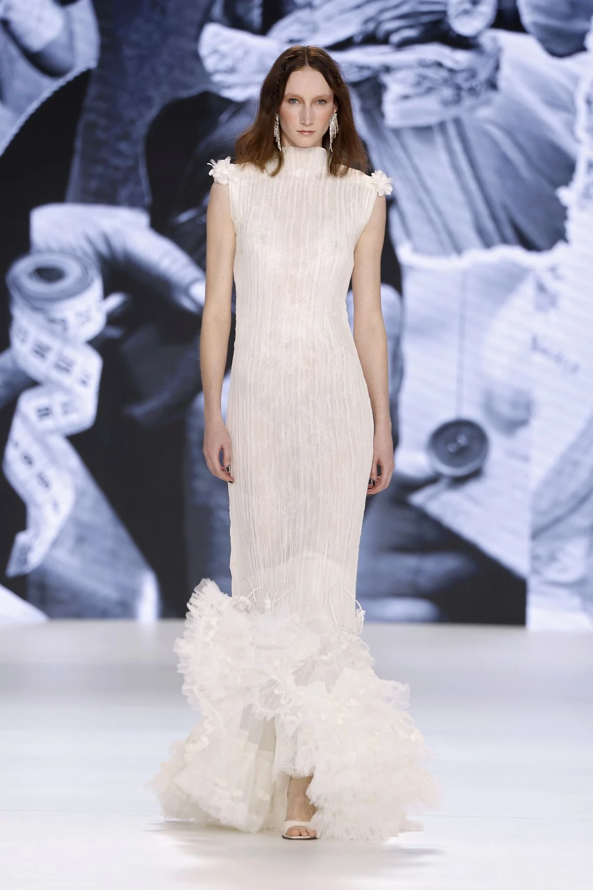 Le show Yolan Cris s’est ouvert sur une note électrique : une silhouette blanche structurée par des jeux de lacets apparents et une veste de caractère. Le ton était donné. Loin de s’enfermer dans un style unique, la collection déploie une amplitude rare. On y croise des longueurs midi audacieuses, des robes sirène sculpturales, mais aussi des volumes princesse et des traînes cathédrales vertigineuses. Cette vision plurielle célèbre une mariée libre, capable de naviguer entre le romantisme bohème et une esthétique plus radicale.