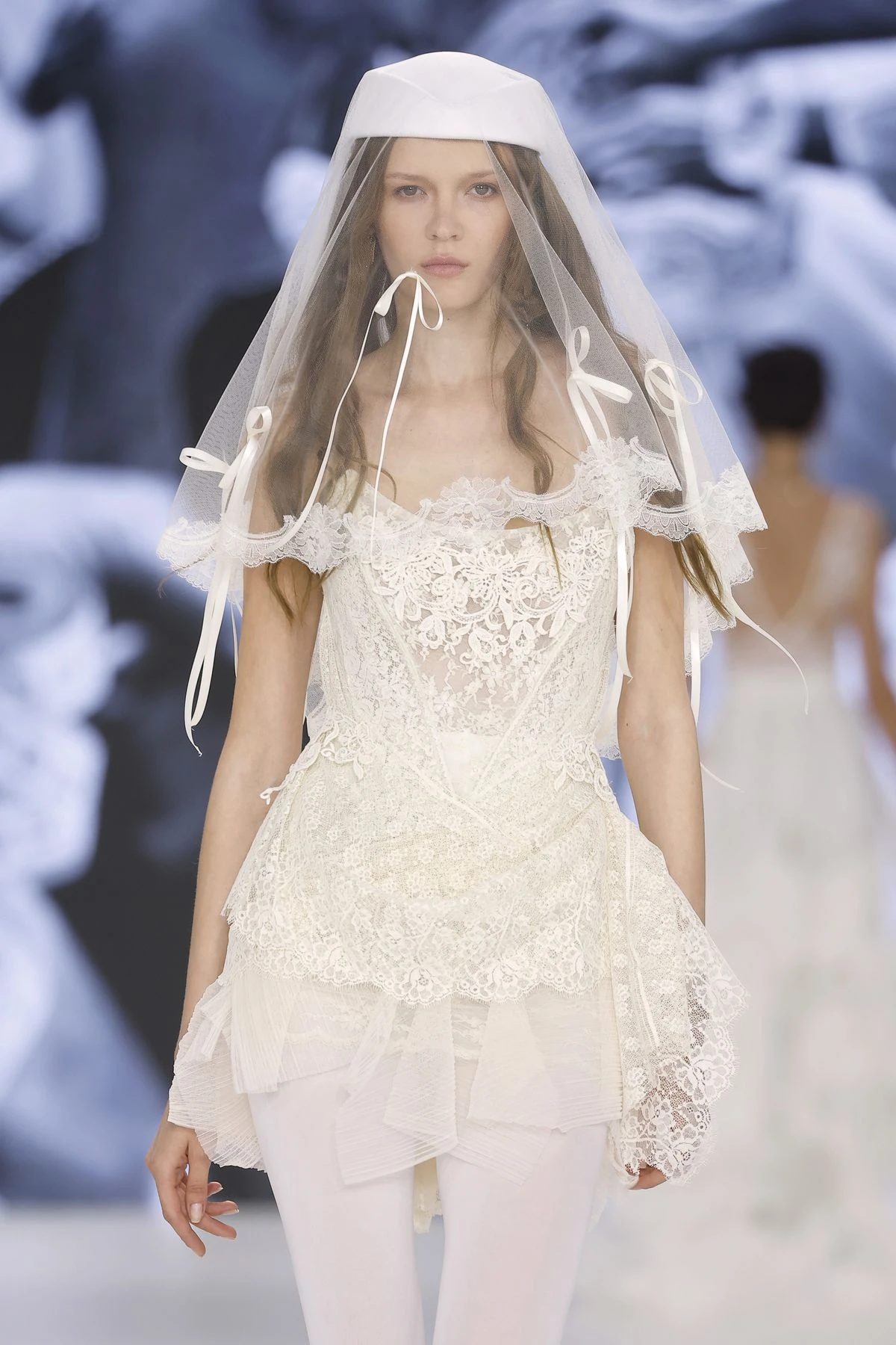 L’un des piliers de cette collection est sans conteste le travail du corset. Revisité avec une touche subtilement gothique, il devient un véritable objet de design. Grâce à des laçages complexes et des constructions millimétrées, ces bustiers parfaitement coupés sculptent le corps tout en modernité. La dentelle, omniprésente et travaillée avec une finesse extrême, vient sublimer ces pièces maîtresses, prouvant une nouvelle fois le savoir-faire artisanal de la maison.