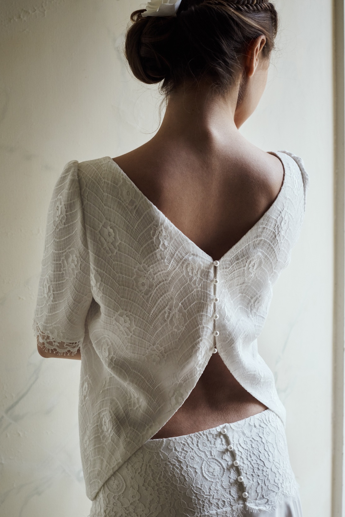 Comme en témoignent le parcours et les inspirations de la jeune femme, la découverte de ses pièces et de ses collections semble nous plonger tout droit dans un conte onirique. Son attachement si particulier aux costumes de scène se ressent dans certaines de ses créations. Mathilde prend soin de faire pétiller celles-ci en proposant à ses clientes de piocher des détails et de les intégrer sur ses modèles. Plastron d’un chemisier, belles soieries, galons sortis des greniers, … reprennent vie pour habiller ce jour exceptionnel. Mathilde les fait virevolter, les assemble, les combine à des pièces inspirées du vestiaire de tous les jours avec un brin d’humour et beaucoup de tendresse. Les styles et les époques se mélangent au gré des créations. Les pièces sont à la fois très modernes et marquées par un détail qui donnera toute son originalité à la robe.