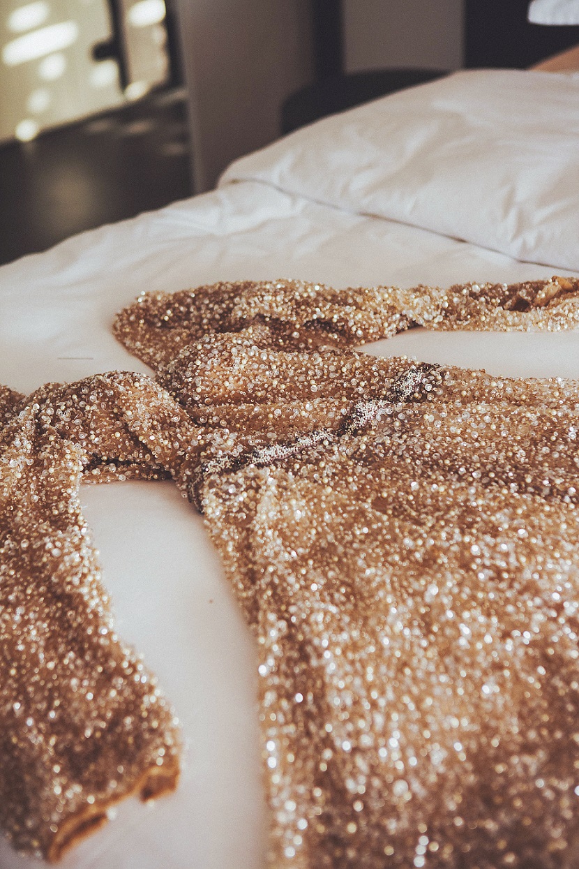 Céline : Je souhaitais une robe magique, sensuelle, peut-être même voluptueuse, je voulais que les yeux de David brillent. Nous allions être sur une plage à Mykonos, alors tout était possible. J’ai donc tout de suite pensé à Elise Martimort pour la confection. C’est une créatrice de talent que je connaissais. Elle possède cette folie créatrice que j’adore. Ce projet était un peu fou et il n’y avait qu’elle pour le réaliser.