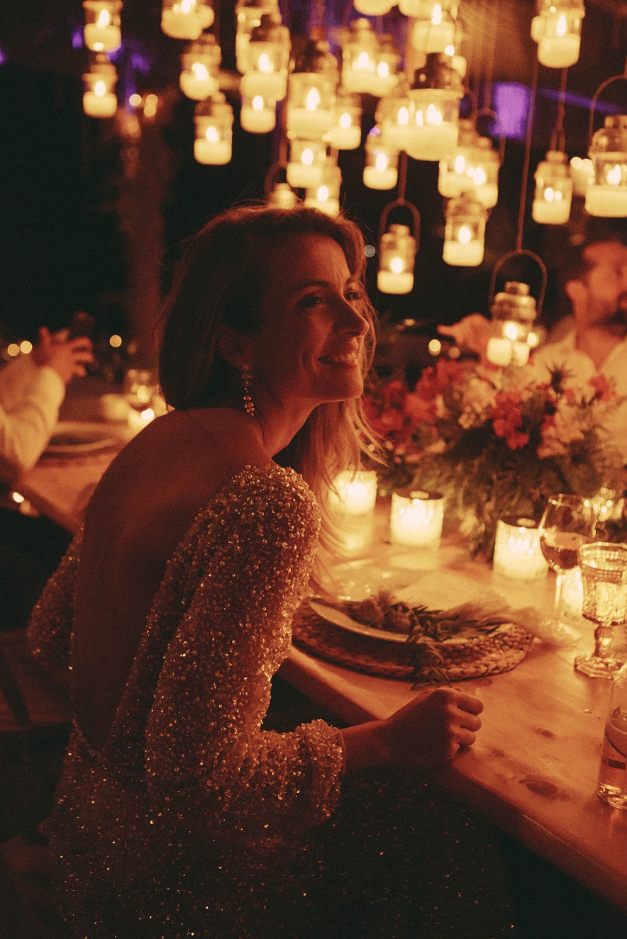 Céline : Mykonos étant le lieu choisi pour la cérémonie, nous souhaitions simplement que cela lui ressemble, les yeux tournés vers la mer, la beauté brute des plages, un savant mélange entre design et authenticité. Comme nous savions que la magie des lieux opérerait sur nos familles et amis, nous leur avons simplement conseillé de s’habiller de lin ou de coton léger afin de ne pas avoir trop chaud. Notre wedding planner m’a simplement demandé de créer un tableau pinterest de ce que je souhaitais : j’y avais placé des tapis, des bouquets de bougainvilliers, des braseros, un groupe folklorique grec …