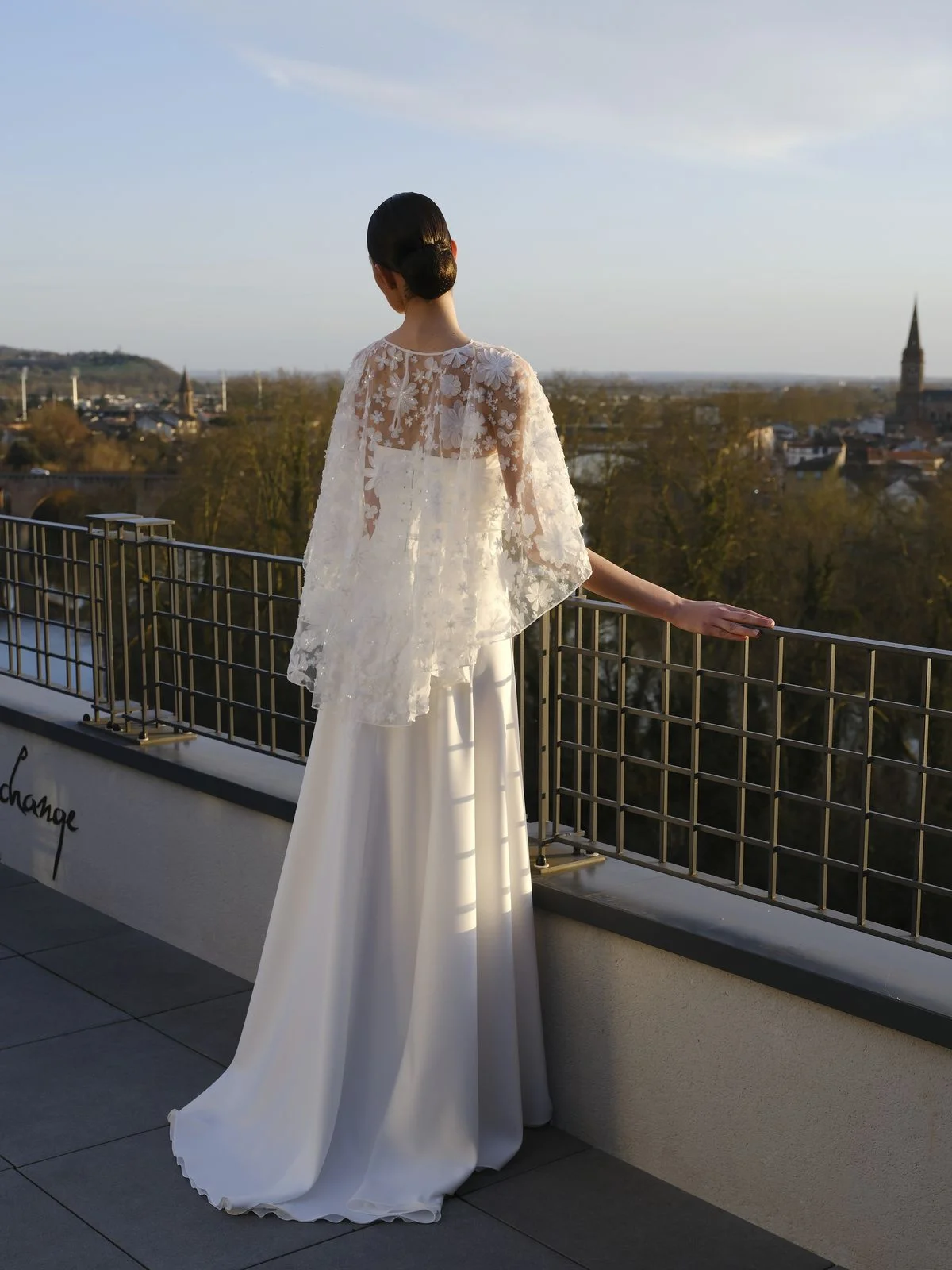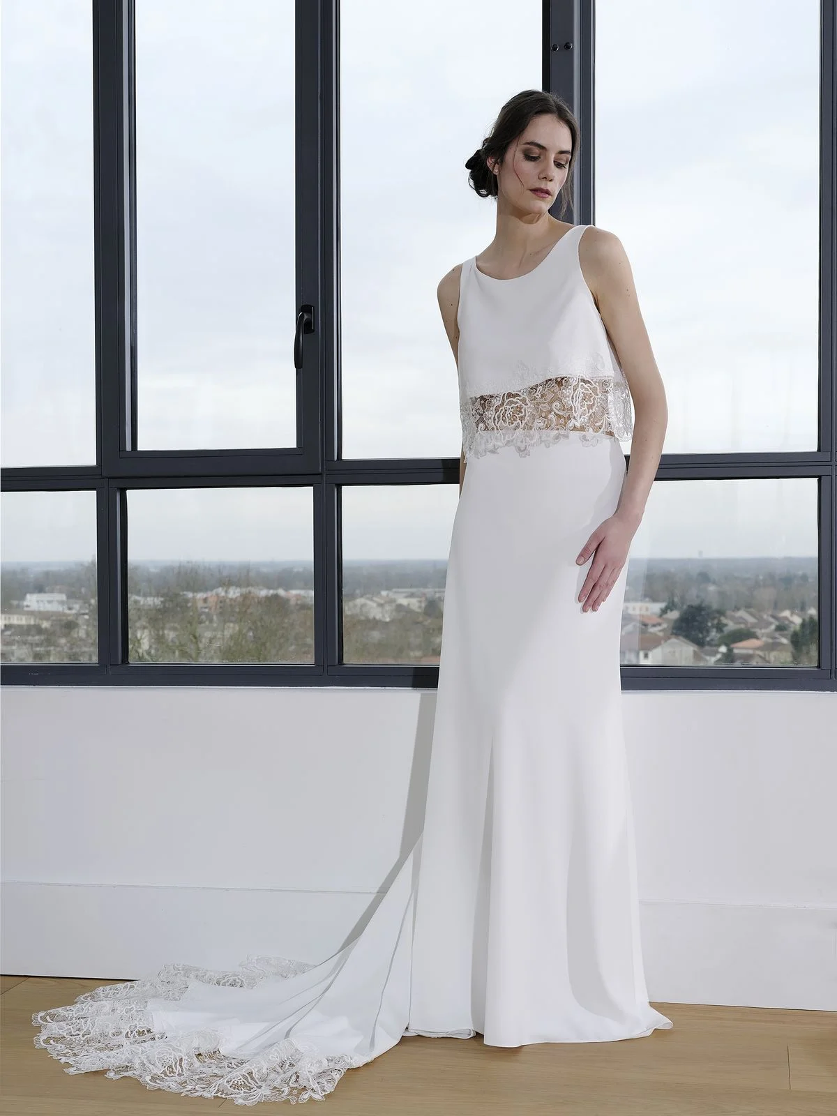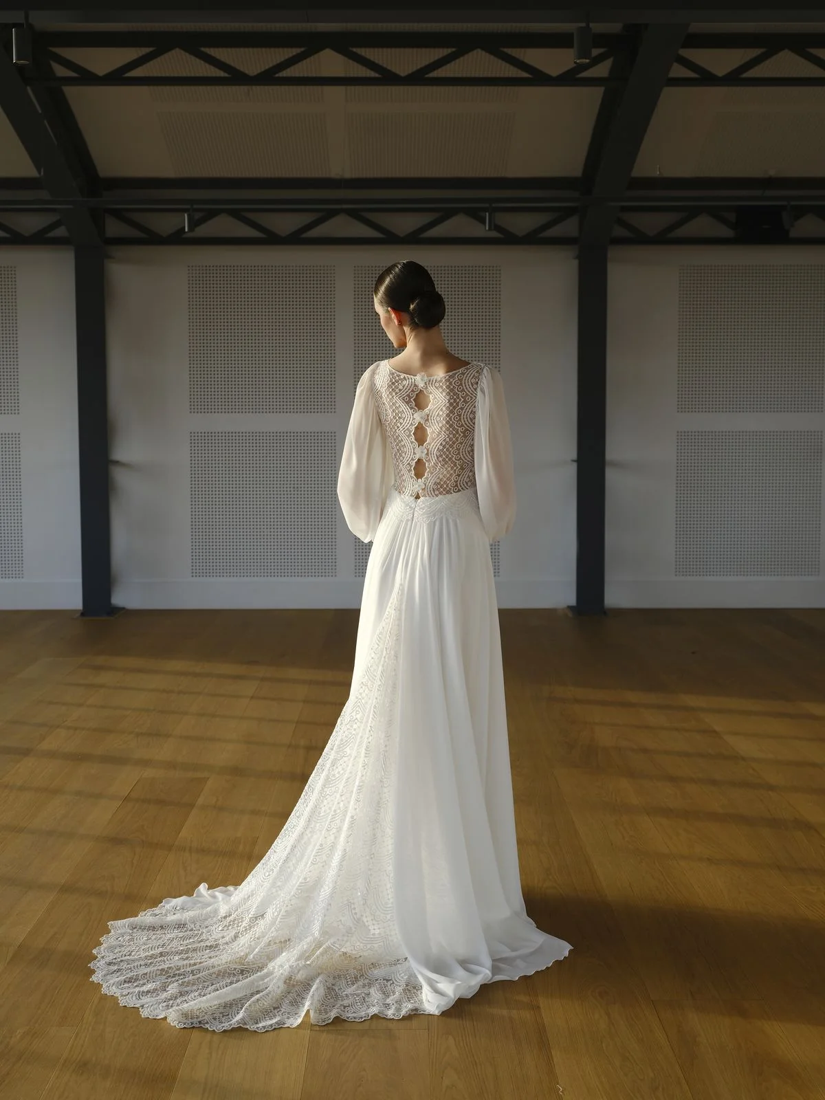 Les matières ont été choisies avec soin : tulle, mousseline, crêpe ou encore mikado de soie composent des créations au tombé impeccable. Les tissus structurés offrent une présence majestueuse, tandis que les options plus fluides apportent un mouvement naturel et gracieux. Enfin, la dentelle de Calais, véritable signature de la maison, vient sublimer bustiers, manches et dos délicatement travaillés. Indémodable, elle incarne le charme et l’héritage de Créations Bochet tout en mettant en valeur chaque silhouette.