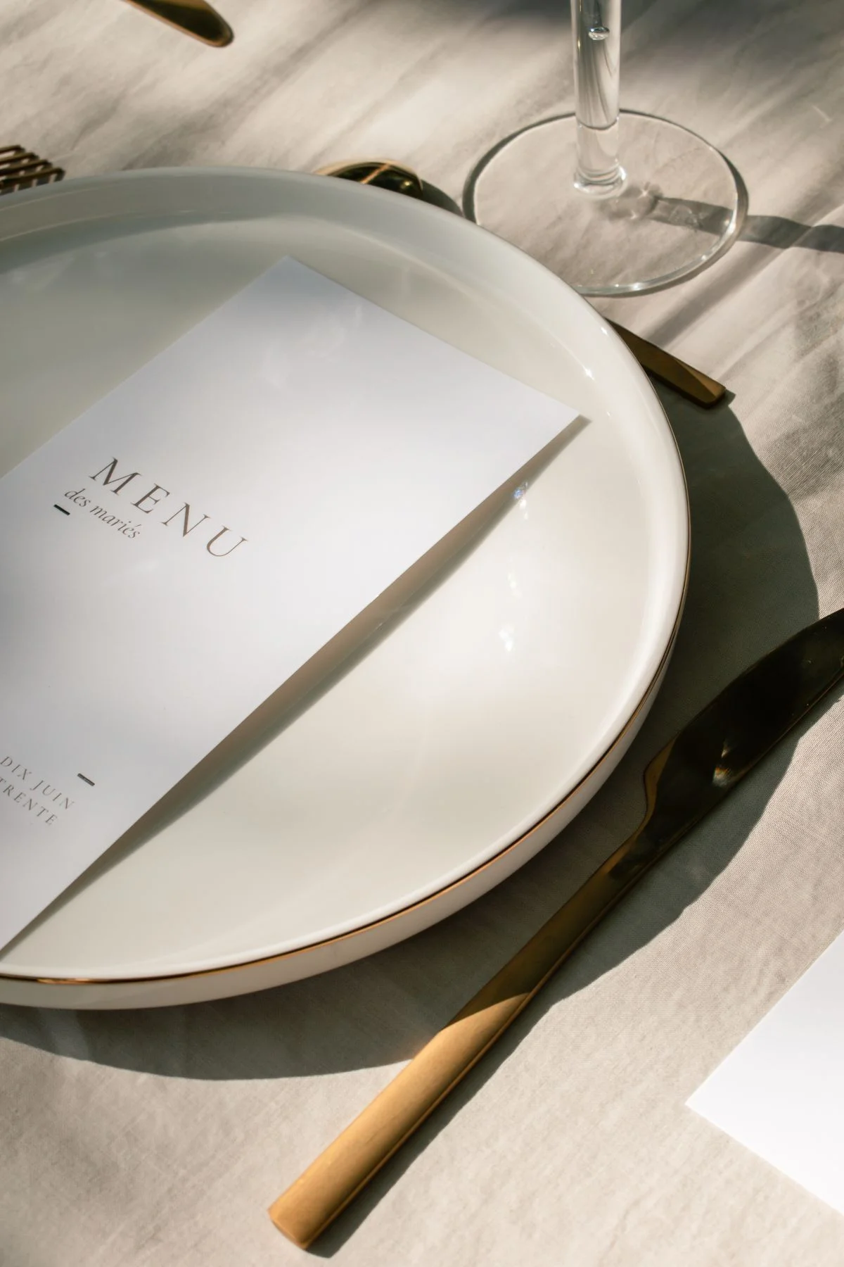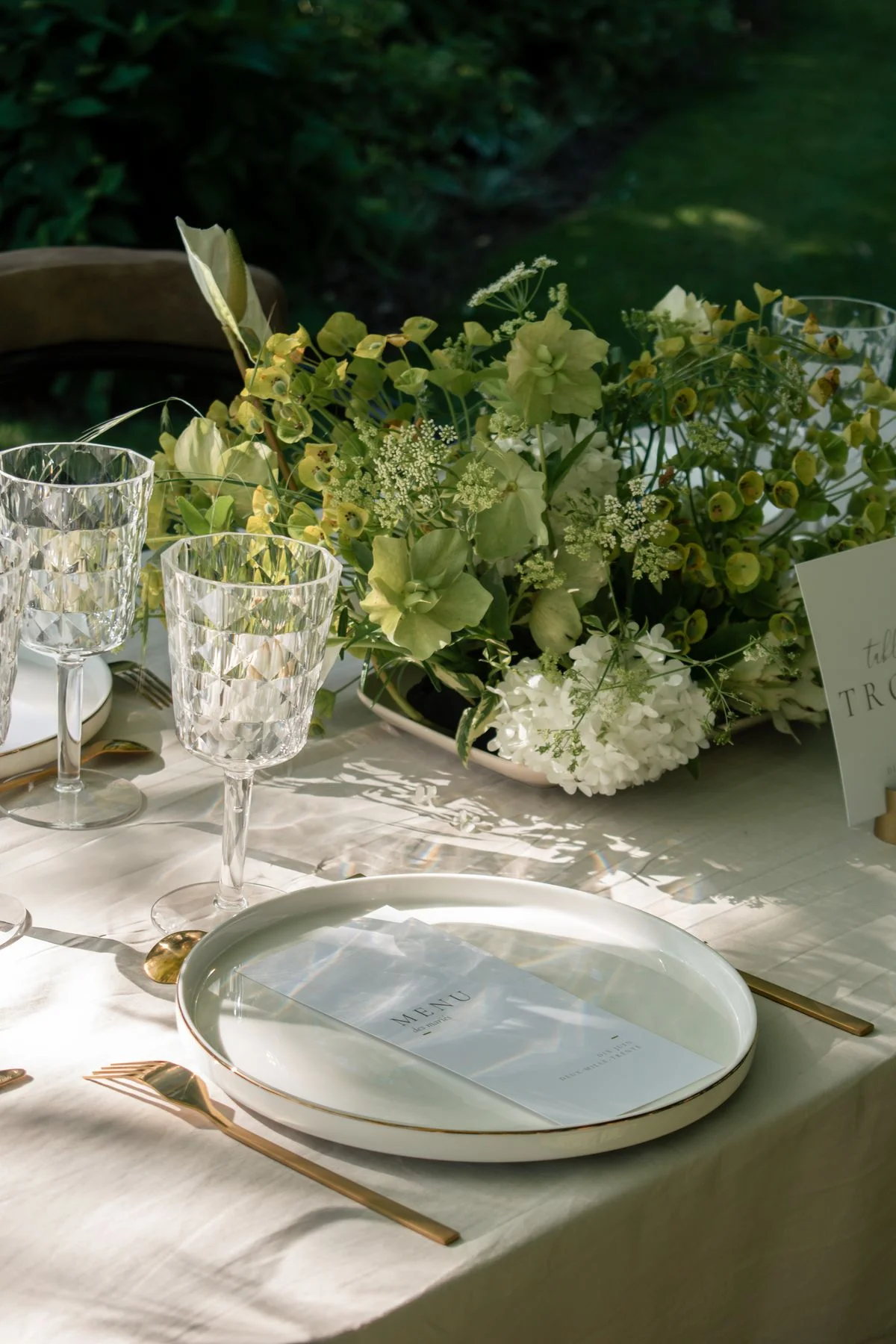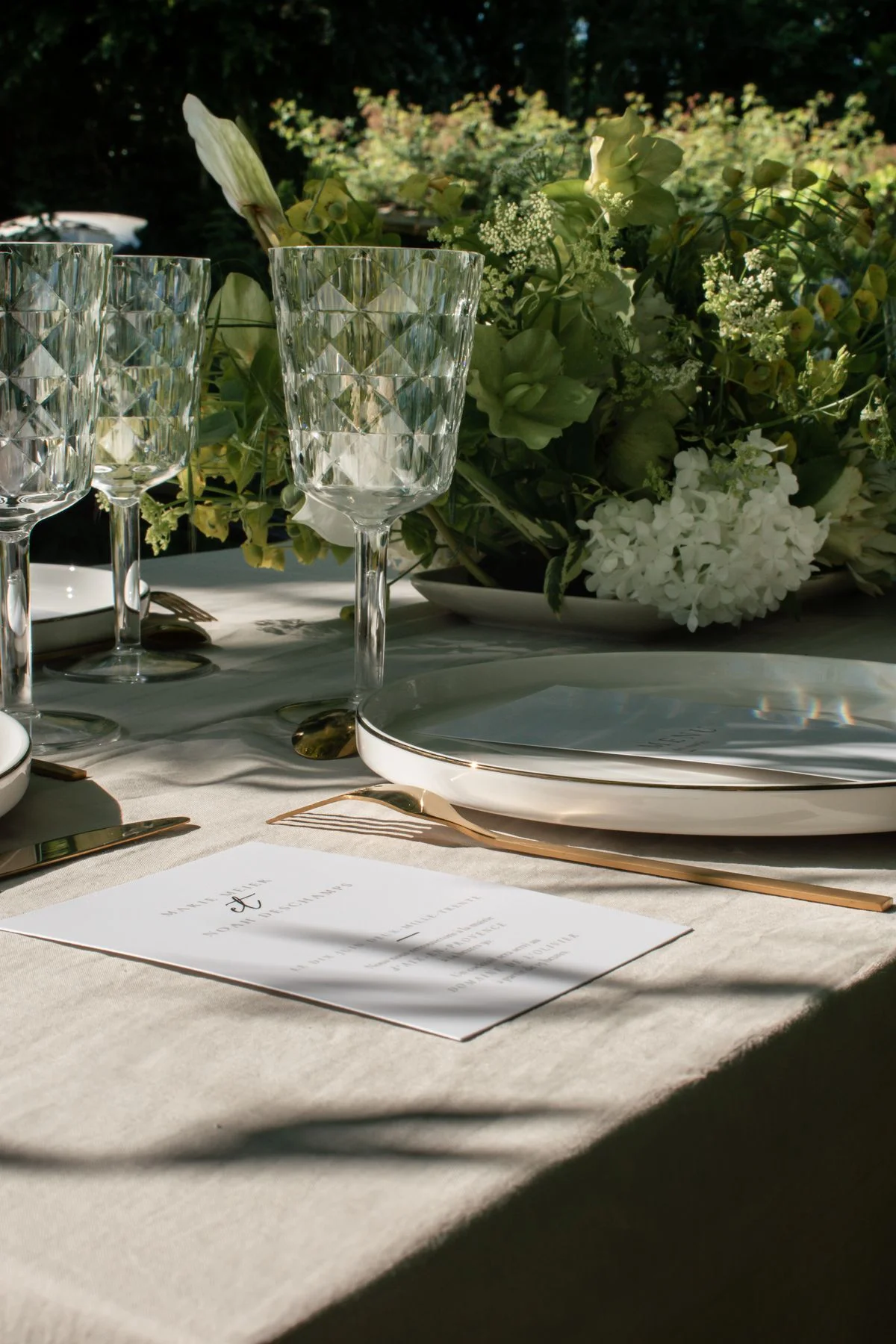 Le décor repose sur une palette délicate, dominée par des nuances de beige, de blanc et de vert. Le linge de table, volontairement neutre, sert de toile de fond à une vaisselle aux lignes épurées et à des couverts dorés qui apportent une note délicatement sophistiquée. Les verres ciselés, eux, introduisent un jeu de transparences qui capte la lumière et renforce l’effet de finesse générale.