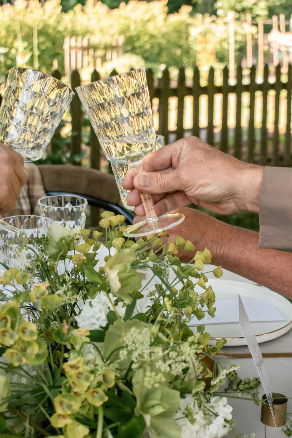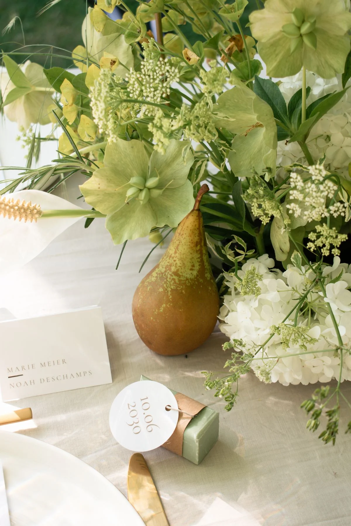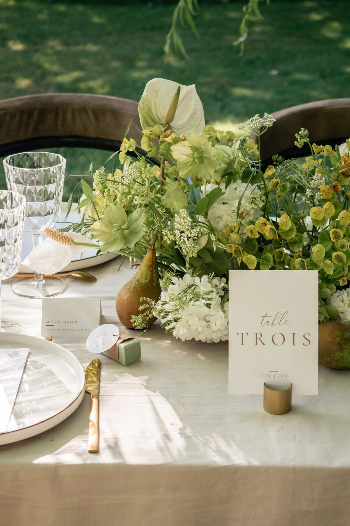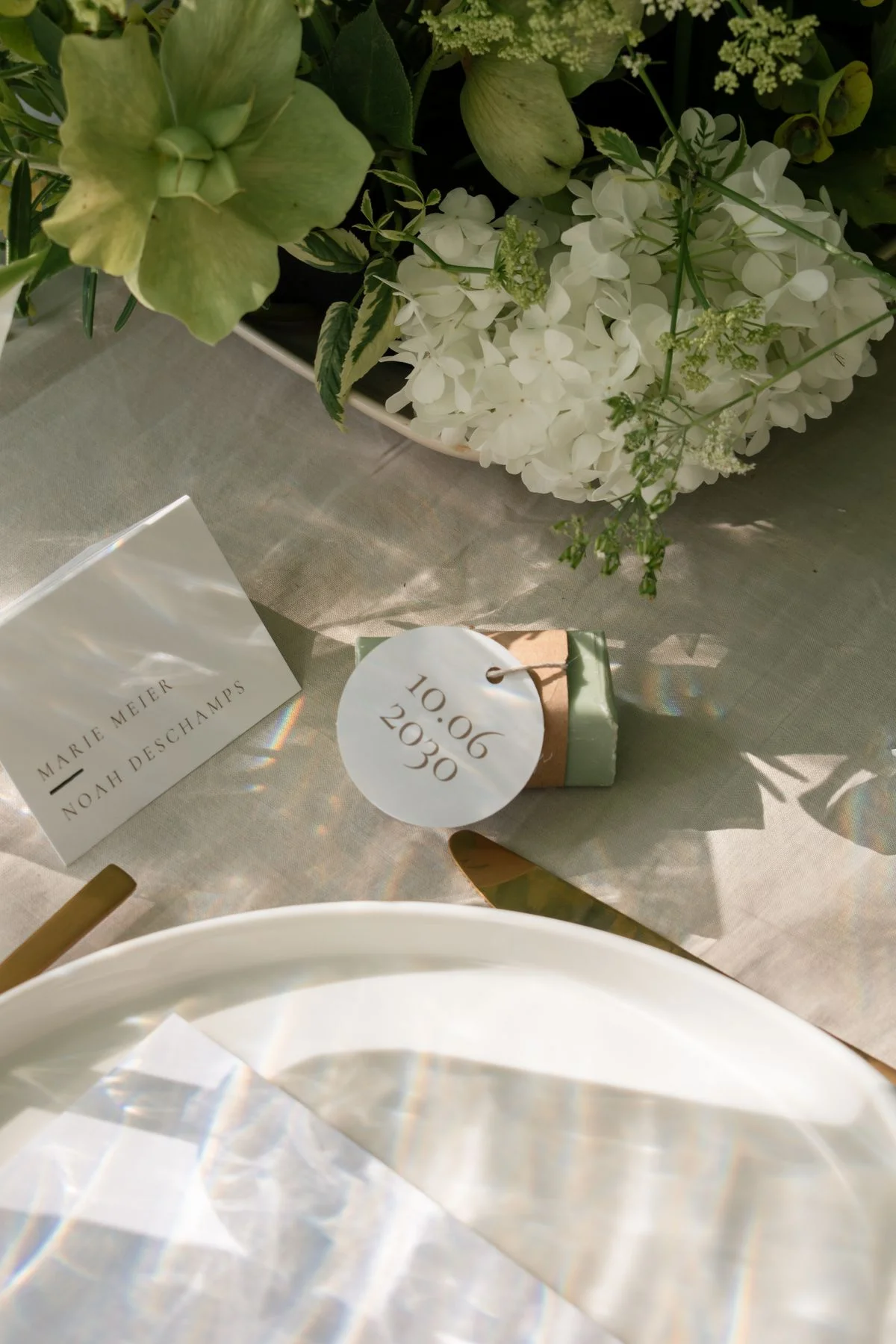 Le décor repose sur une palette délicate, dominée par des nuances de beige, de blanc et de vert. Le linge de table, volontairement neutre, sert de toile de fond à une vaisselle aux lignes épurées et à des couverts dorés qui apportent une note délicatement sophistiquée. Les verres ciselés, eux, introduisent un jeu de transparences qui capte la lumière et renforce l’effet de finesse générale.