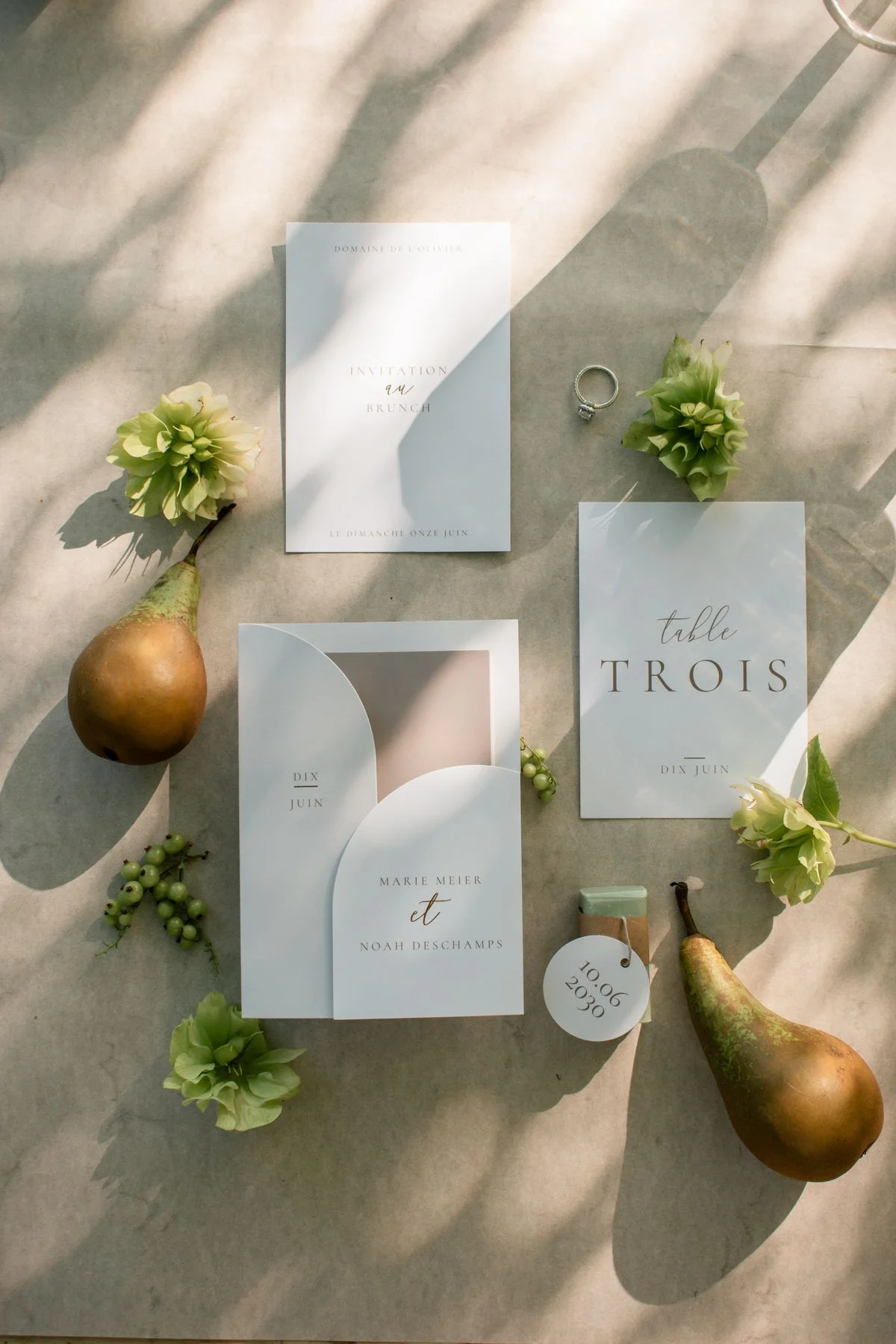 Dans ce cadre, la papeterie joue un rôle essentiel dans la cohérence d’ensemble. Les modèles signés Maison June, caractérisés par une intention graphique minimaliste et chic, complètent la décoration sans la surcharger. Menus, marque-places et numéros de table affichent une esthétique contemporaine, où la sobriété souligne le sens du détail. Le résultat se fond naturellement dans l’ambiance et prépare les invités à vivre une cérémonie empreinte d’élégance.