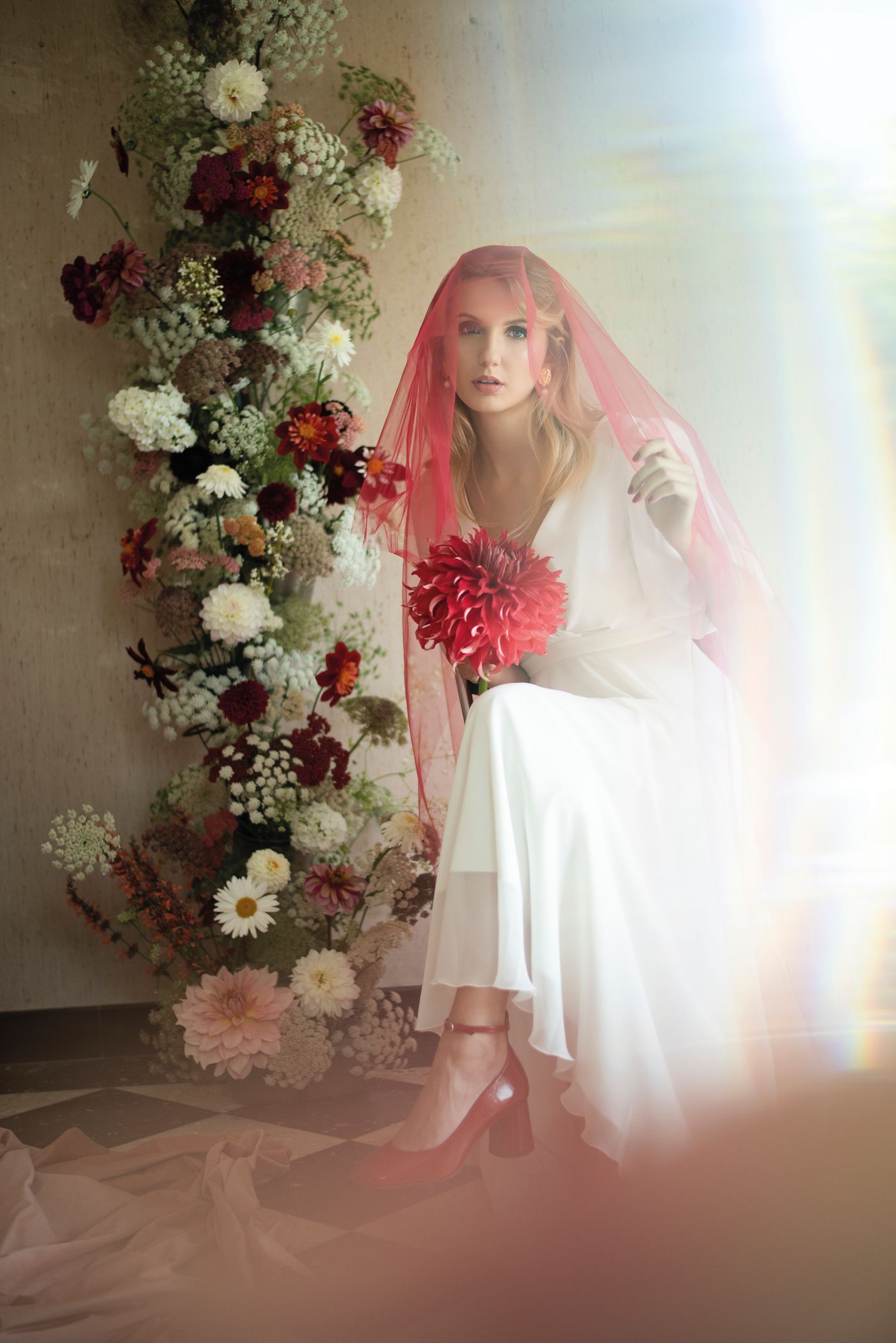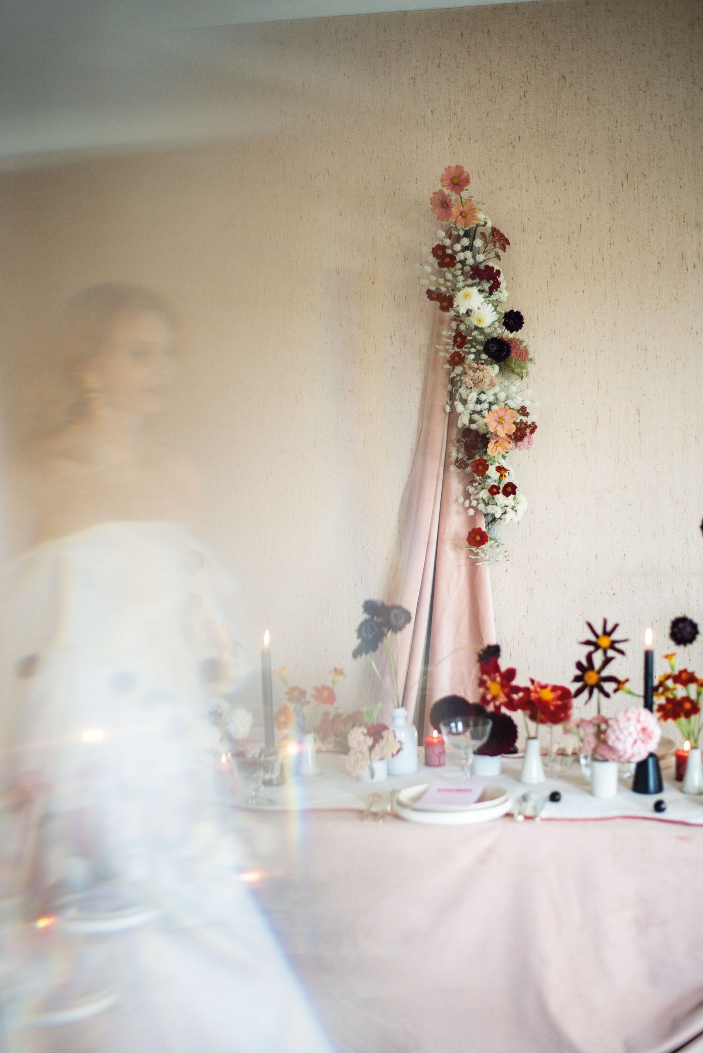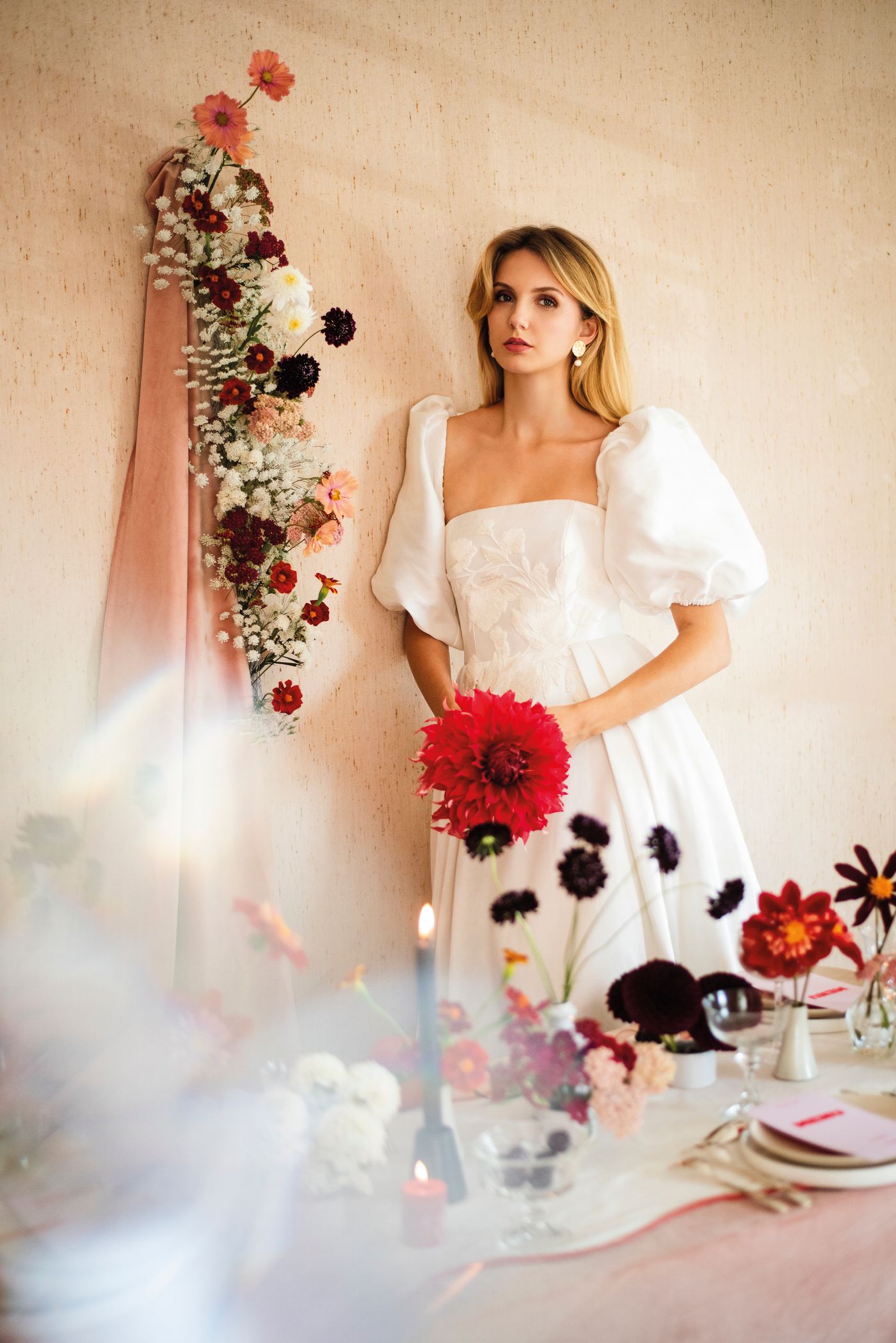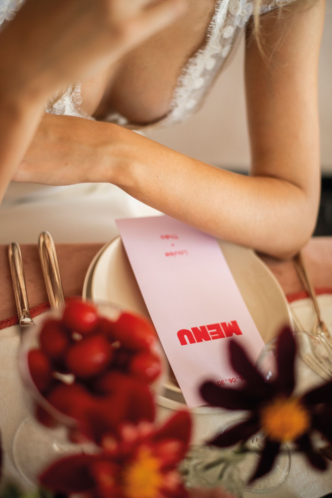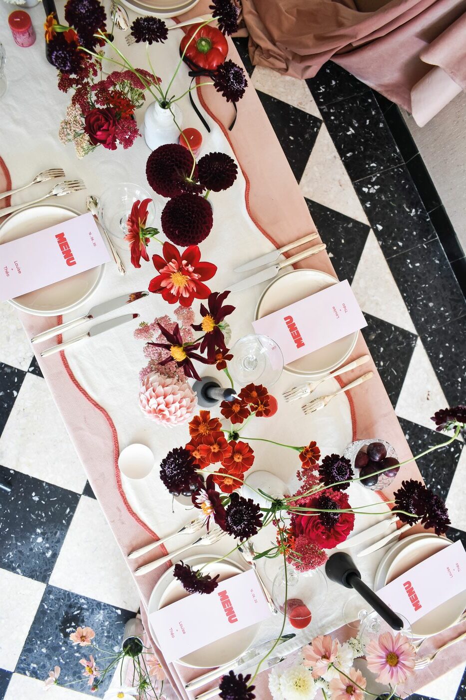 Le sol en damier noir et blanc donne le ton : graphique, intemporel, presque cinématographique. À cela s’ajoute une nappe rose pâle légèrement drapée, comme un clin d’œil aux jupons anciens, apportant une douceur texturée à l’ensemble. La palette se décline autour de tons rouges et roses, présents dans les compositions florales généreuses qui ponctuent l’espace. En effet, les fleurs sont très présentes et enveloppent les scènes avec poésie.