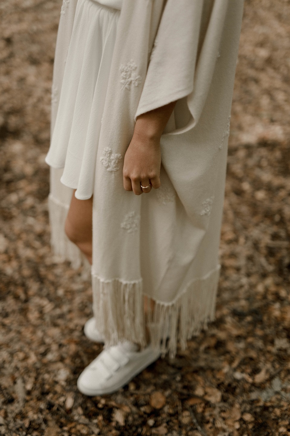 Flora – Top et Jupe : Atelier Swan / Poncho : Elise Hameau / Chaussures : Roseanna / Peigne : English Garden / Bague : Or du Monde