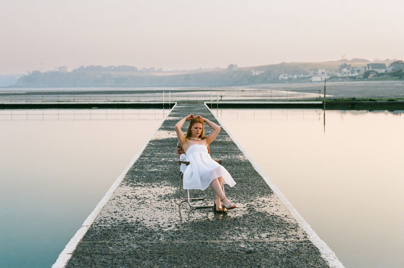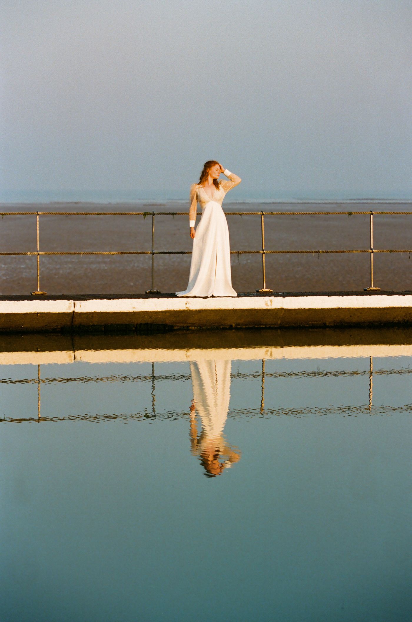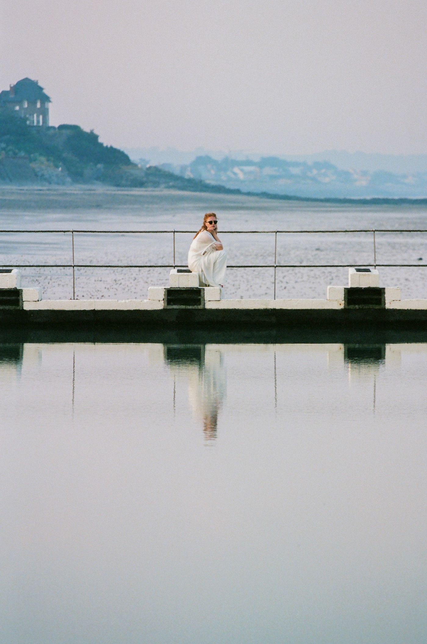 Pour ce shooting intitulé “Carte Postale”, nous voulions capturer la beauté de la piscine d’eau de mer de Saint-Pair-sur-Mer, dans la Manche. Un décor singulier pour du mariage, baigné par la douceur de l’aube, où ciel, mer et lumière se rencontrent pour ne faire plus qu’un.