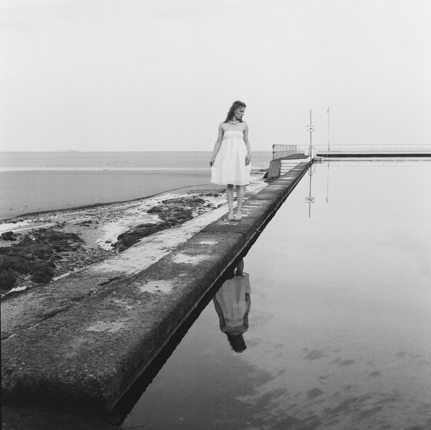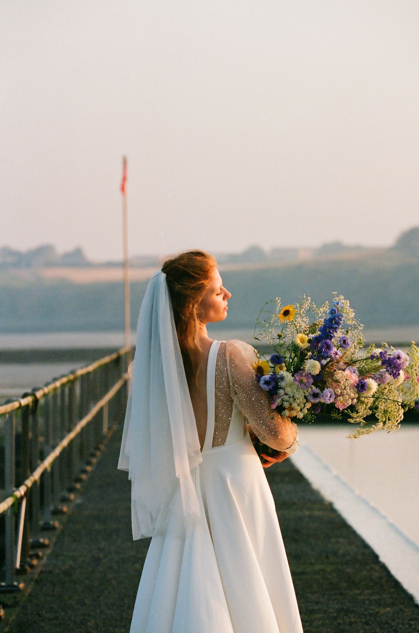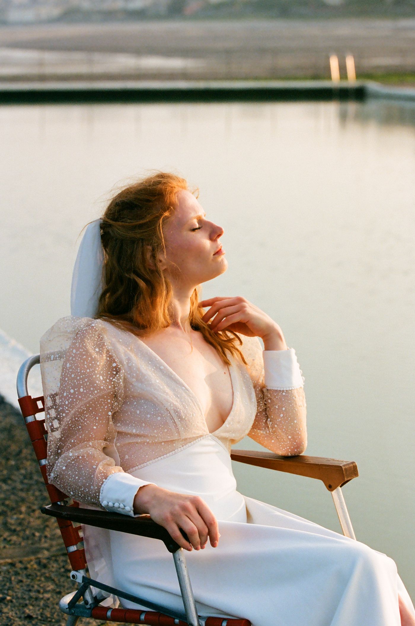 Pour ce shooting intitulé “Carte Postale”, nous voulions capturer la beauté de la piscine d’eau de mer de Saint-Pair-sur-Mer, dans la Manche. Un décor singulier pour du mariage, baigné par la douceur de l’aube, où ciel, mer et lumière se rencontrent pour ne faire plus qu’un.