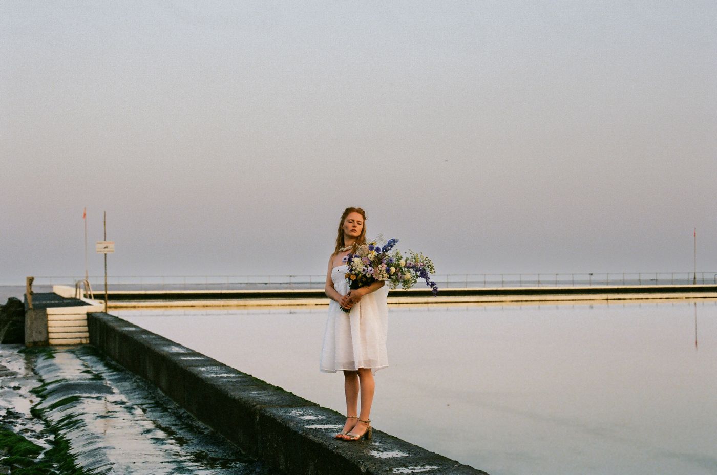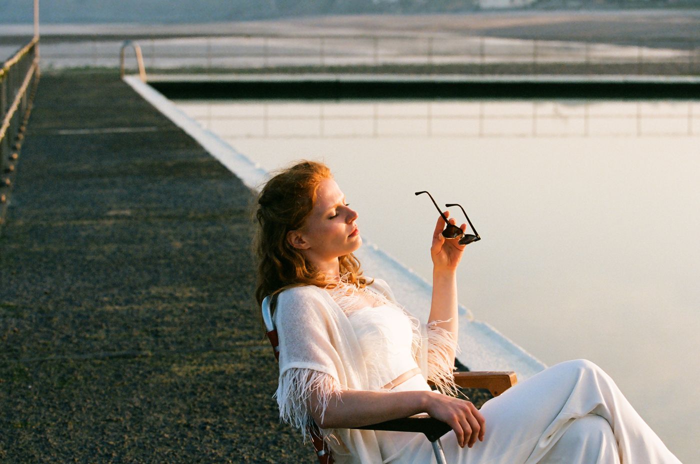 Nous avons choisi ce lieu pour son atmosphère paisible et presque irréelle, accentuée par les reflets de l’eau et les magnifiques teintes du lever du soleil. L’idée ? Proposer une alternative originale et pleine de charme aux classiques lieux de photos de mariage. Entre modernité et nostalgie, cette piscine d’eau de mer représente à merveille l’esprit “carte postale” que nous souhaitions transmettre. La mariée évolue dans ce décor, vêtue de robes légères et élégantes, tantôt déambulant sur les rebords, tantôt assise face à l’horizon. Les fleurs viennent simplement sublimer ce moment suspendu.