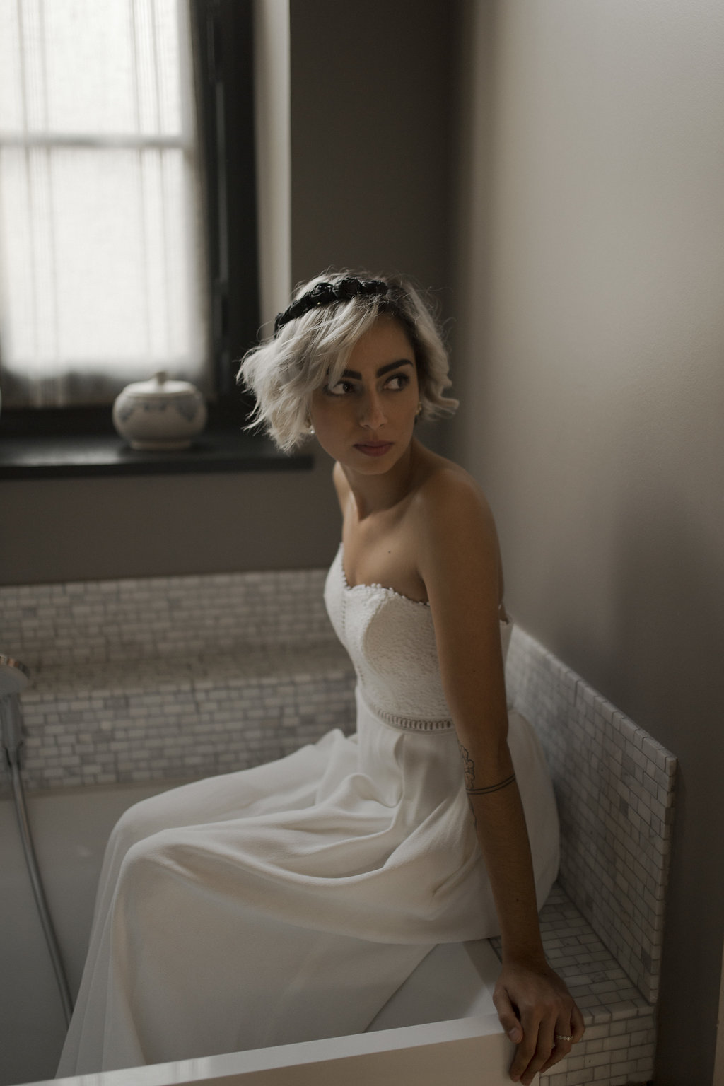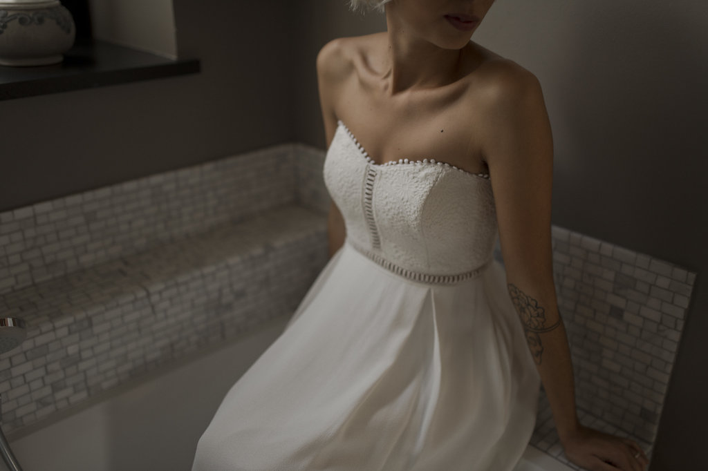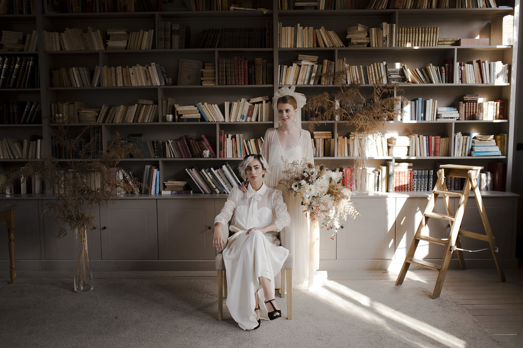 Romane : Robe Ingrid Fey – Boucles d’oreille Monshiro – Voile Les Fleurs Dupont x L’amoureuse by Ingrid Fey / Lou : Robe Caroline Takvorian