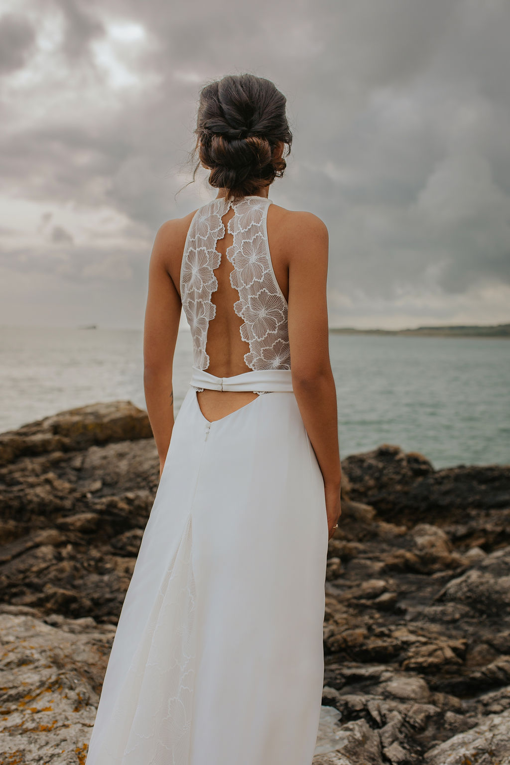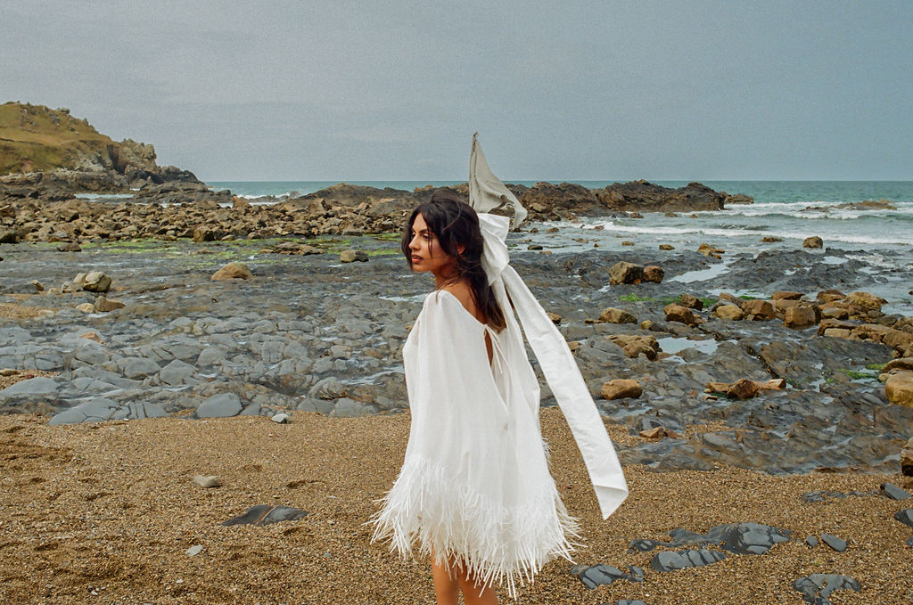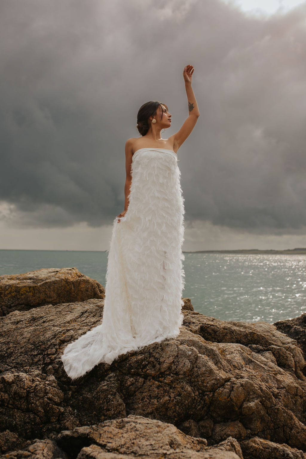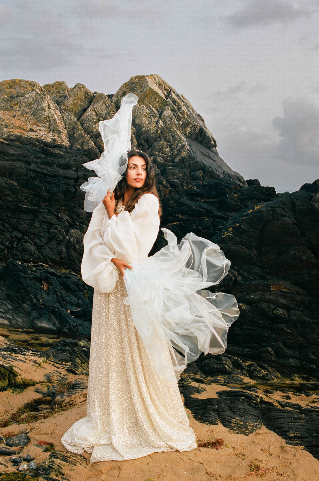 Dans ce décor brut et minéral, entre roche, mer et ciel changeant, les silhouettes se dessinent telles des peintures vivantes. Chaque robe incarne un fragment de cette Vénus moderne : drapés vaporeux, jeux de transparence, matières fluides, évoquant la douceur tout en sublimant le mouvement.