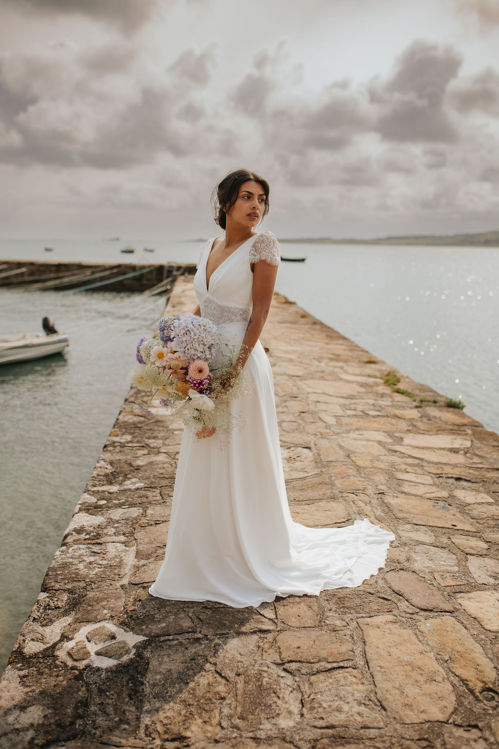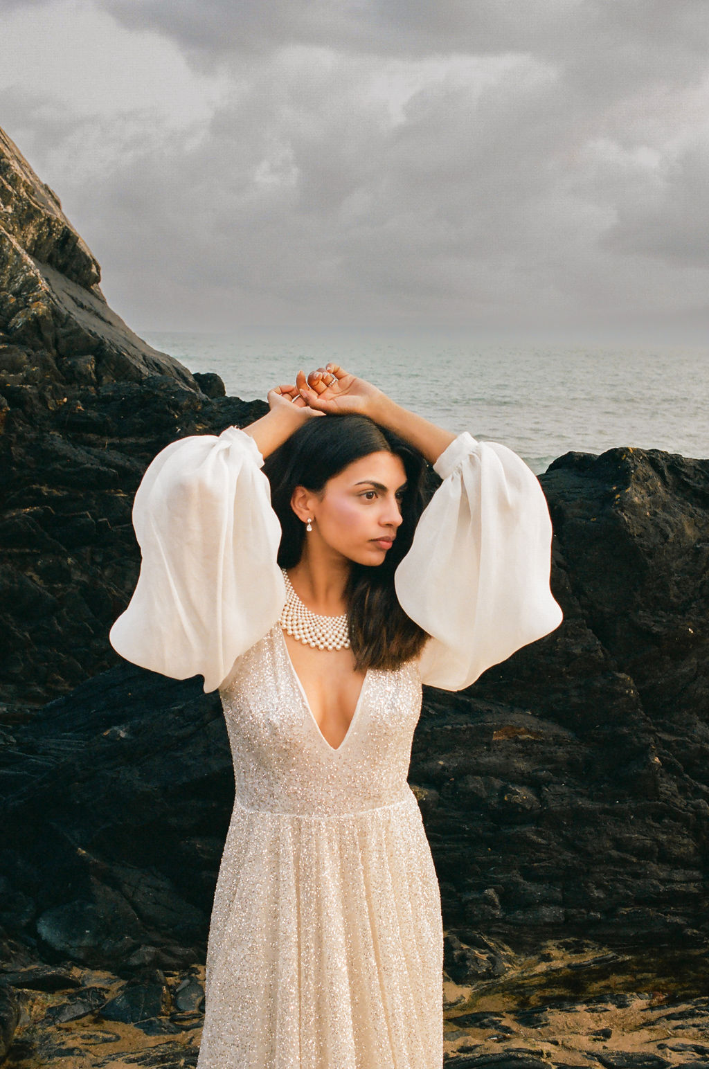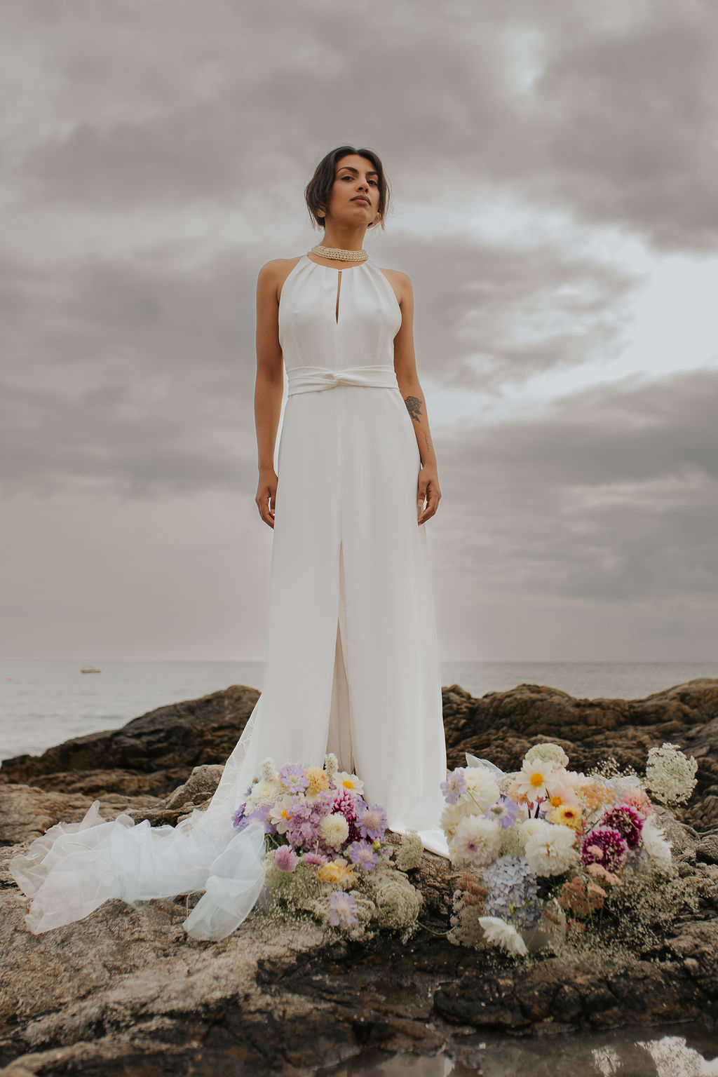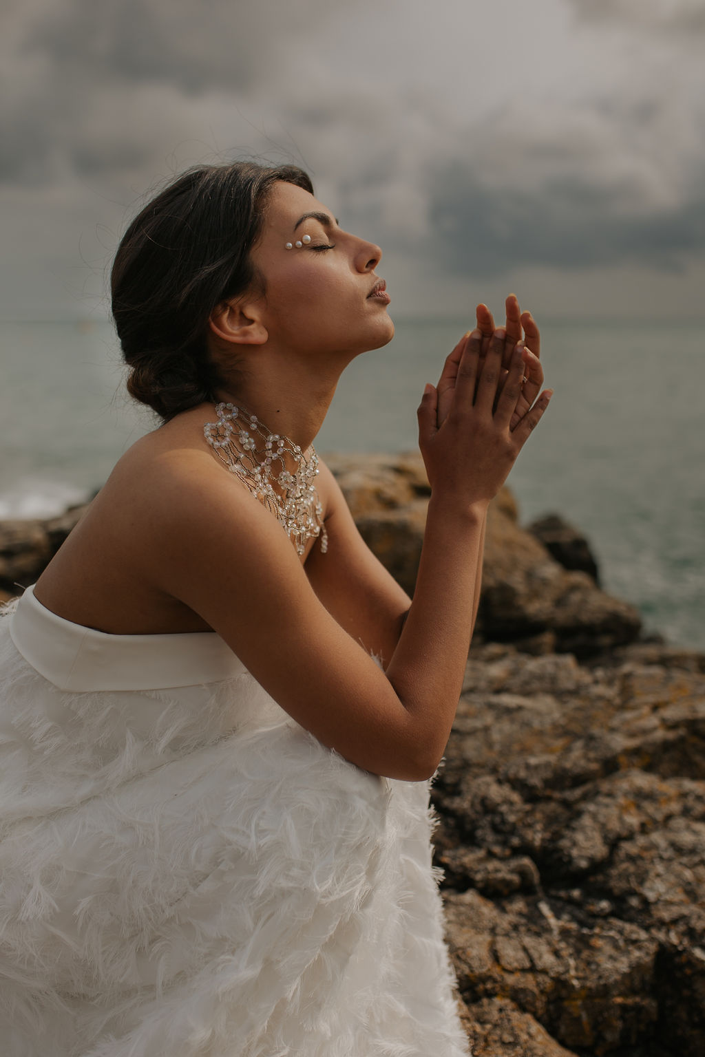 Dans ce décor brut et minéral, entre roche, mer et ciel changeant, les silhouettes se dessinent telles des peintures vivantes. Chaque robe incarne un fragment de cette Vénus moderne : drapés vaporeux, jeux de transparence, matières fluides, évoquant la douceur tout en sublimant le mouvement.