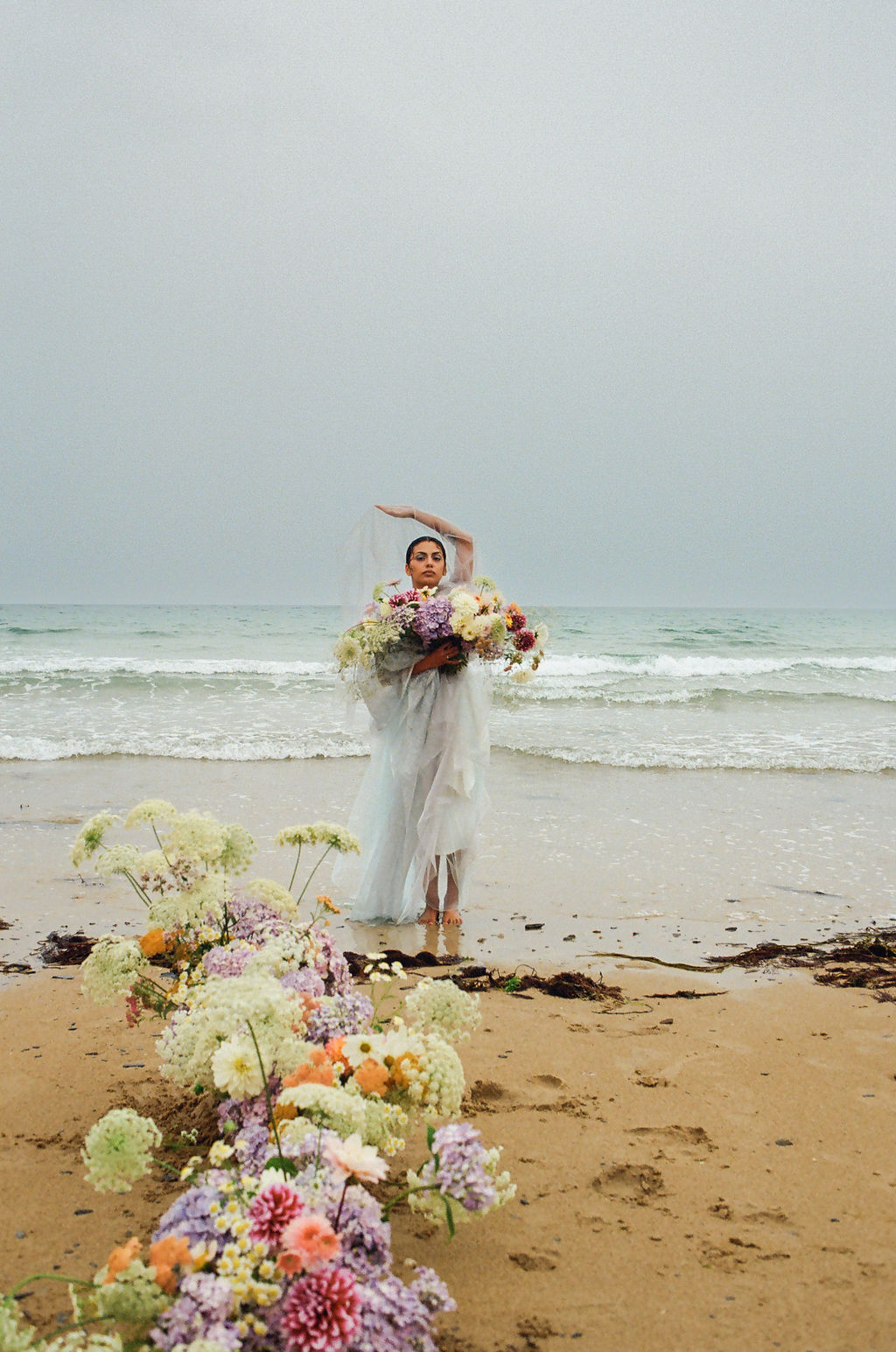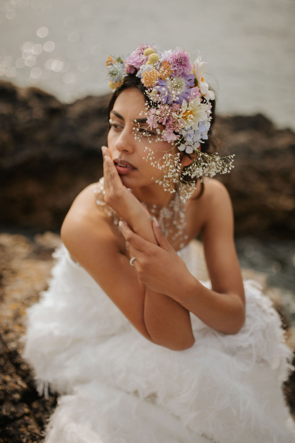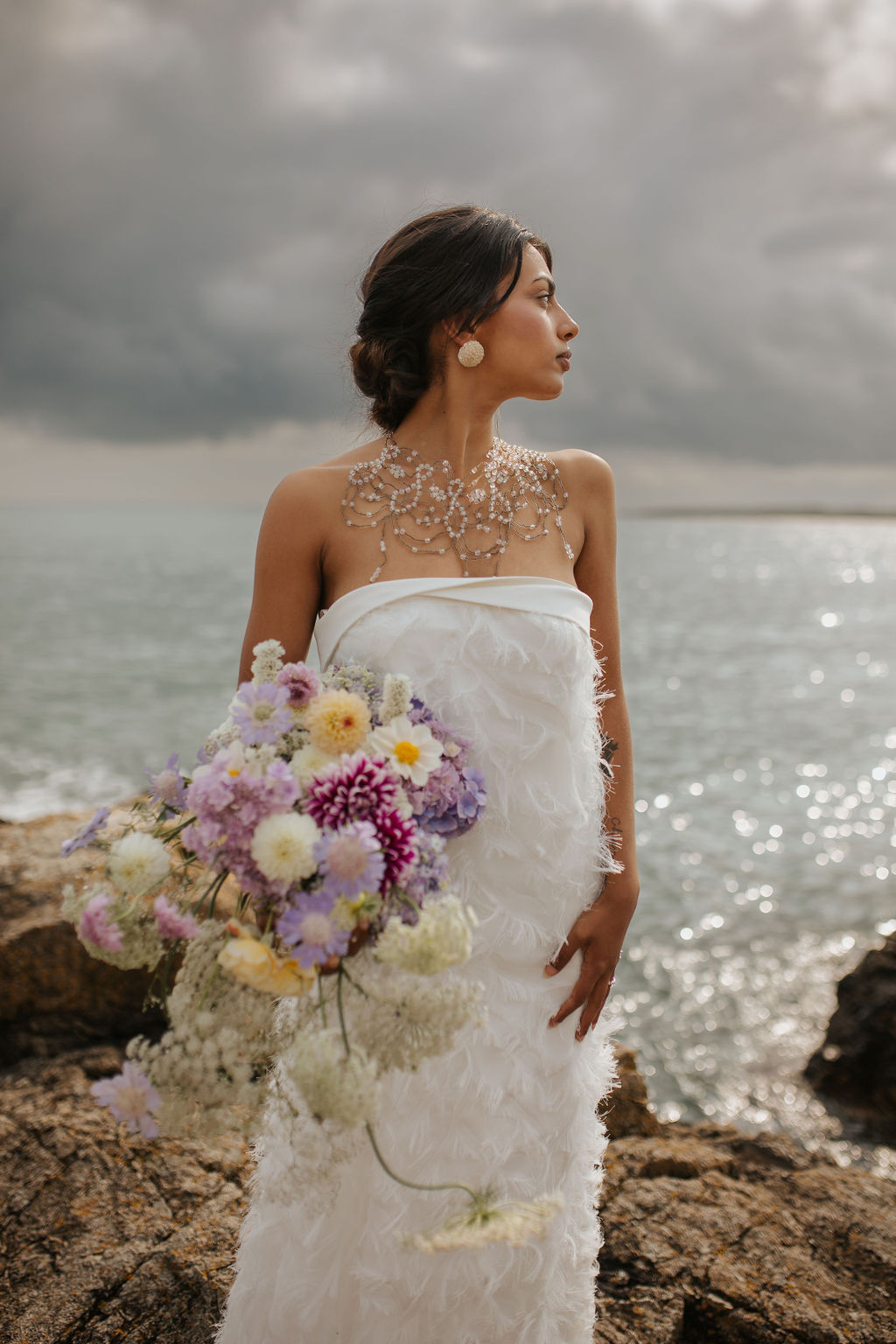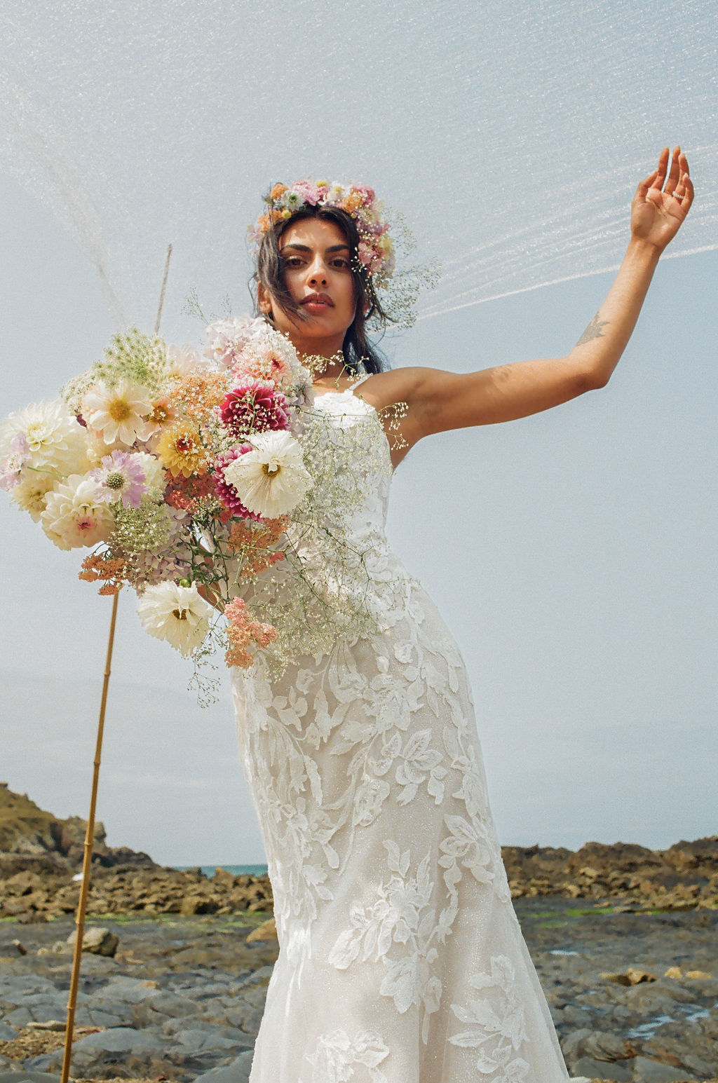 Dans ce décor brut et minéral, entre roche, mer et ciel changeant, les silhouettes se dessinent telles des peintures vivantes. Chaque robe incarne un fragment de cette Vénus moderne : drapés vaporeux, jeux de transparence, matières fluides, évoquant la douceur tout en sublimant le mouvement.