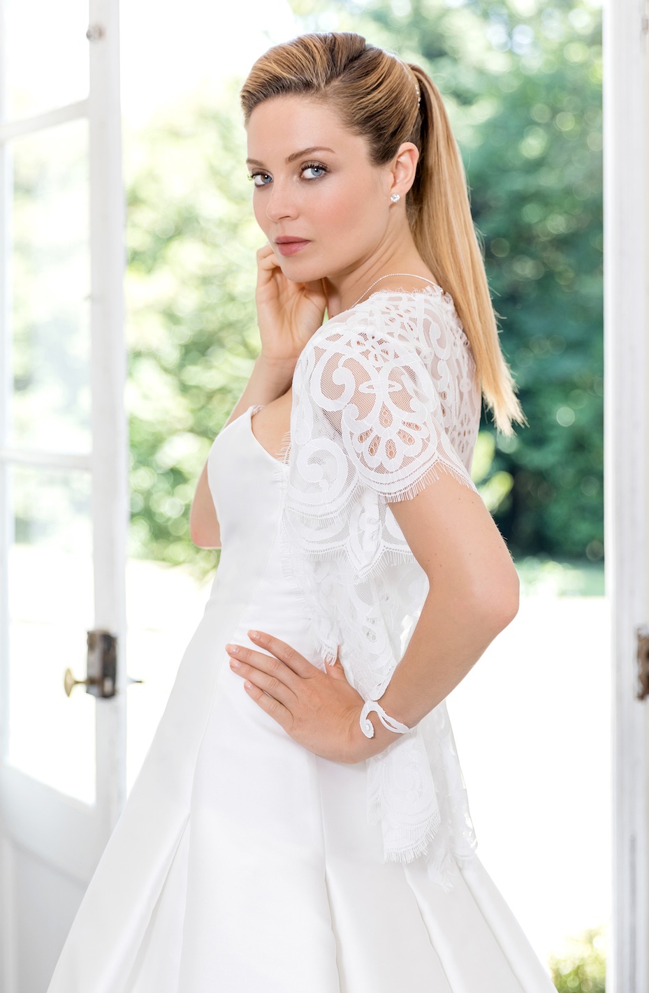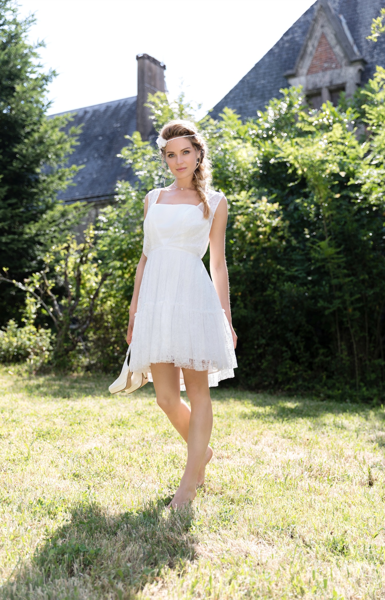 Robe de mariée courte fluide et délicate. Avec sa fine dentelle à sequin.