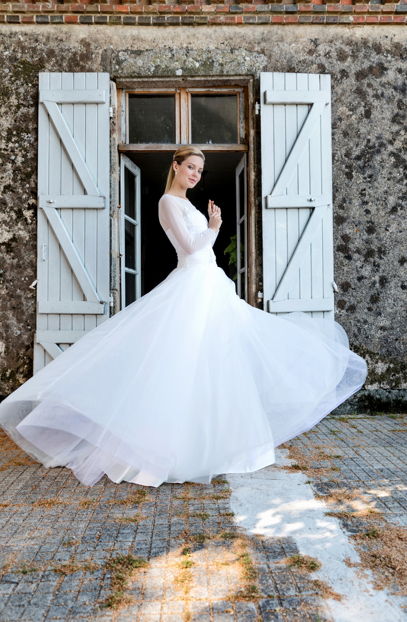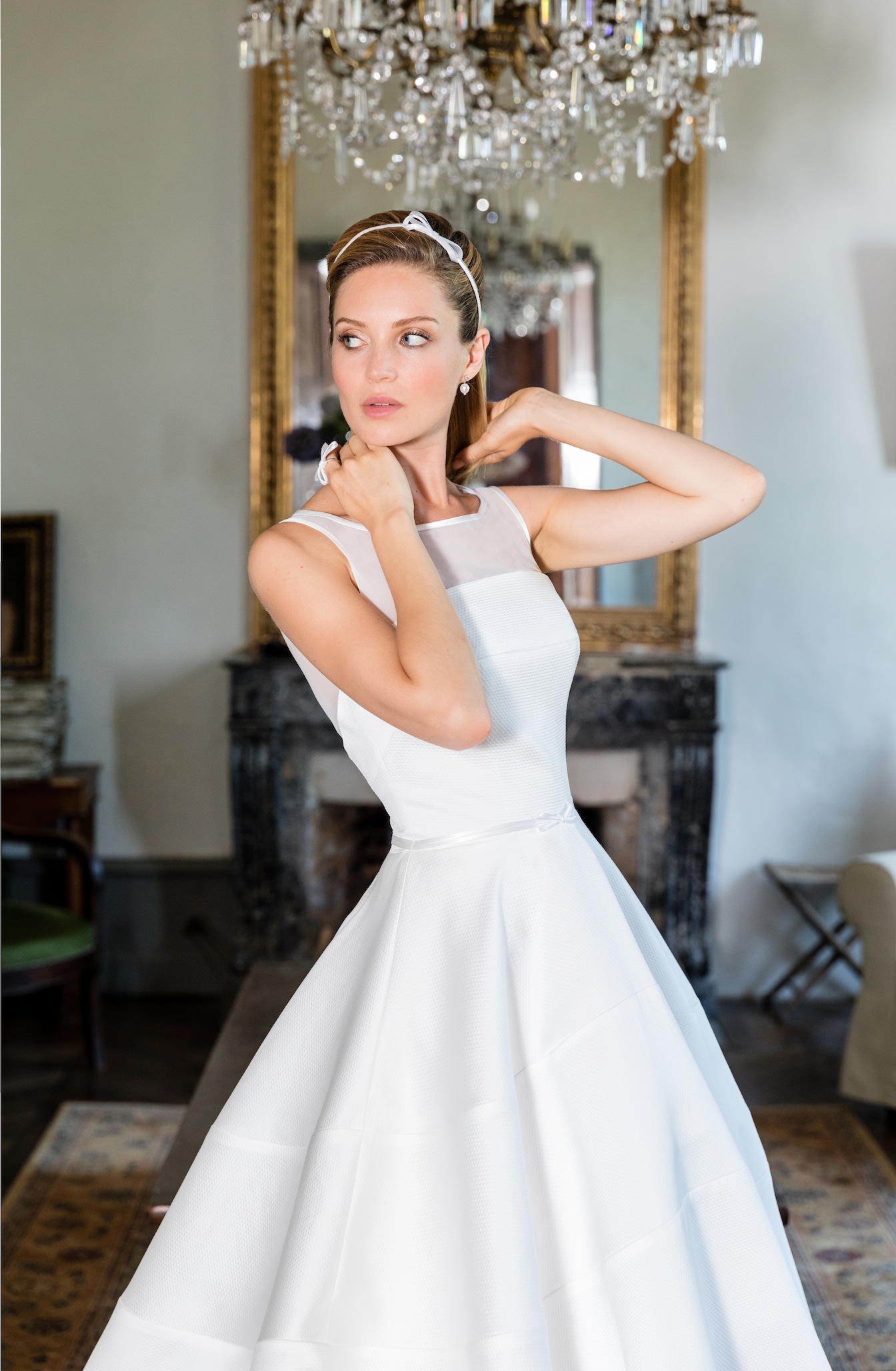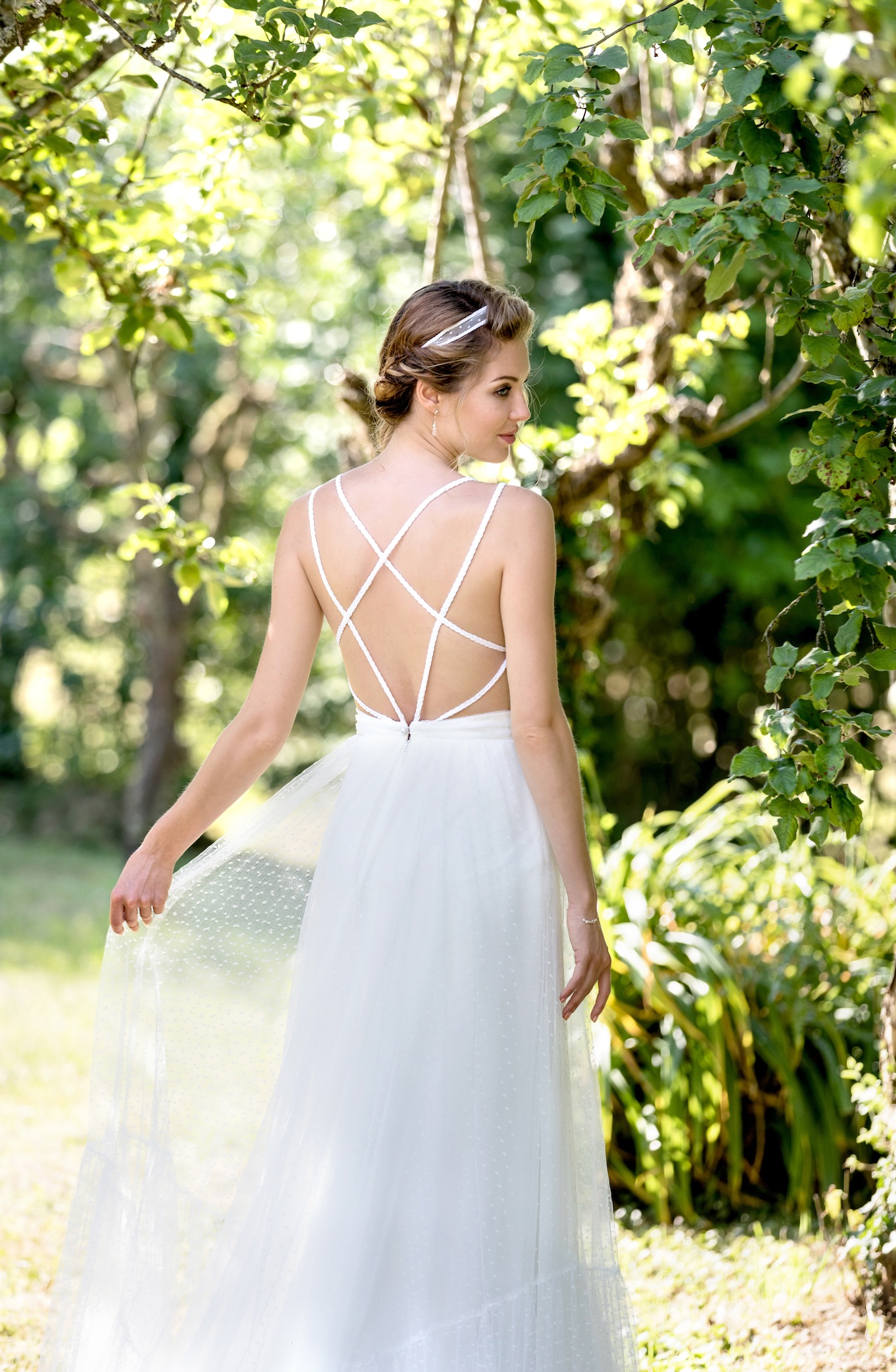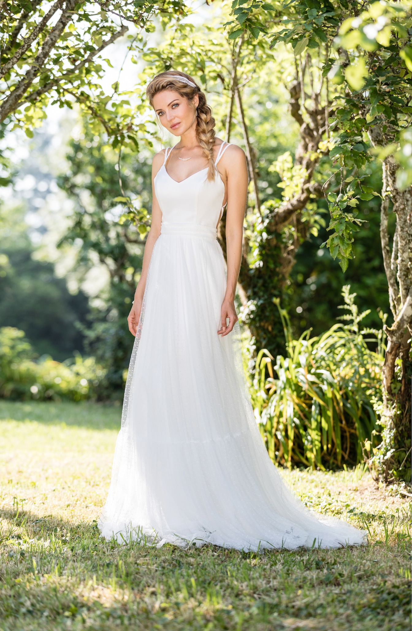 Robe de mariée légère avec sa jupe en tulle jacquard. Une taille ajourée et une encolure américaine noué au dos, bordée de dentelle pour un style romantique.