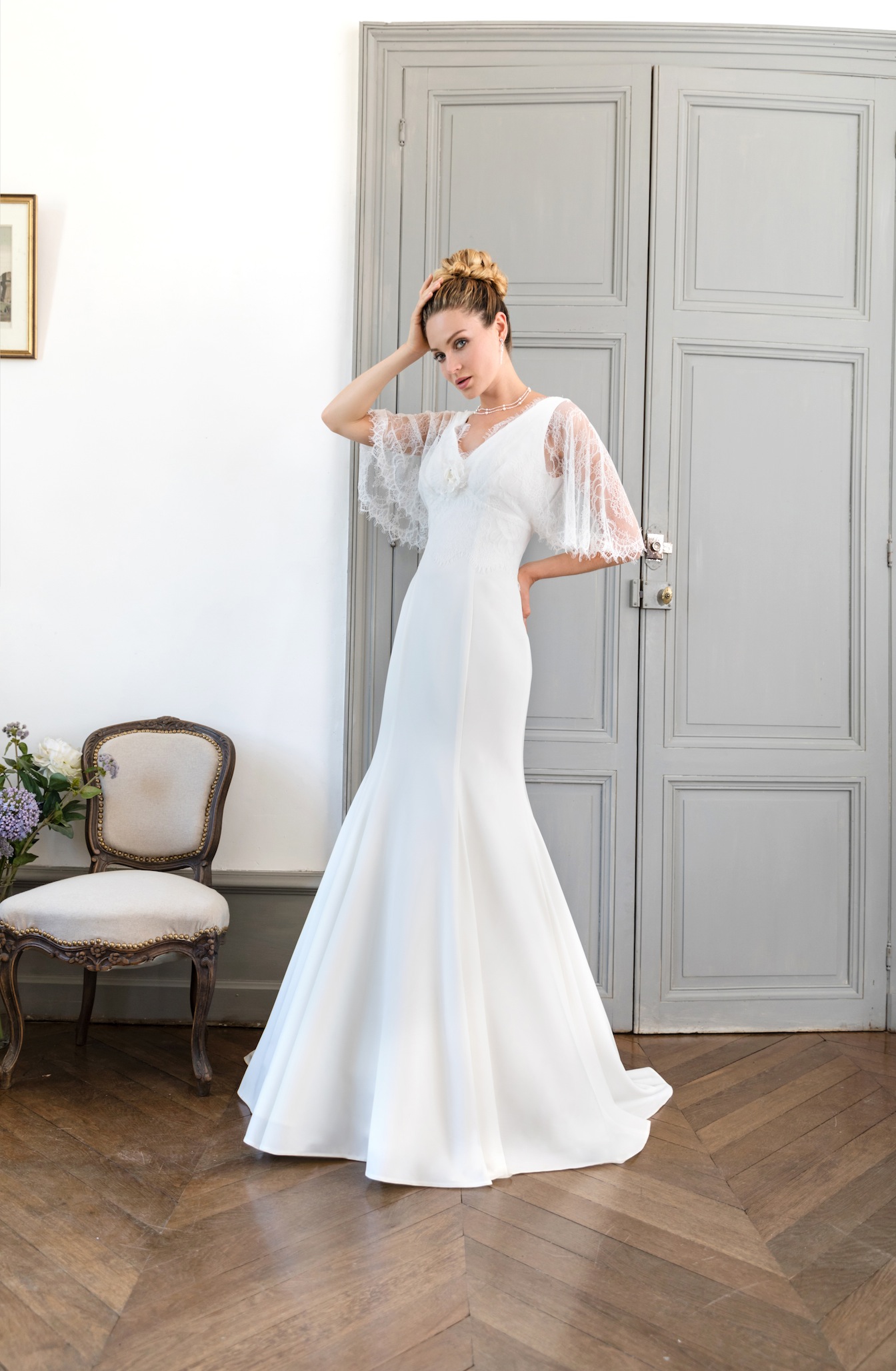 Robe de mariée à plis creux fluide en crêpe. Un élégant décolleté dans le dos et à l’avant bordé de dentelle.