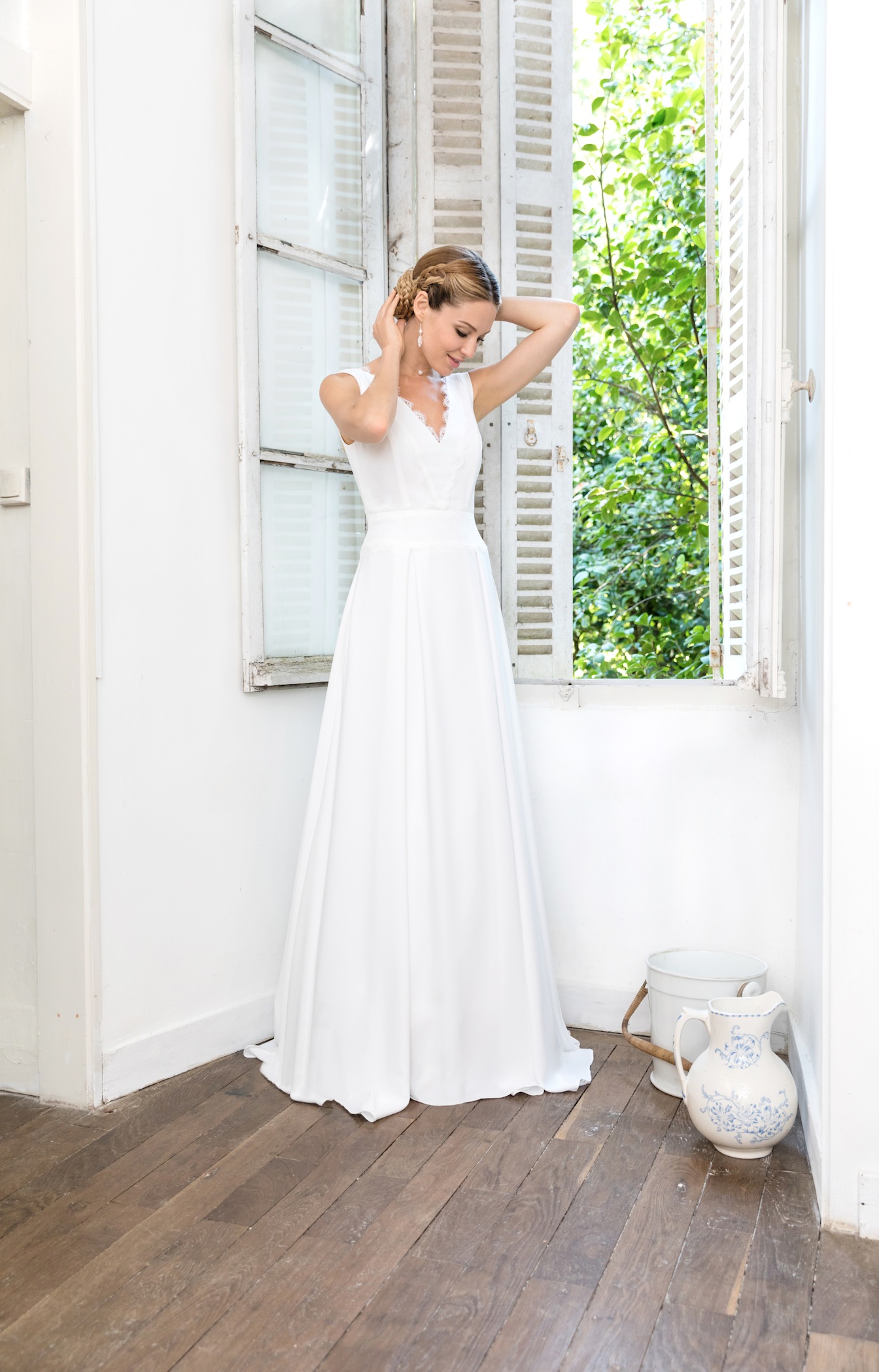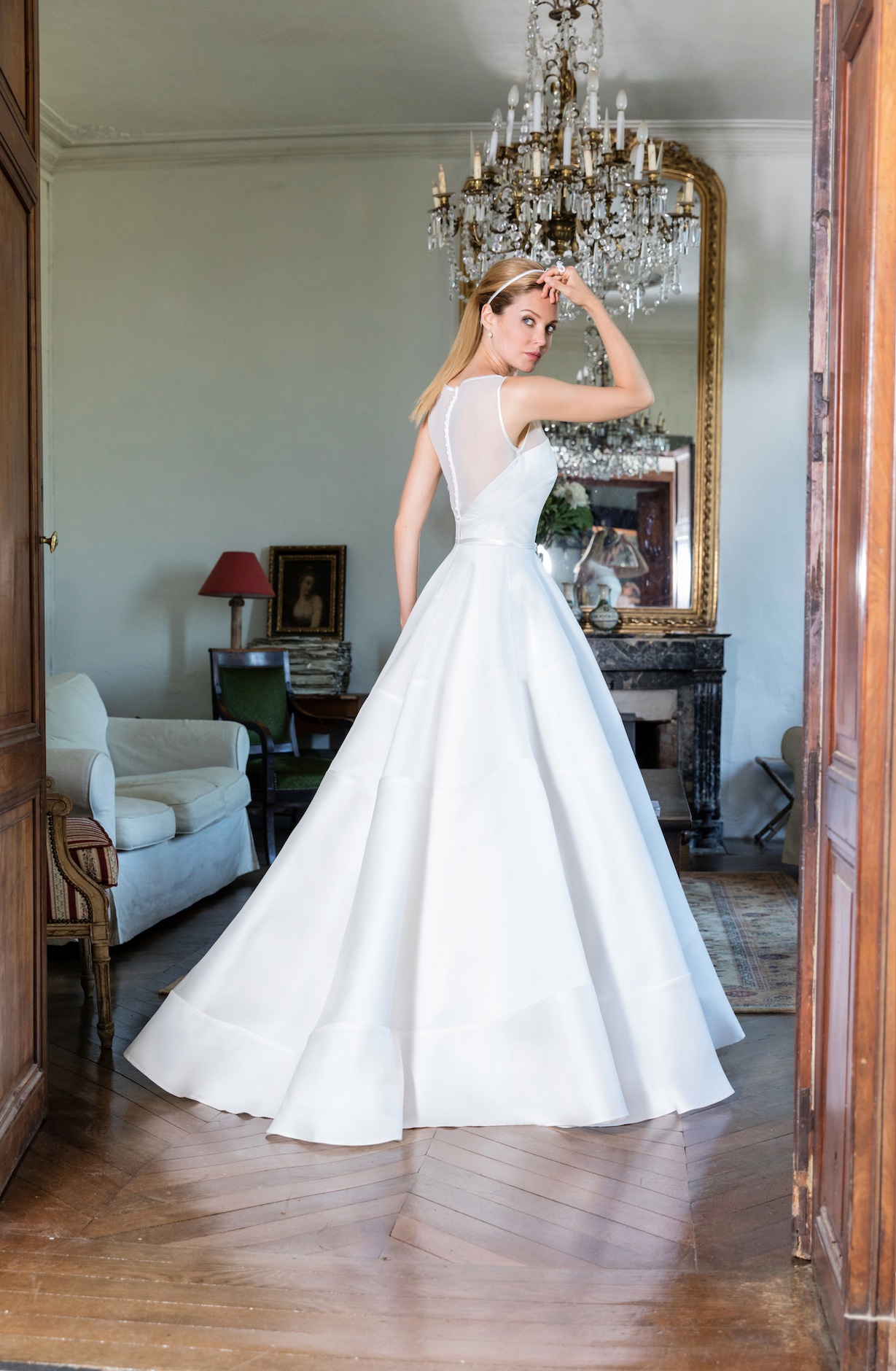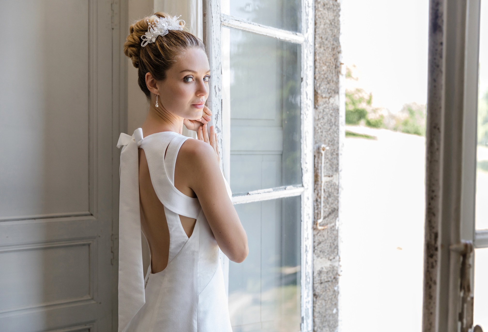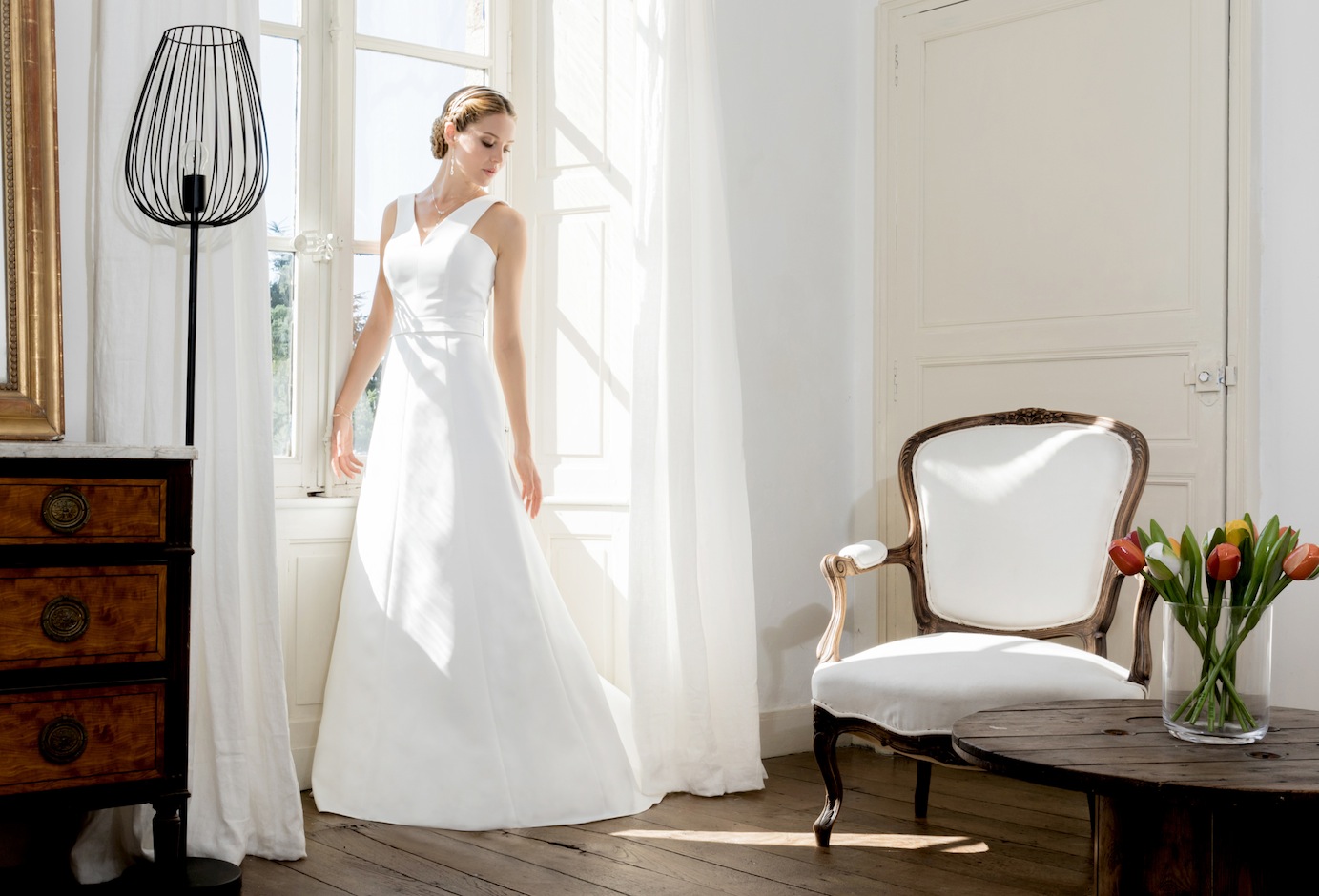 Robe de mariée de forme trapèze et une encolure bateau. Un décolleté dans le dos est marqué par un jeu de doubles bretelles qui s’attache par un grand nœud tombant.