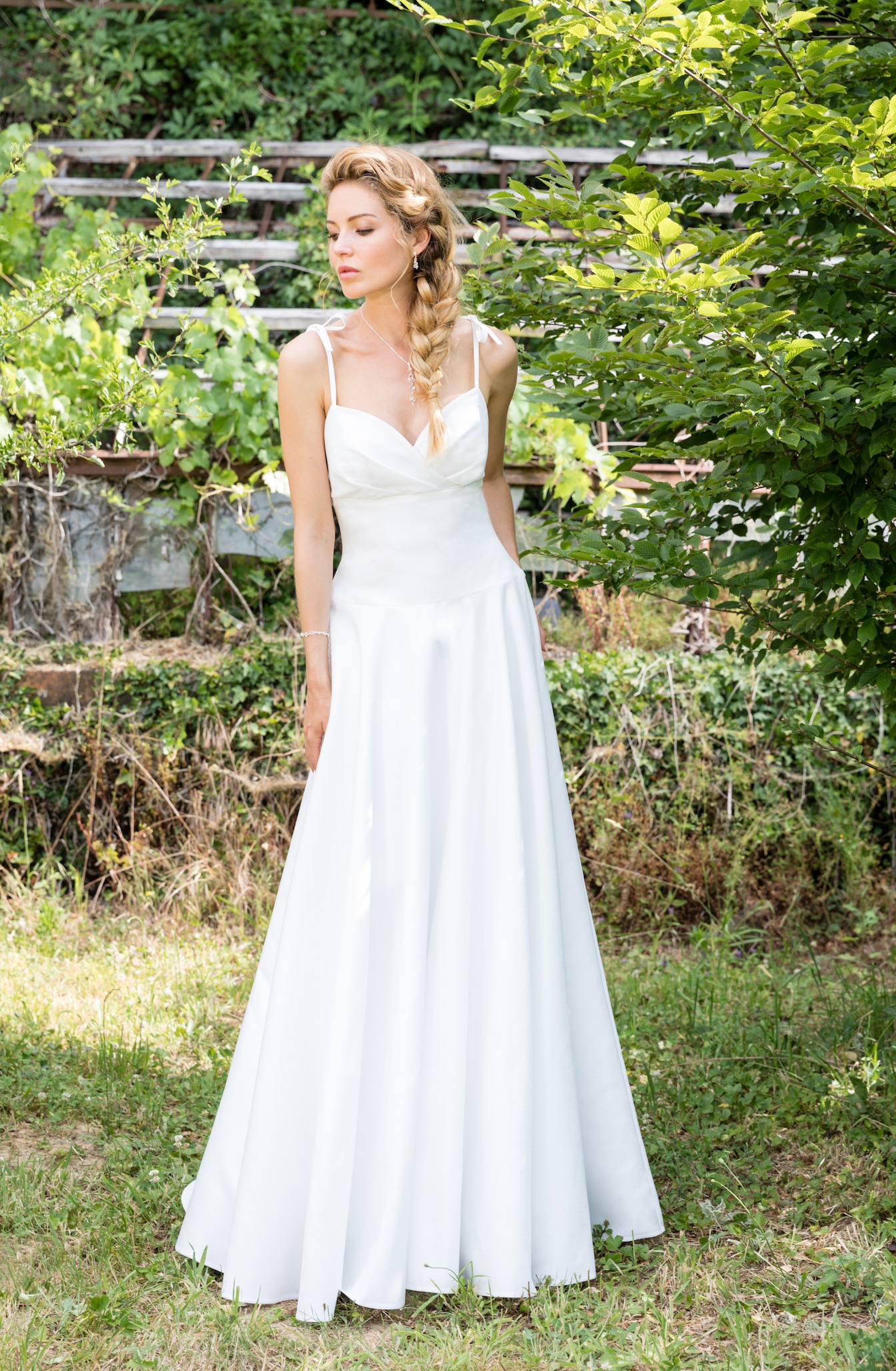 Robe de mariée en satin à bretelles et décolleté en V. La taille est marquée par une ceinture. Pour un style simple et élégant.