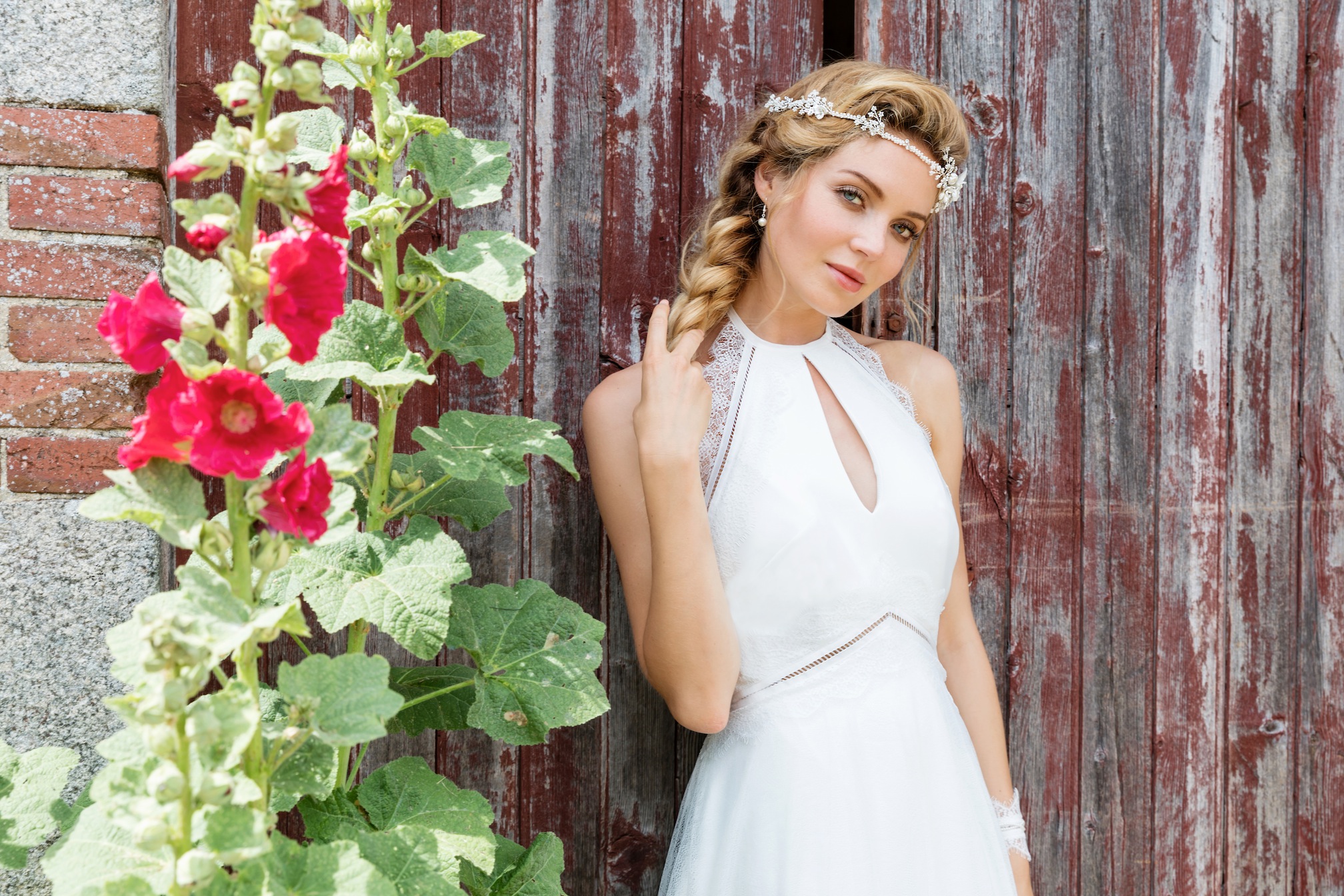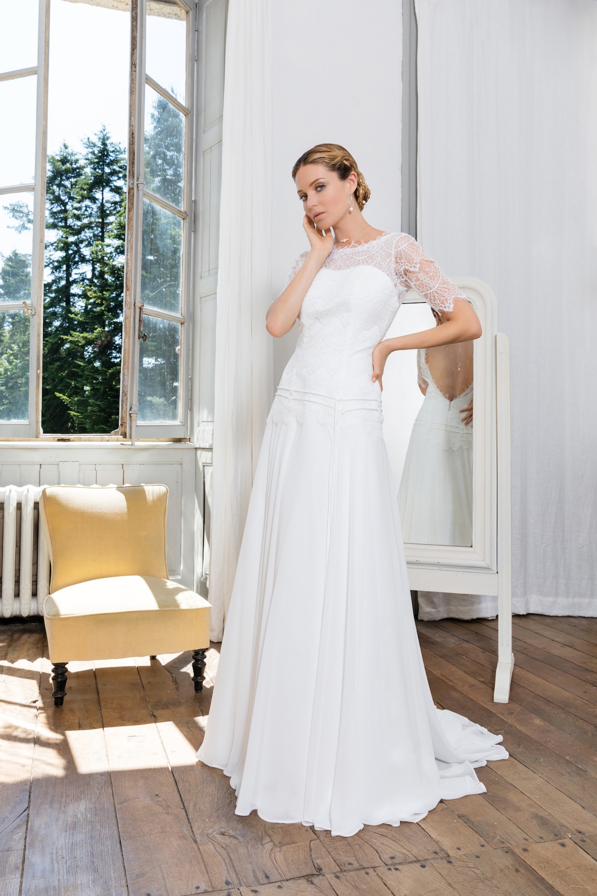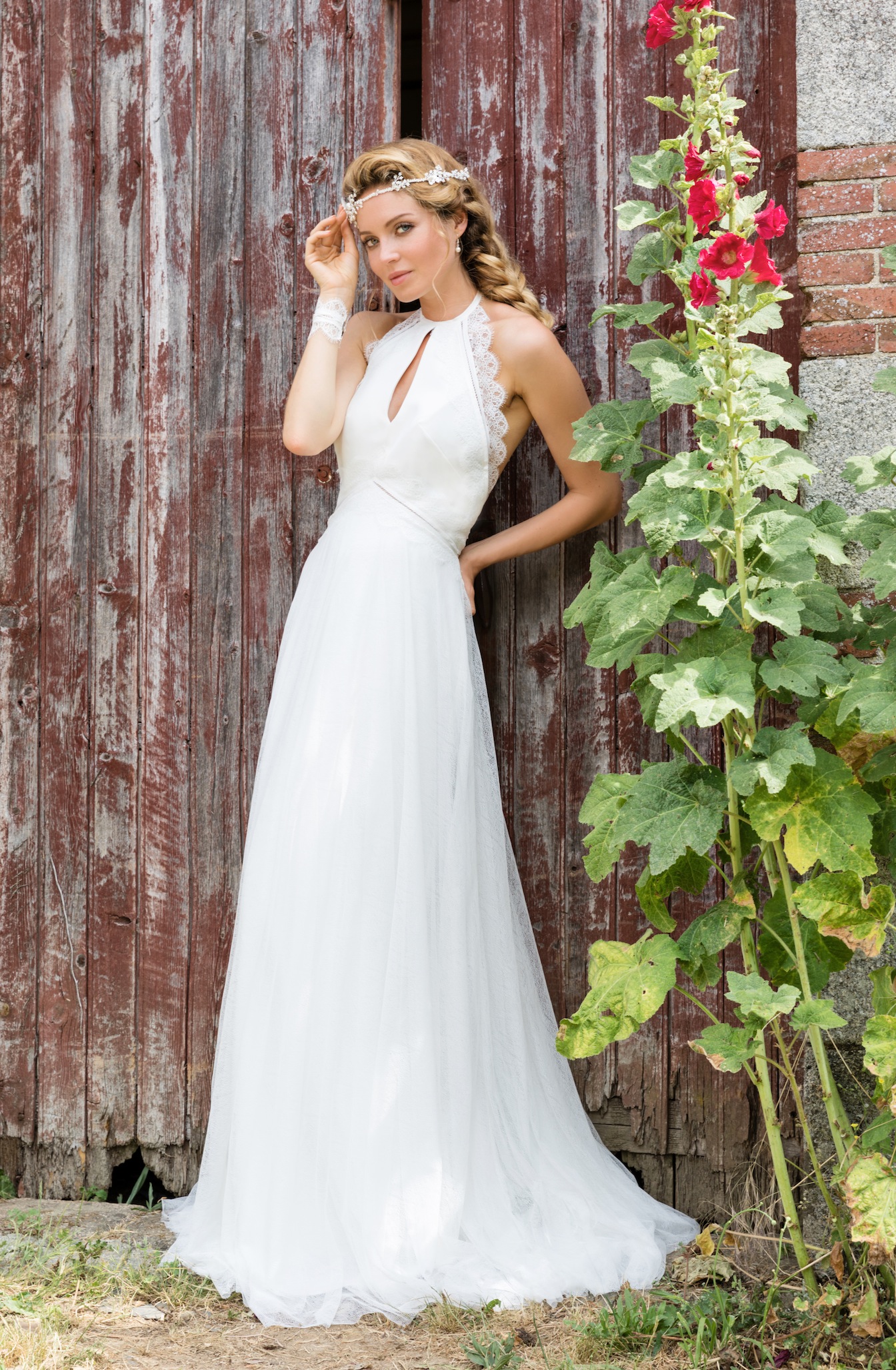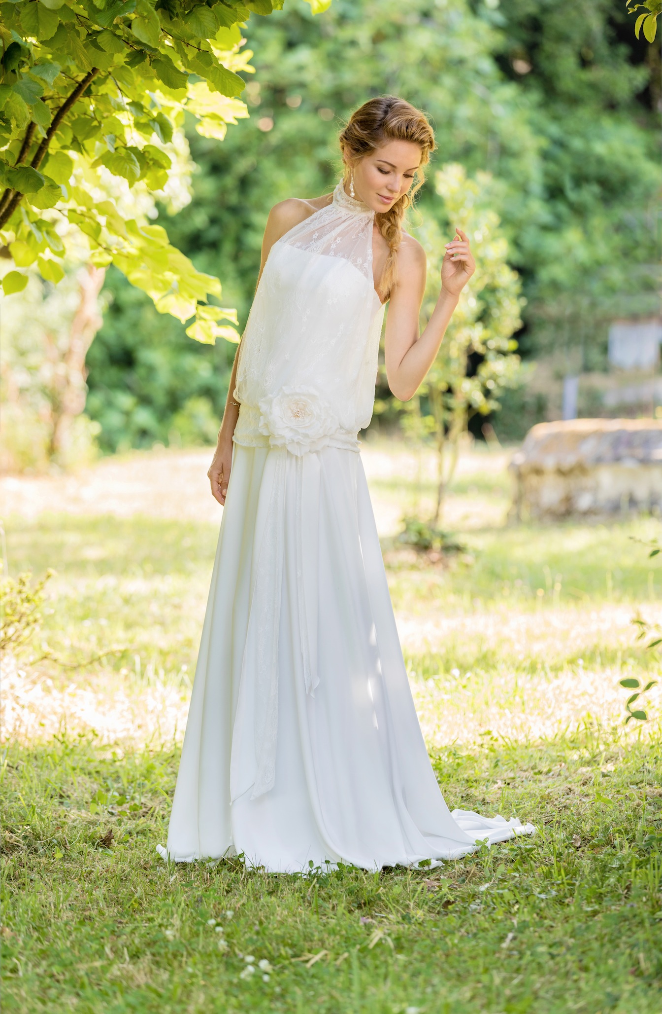 Robe de mariée bohème chic en mousseline et dentelle. L’encolure bateau du devant se prolonge par un magnifique décolleté dans le dos.