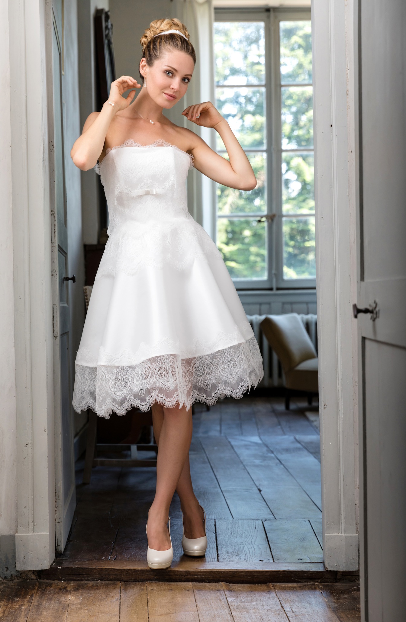 Petite robe de mariée courte, à la coupe trapèze avec un bustier droit recouvert de dentelle. Son nœud sous la poitrine marque son style baby-doll.