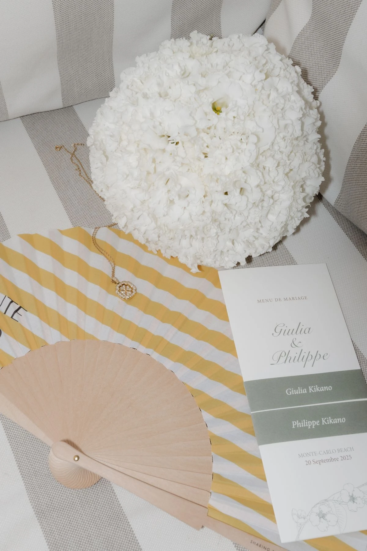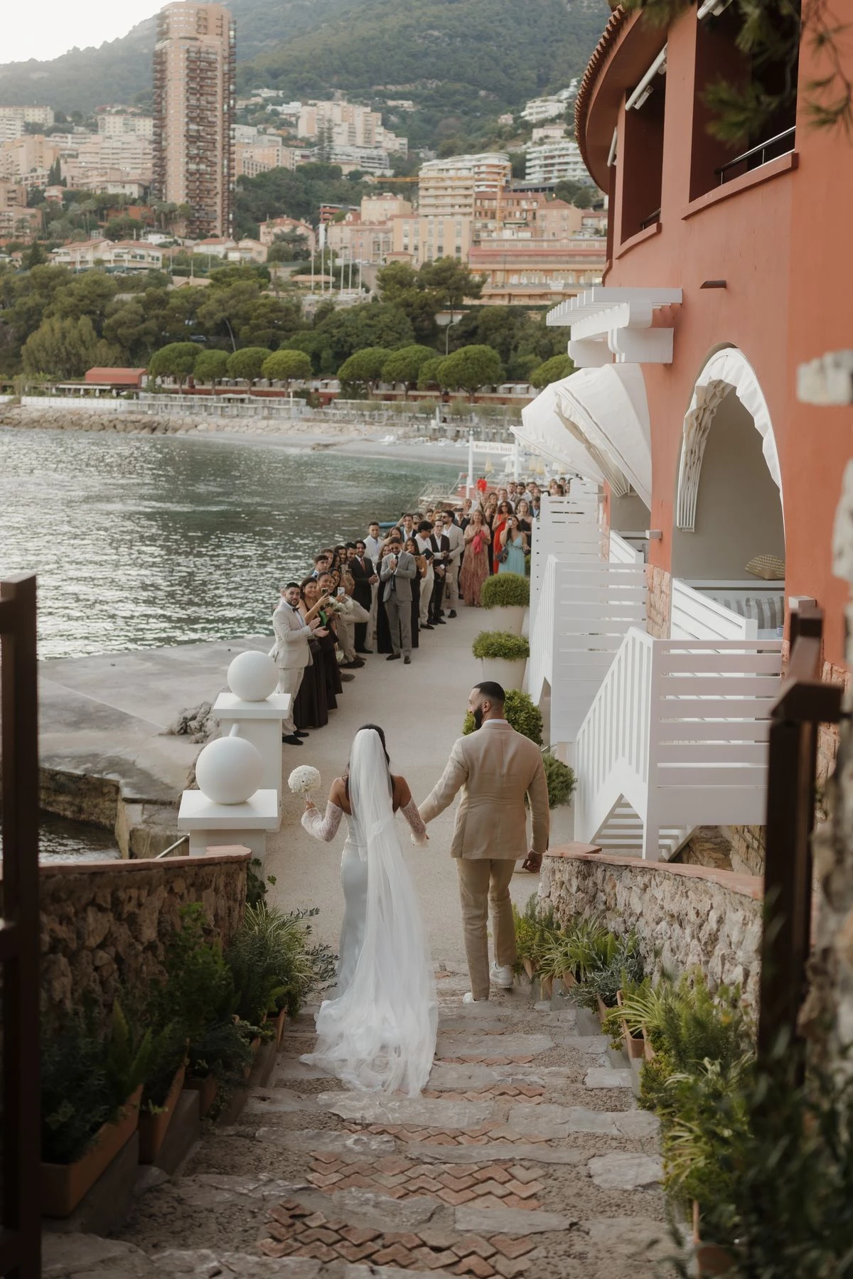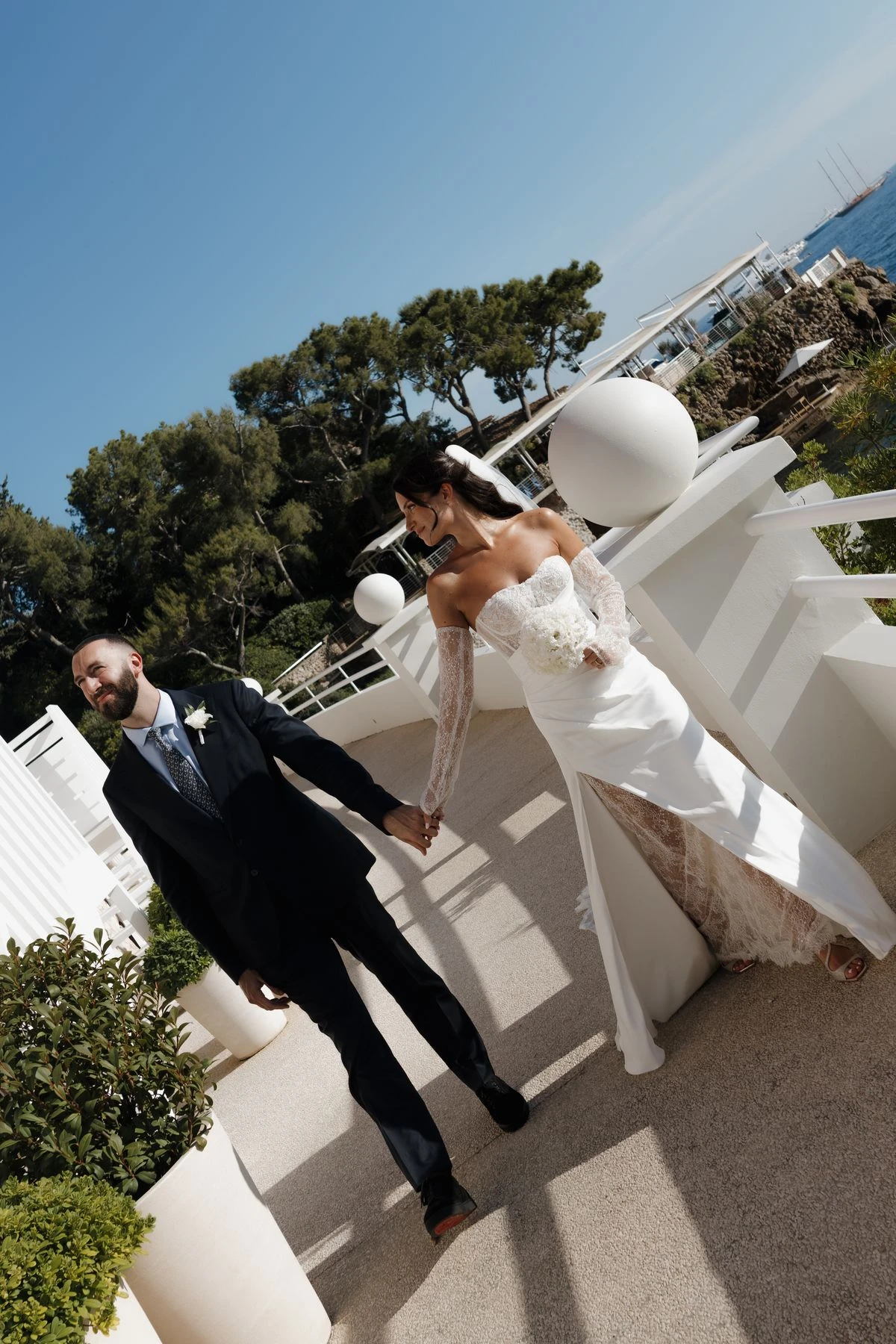 Je les ai tous trouvés sur Instagram, car le contact est rapide et le travail des prestataires y est très visible. Pour le lieu, il s’agit d’un endroit emblématique de Monaco : le Monte-Carlo Beach Club. Nous savions dès le début que nous voulions nous marier là-bas si nous en avions la possibilité. C’était également très pratique, car nous étions presque tous sur place et nous ne voulions pas faire trop déplacer les personnes âgées, ce qui était primordial pour nous, notamment ma grand-mère de 94 ans, qui nous a apporté les alliances et qui compte énormément pour moi.