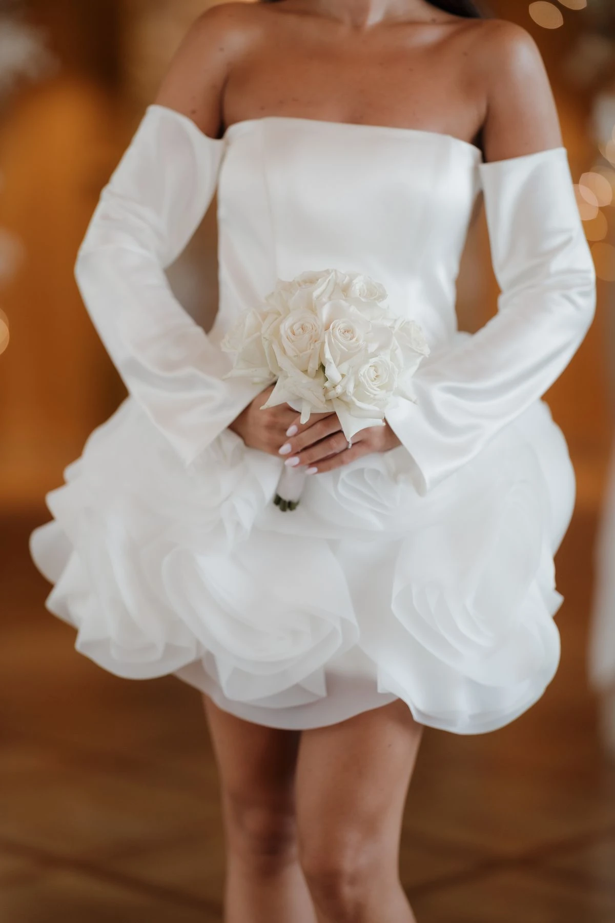 Pour la soirée, j’ai fait réaliser une mini-robe sur mesure par la boutique. J’ai adoré mes trois robes. Je travaille dans la mode et on pourrait penser que j’ai été très pointilleuse, mais je savais dès le départ ce que je voulais et ce que je ne voulais pas. J’ai essayé très peu de robes et tout a été très fluide. Si je me sentais bien dedans, je la choisissais.