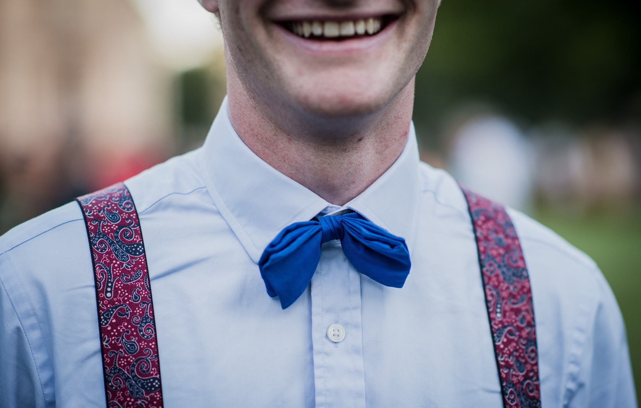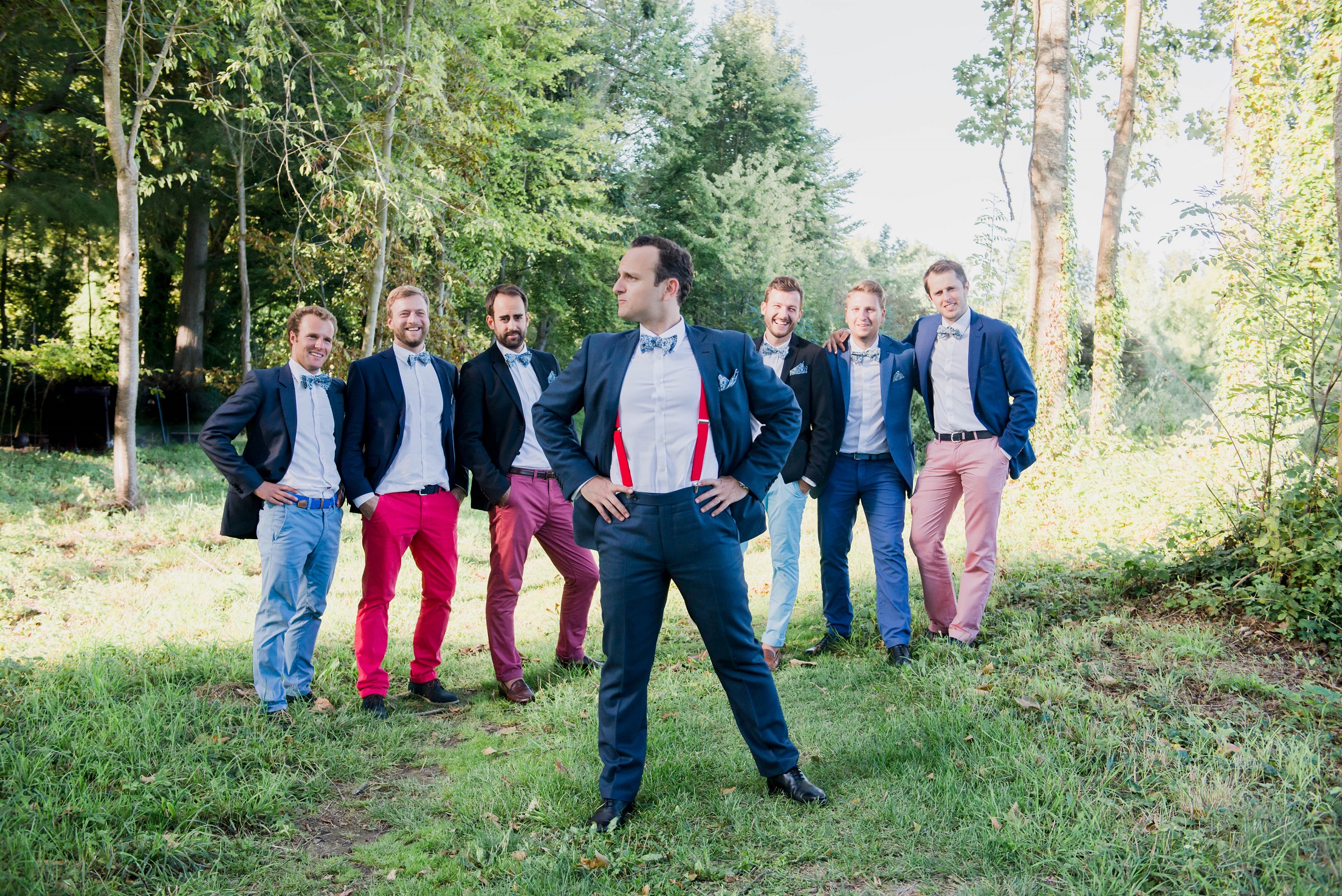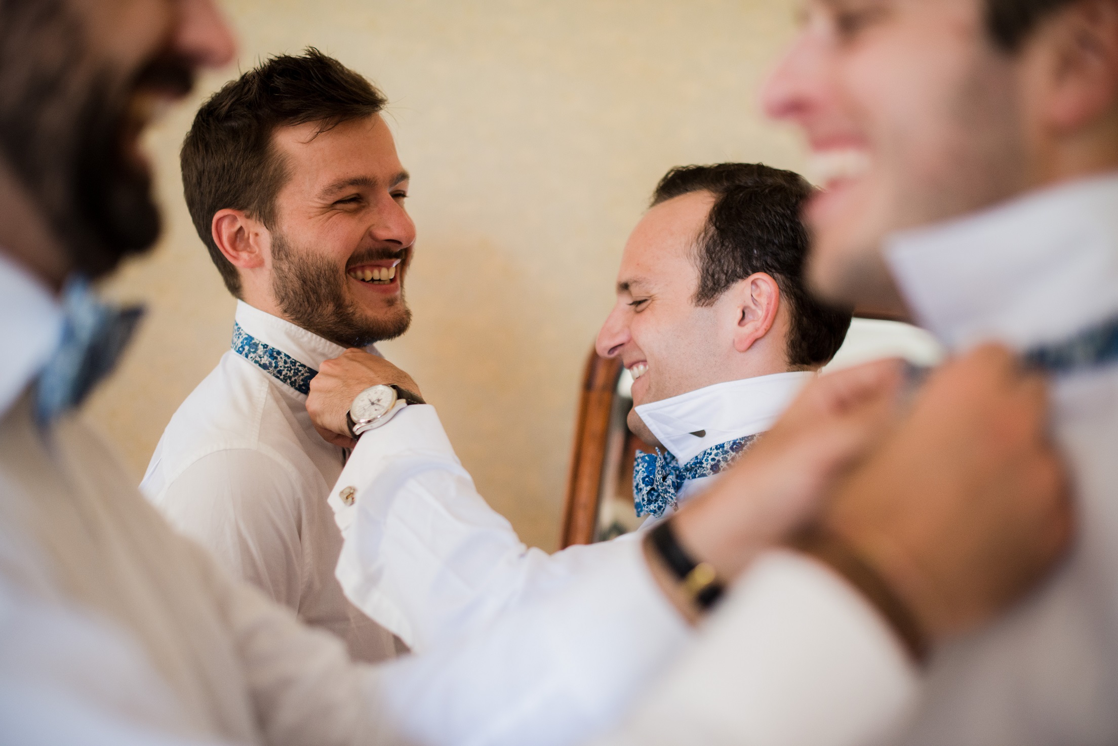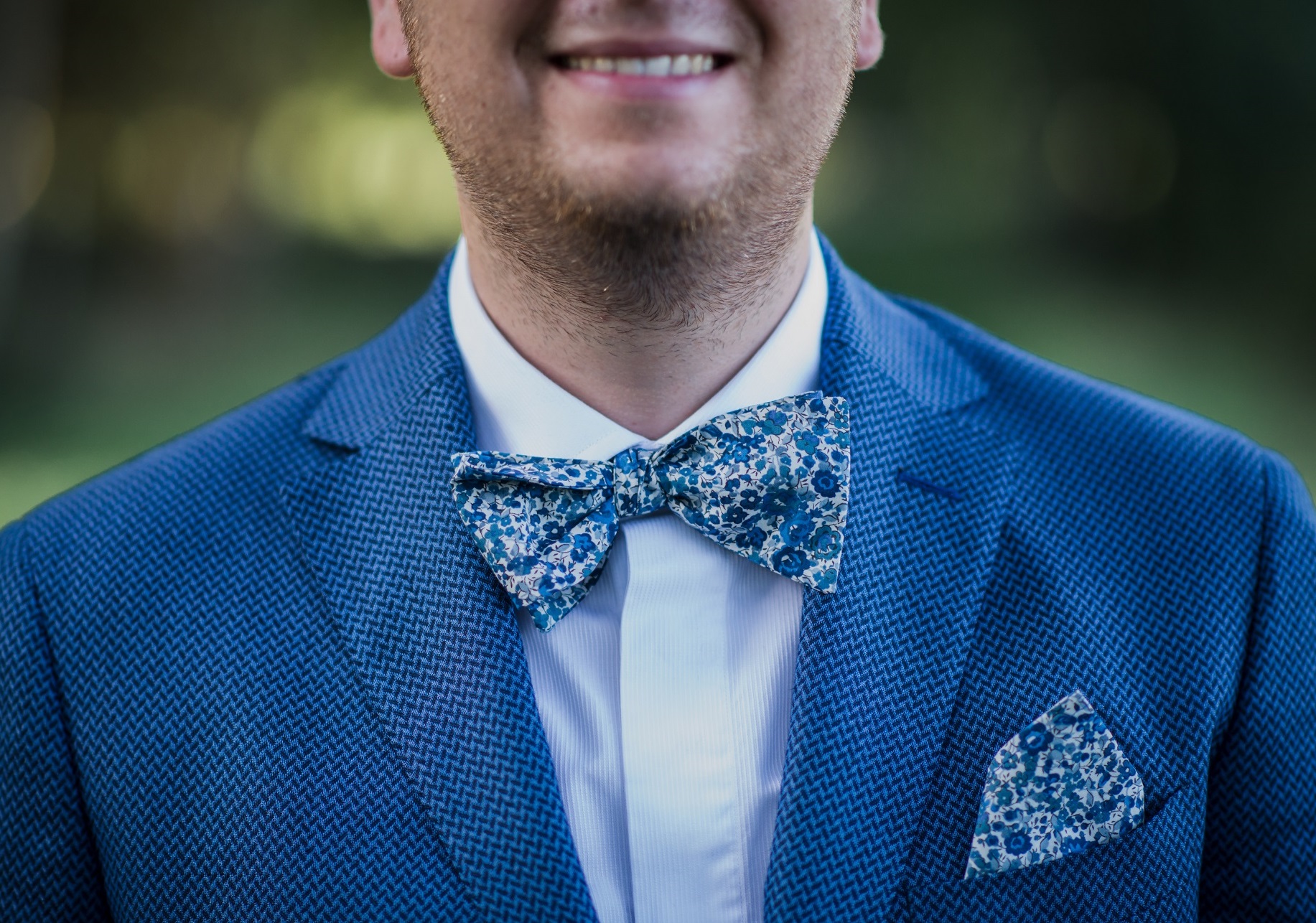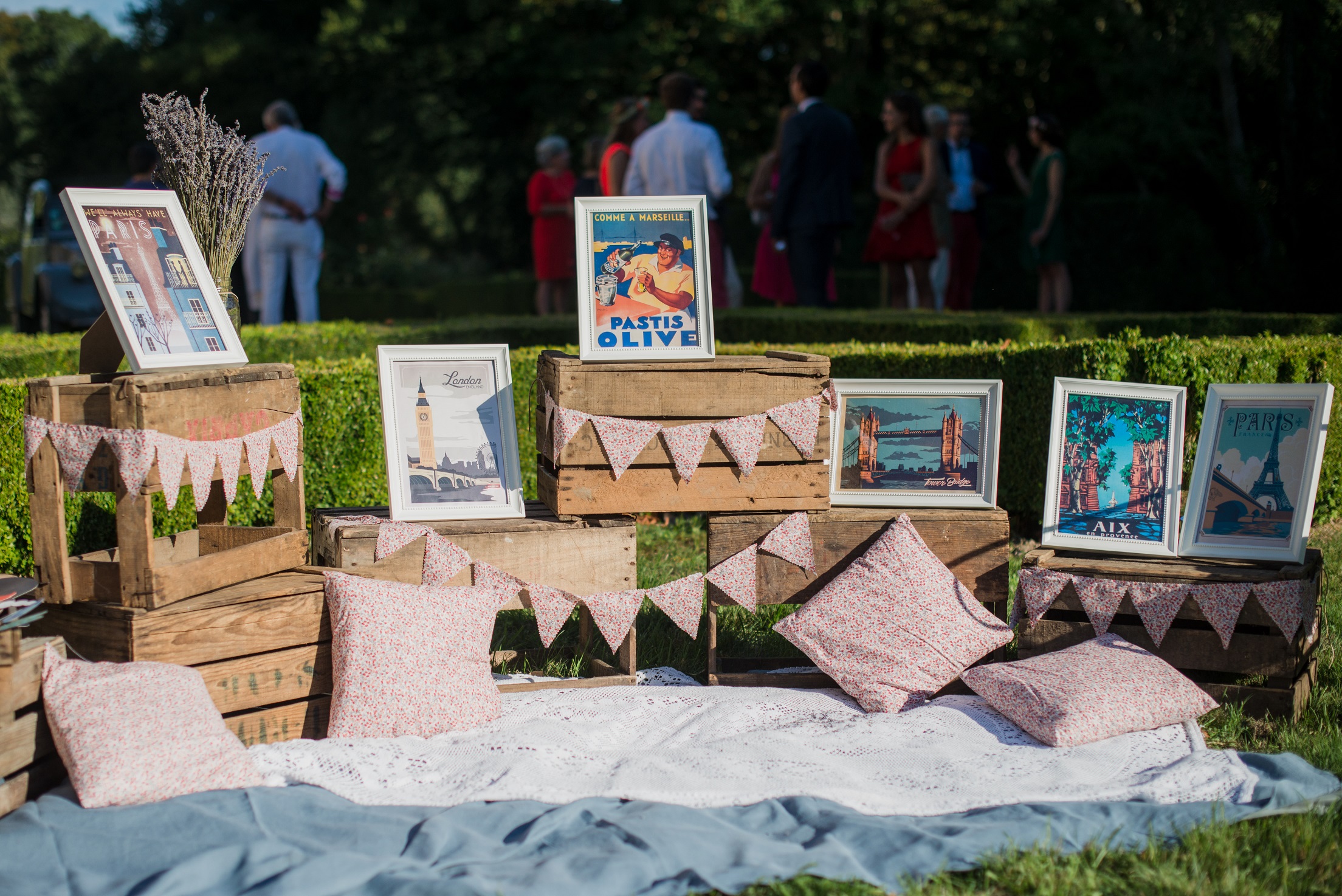 « Au départ on ne tenait pas trop à choisir quelque chose de strict. Au fur et à mesure,  le thème “voyage” a inspiré nos faire-part, le nom des tables et la déco et puis, habitant à Londres, on a mis des touches de tissus liberty de toutes les couleurs sur les tenues des témoins, des enfants d’honneur, des mariés et de la déco ! Ce qu’on a souhaité avant tout, c’était de la couleur. On avait demandé aux témoins et invités d’éviter les costumes et de venir en pantalons de couleur ! »