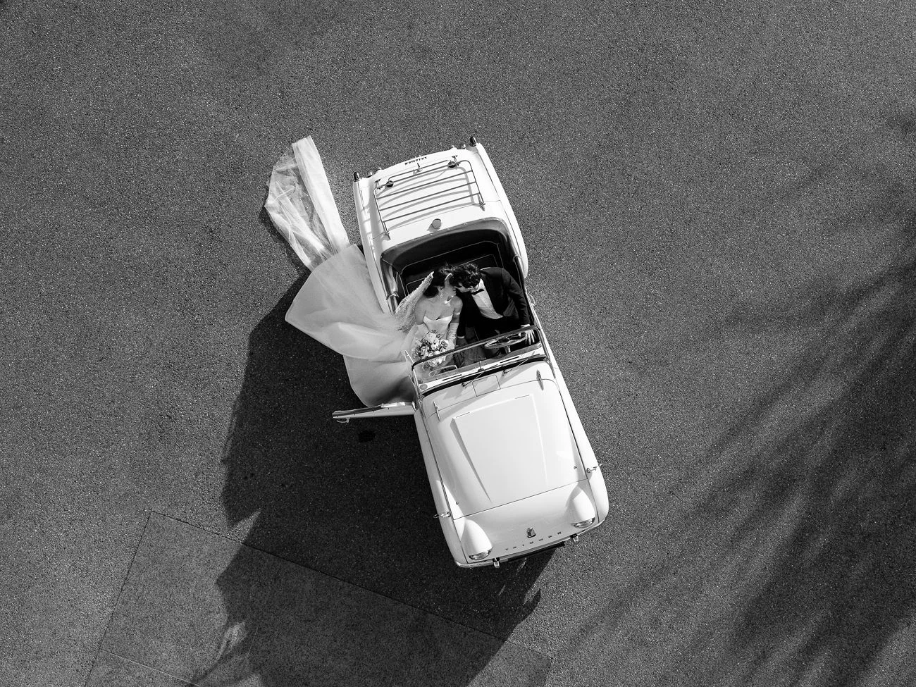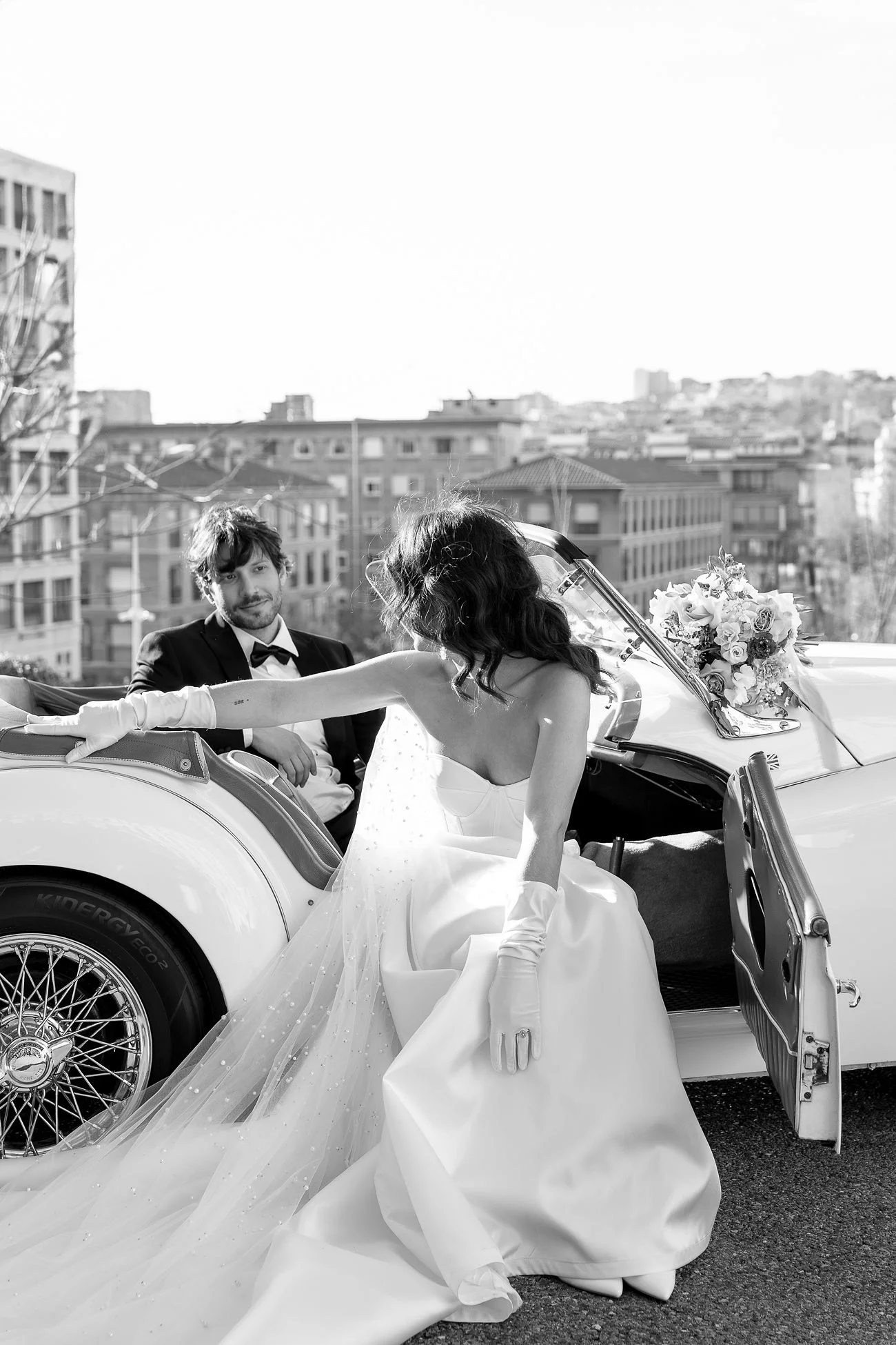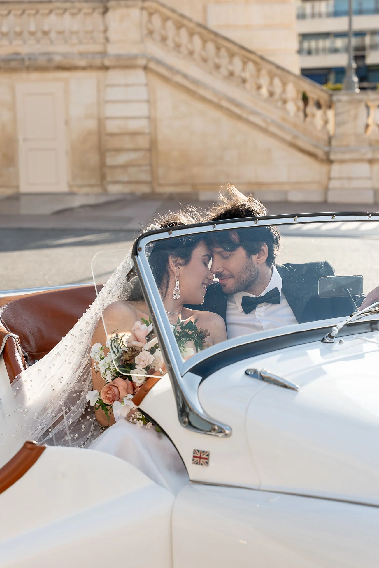 Les amoureux prennent la fuite dans une sublime Triumph TR3 de 1959 qui a été prêté par Paul de ” Voiture Passion”.
