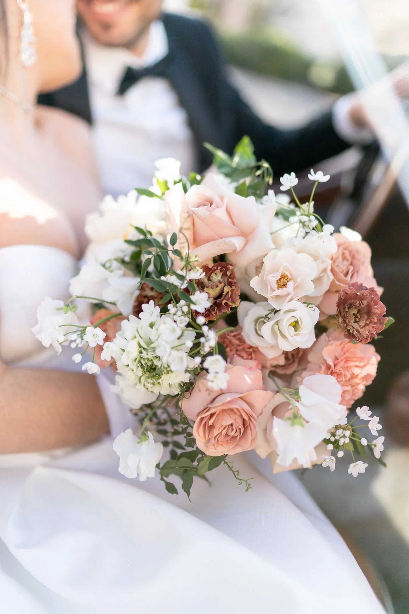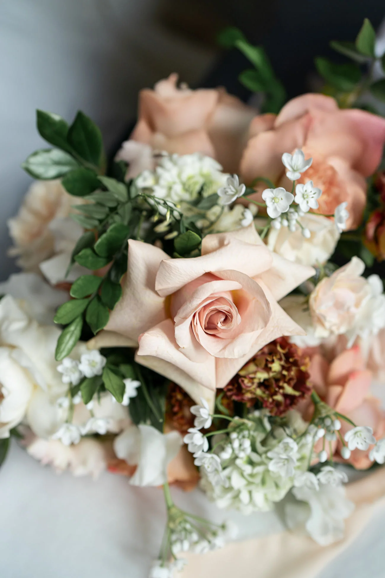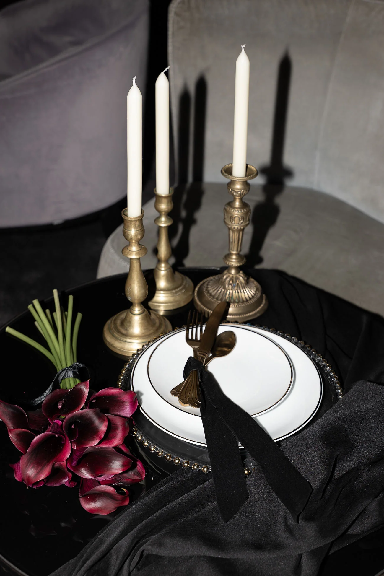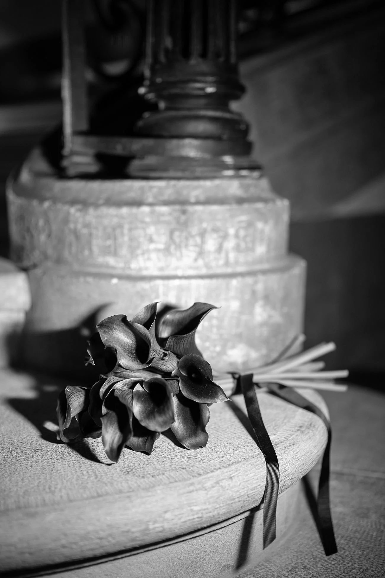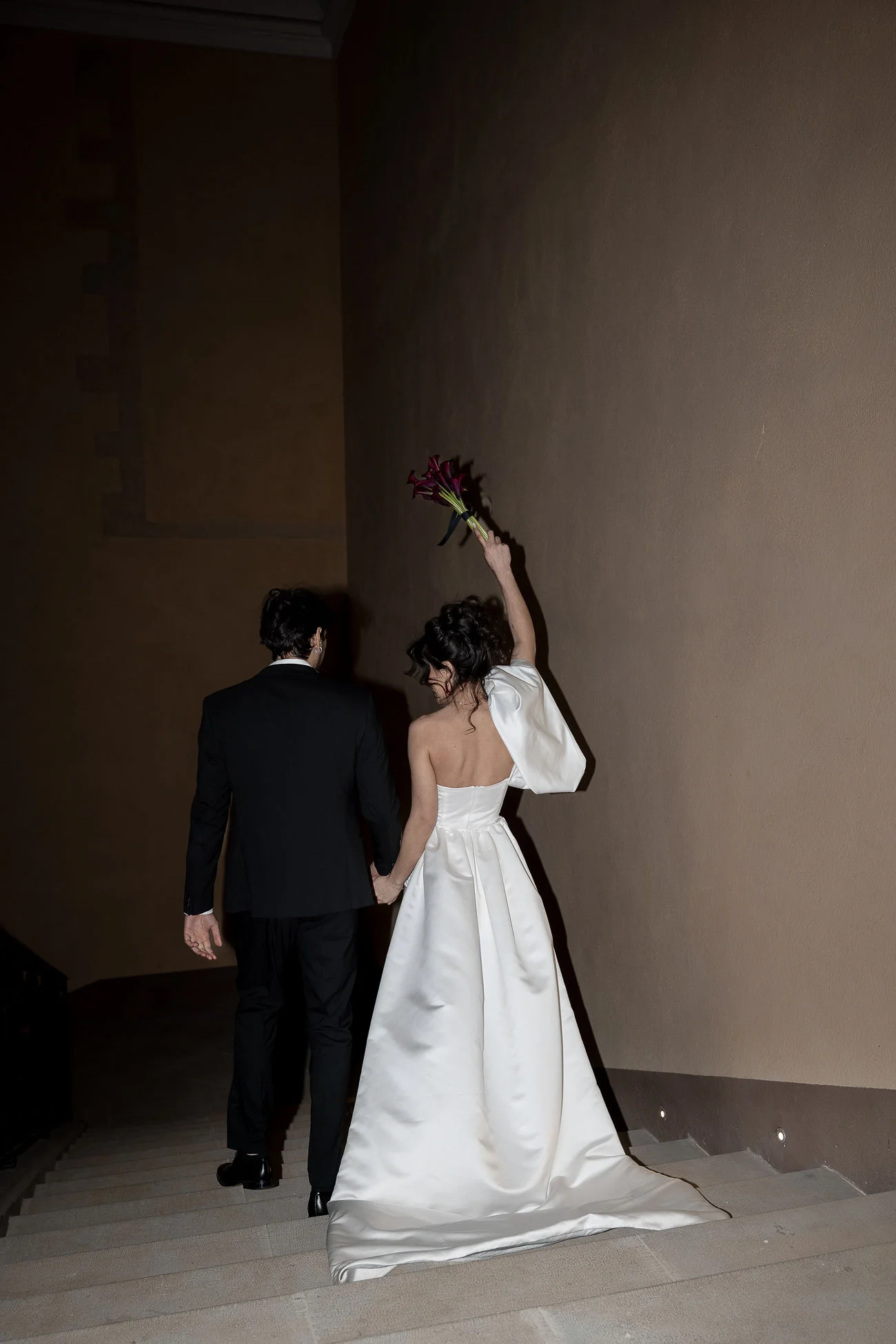 L’art floral, préparé avec soin et soucis du détail par Marie Rapsodie, a été progressivement évolutif : passant de belles roses rouge passion, a un bouquet de callas violette moderne, pour finir avec un bouquet de jour aux teintes moka et rose poudré.