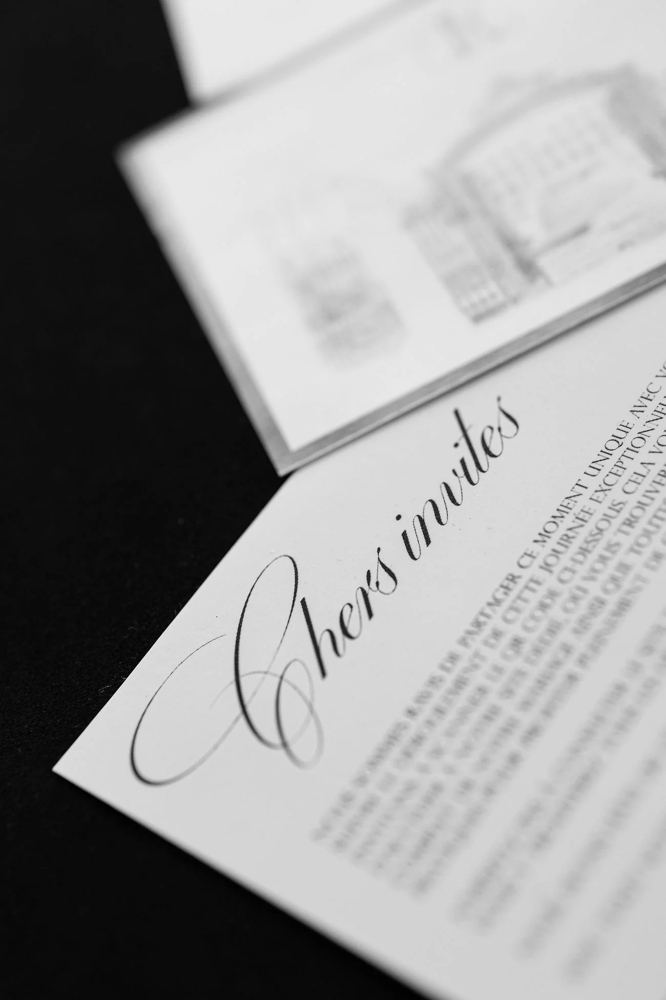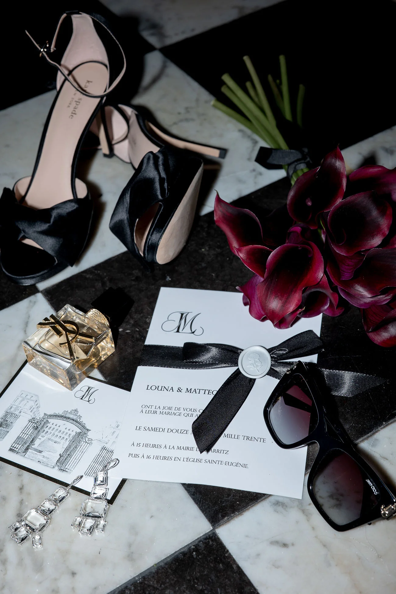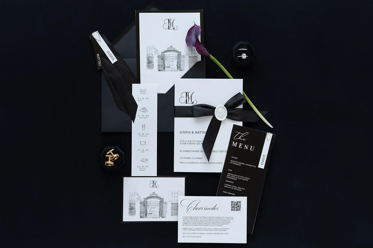 La création d’une papeterie mettant à l’honneur la classe indémodable du noir, opposé à une carterie de déclaration de vœux d’un blanc immaculé, a été confectionnée par Catherine et Virginie de Feeline Création.