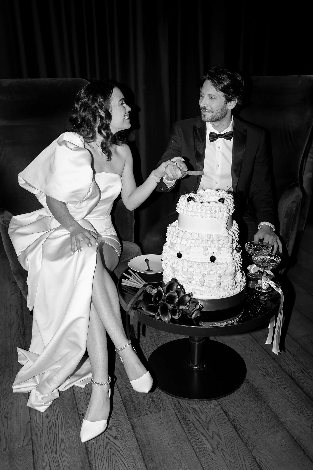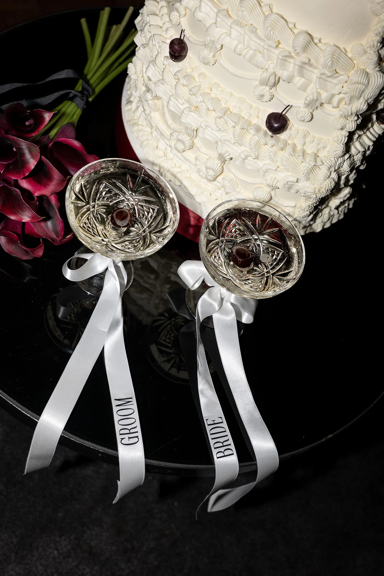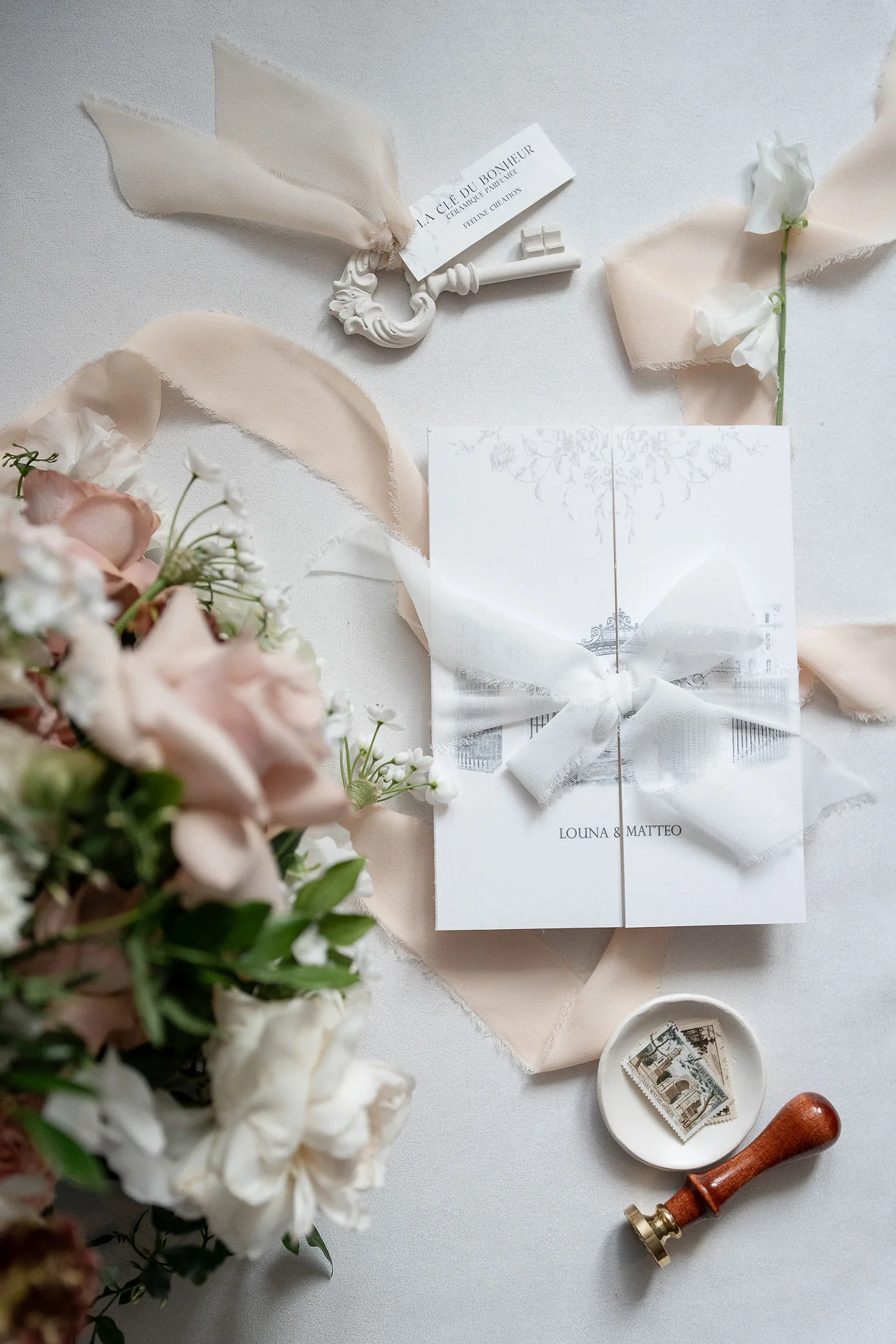La création d’une papeterie mettant à l’honneur la classe indémodable du noir, opposé à une carterie de déclaration de vœux d’un blanc immaculé, a été confectionnée par Catherine et Virginie de Feeline Création.