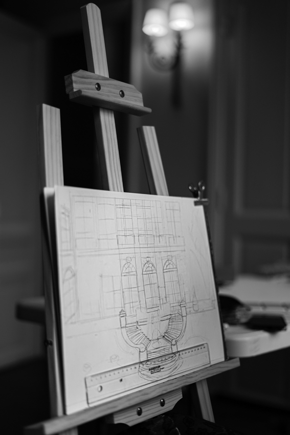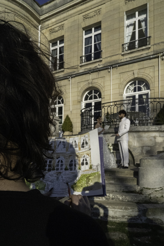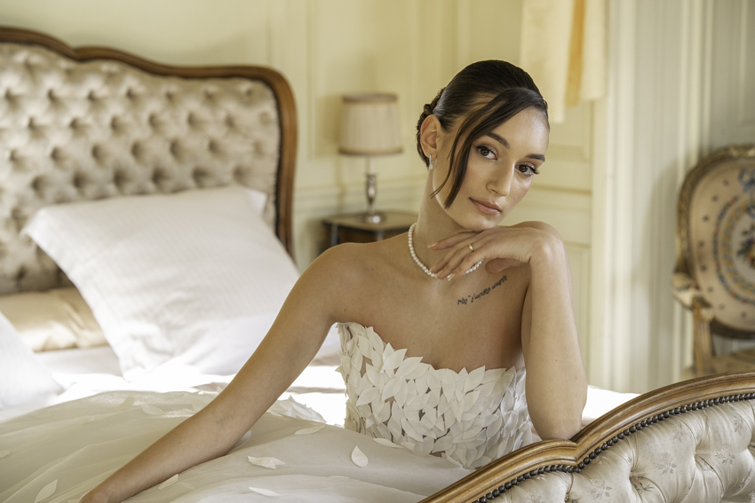 Nouvelle page blanche : la couleur blanche représente une envie de « reset » de repartir sur une base vierge, comme la page blanche d’une illustration, de simplifier ce qui est complexe dans l’organisation du mariage et de se concentrer sur l’essentiel. Ici, la beauté et le charme d’un lieu posent le décor épuré du mariage simple, à leur image. Dans ce shooting au décor immaculé, une illustratrice a peint le couple pour témoigner de la quiétude et de l’âme du lieu, point de départ du nouveau chapitre de leur vie à deux.