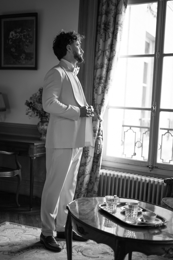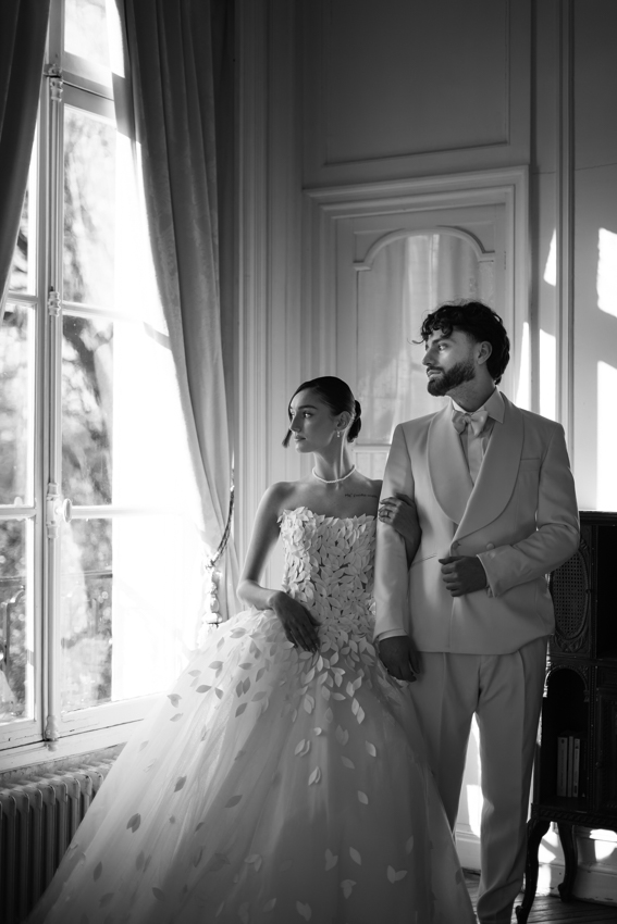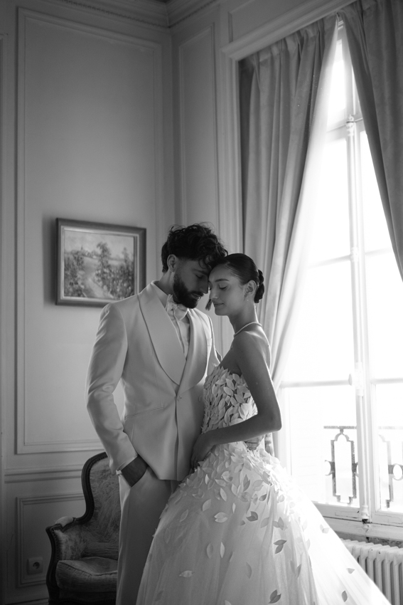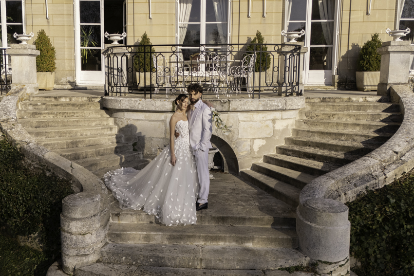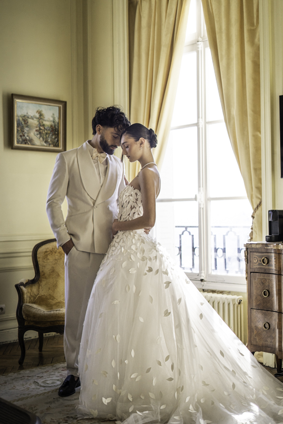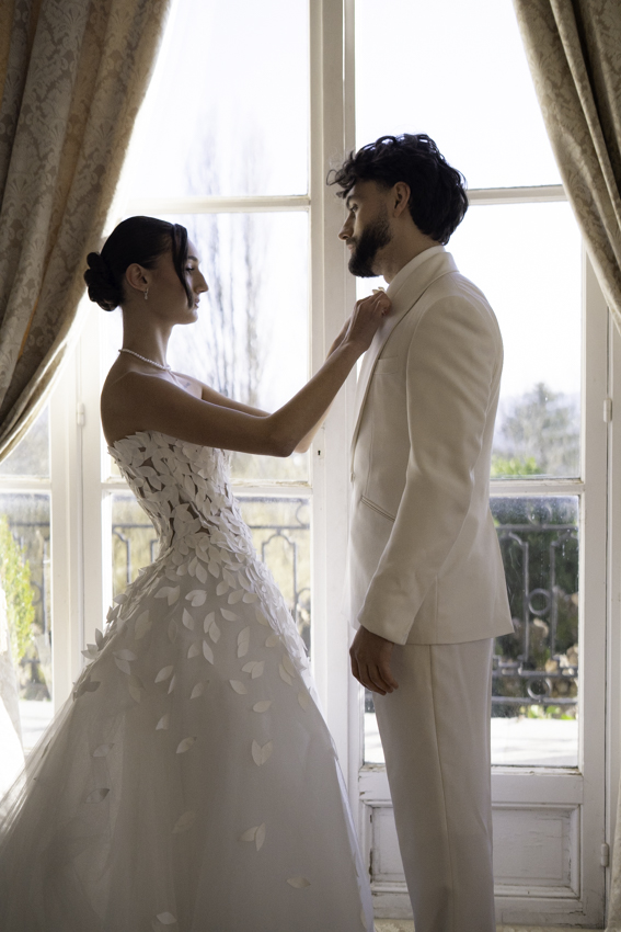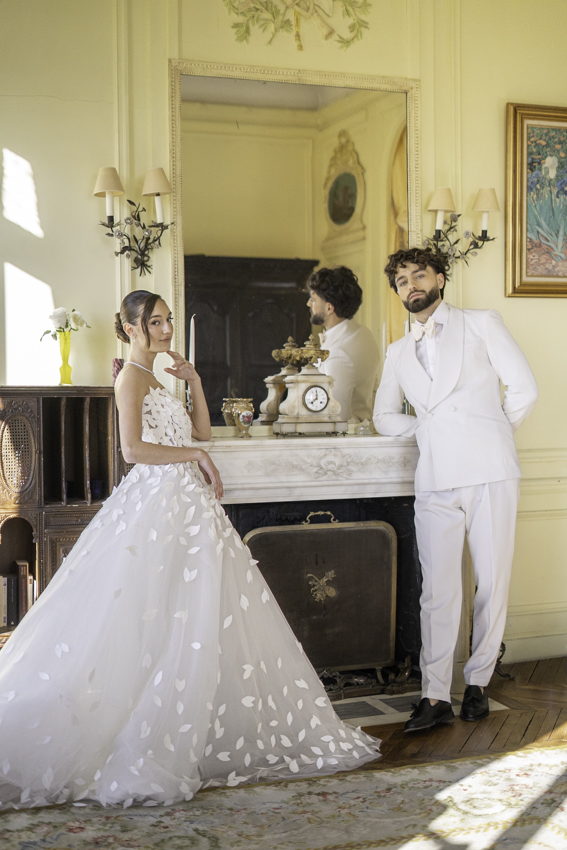 Clarté : ce blanc doux est associé à davantage de clarté d’esprit, focalisation et introspection — comme une toile vierge prête à accueillir de nouvelles idées. Dans ce shooting, les mariés posent dans les espaces du château du Prieuré de façon presque contemplative et centrés sur eux-même.”