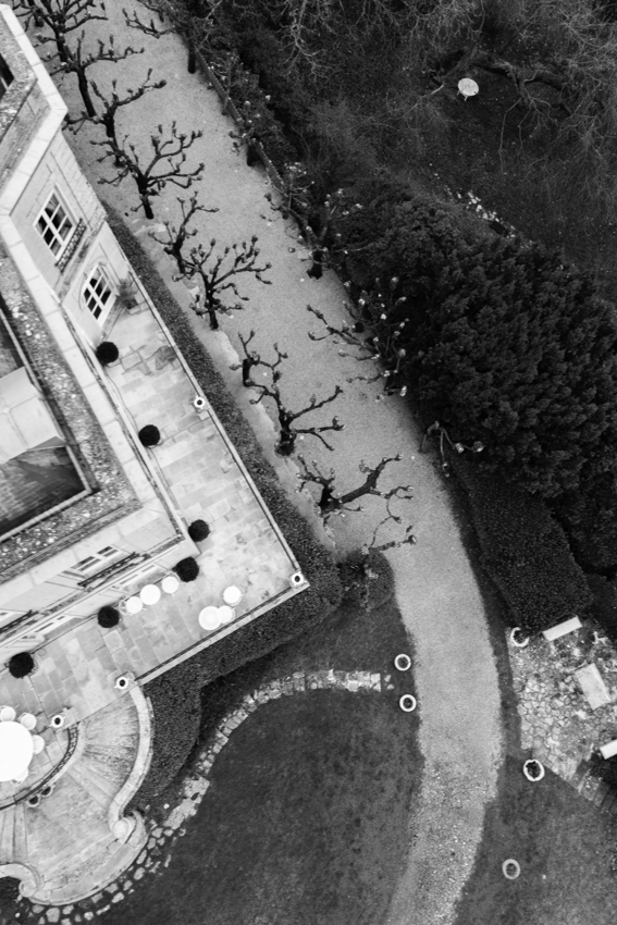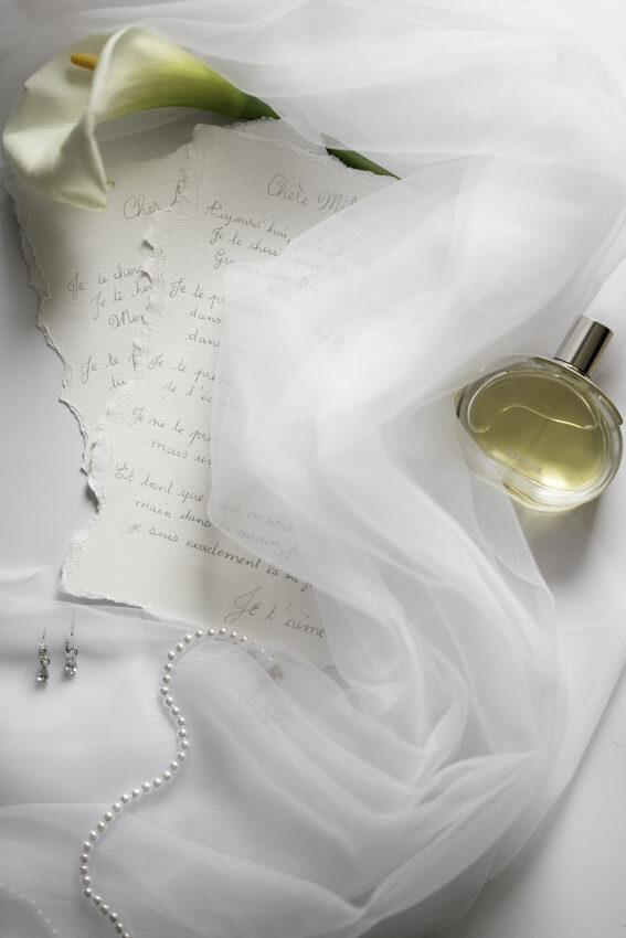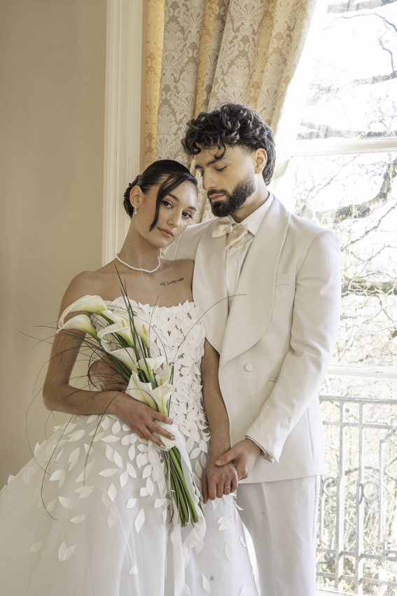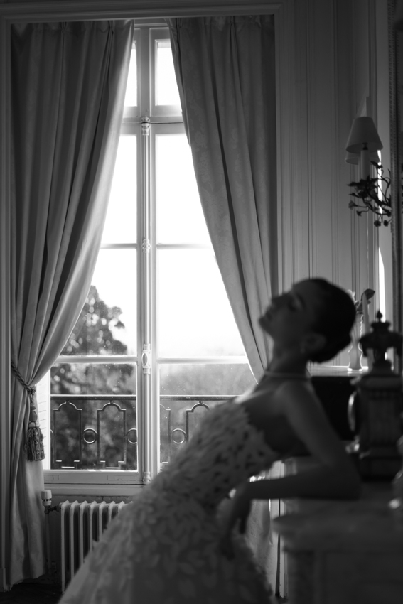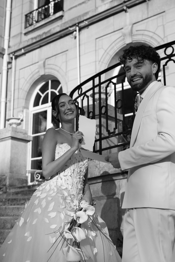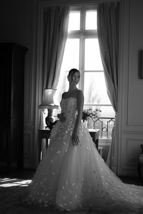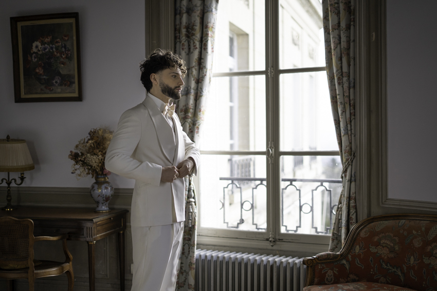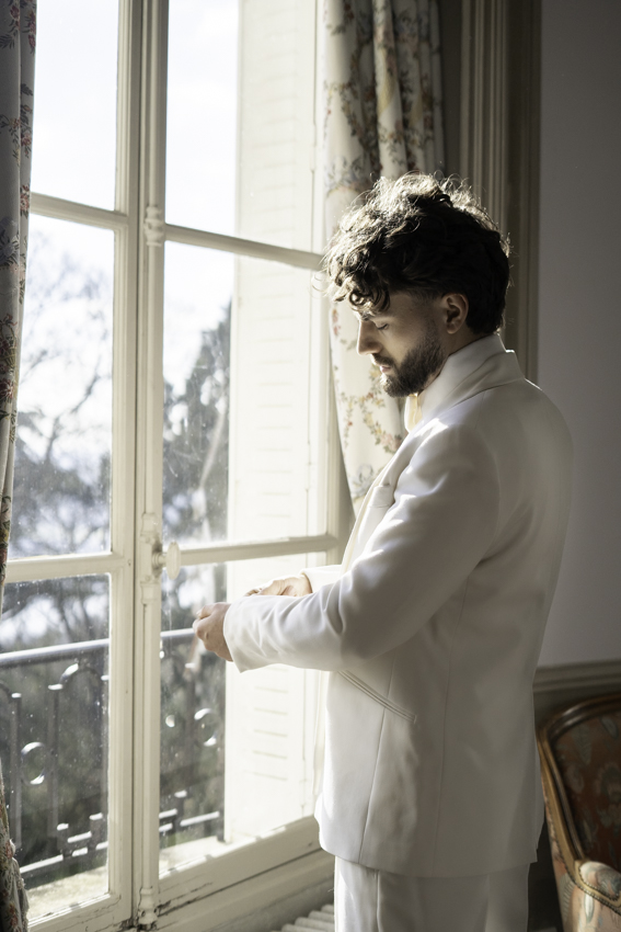 Clarté : ce blanc doux est associé à davantage de clarté d’esprit, focalisation et introspection — comme une toile vierge prête à accueillir de nouvelles idées. Dans ce shooting, les mariés posent dans les espaces du château du Prieuré de façon presque contemplative et centrés sur eux-même.”