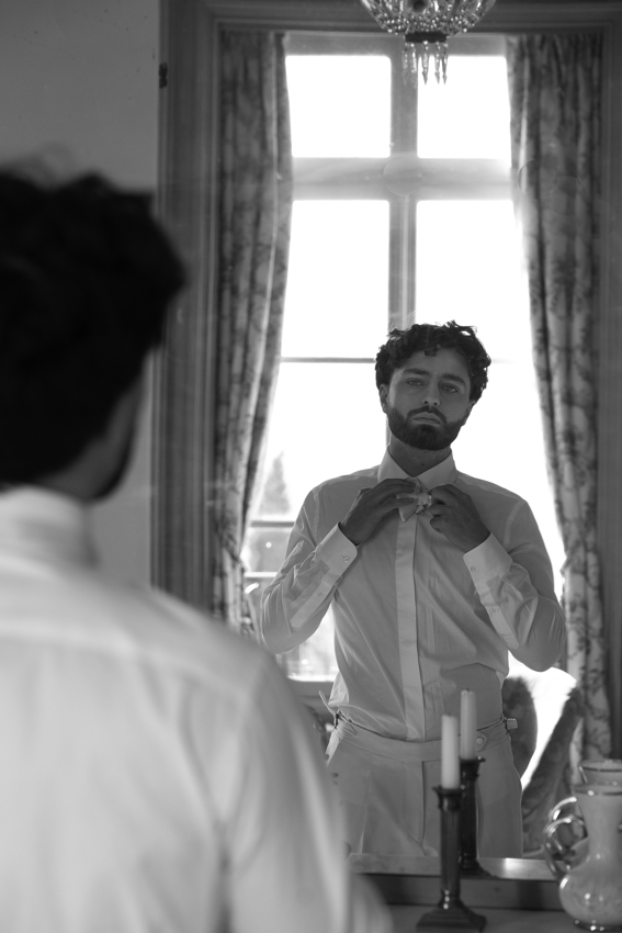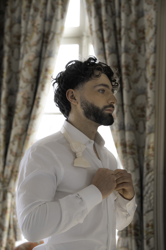 Calme et sérénité : la couleur est décrite comme un « souffle d’air » ou un « murmure de calme » dans un monde trop rapide et visuellement saturé. Elle évoque le retour à la  tranquillité et à la paix intérieure. Les mariés posent en toute quiétude et invitent à une célébration de mariage dans la joie mais aussi dans la sérénité. Ils posent calmement dans les pièces du château, se (re)posent l’un sur l’autre, et nous invitent à profiter de la tranquillité du Prieuré d’Evecquemont.