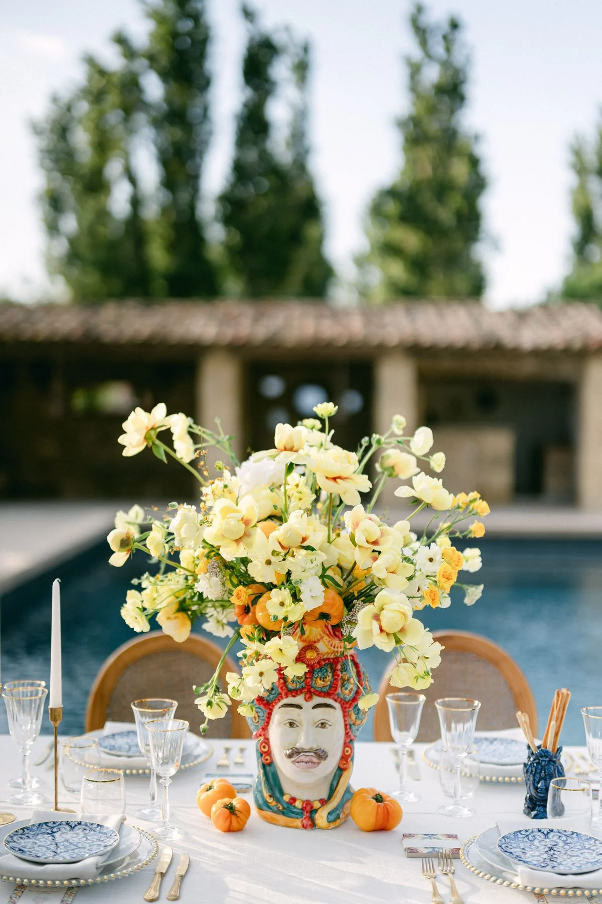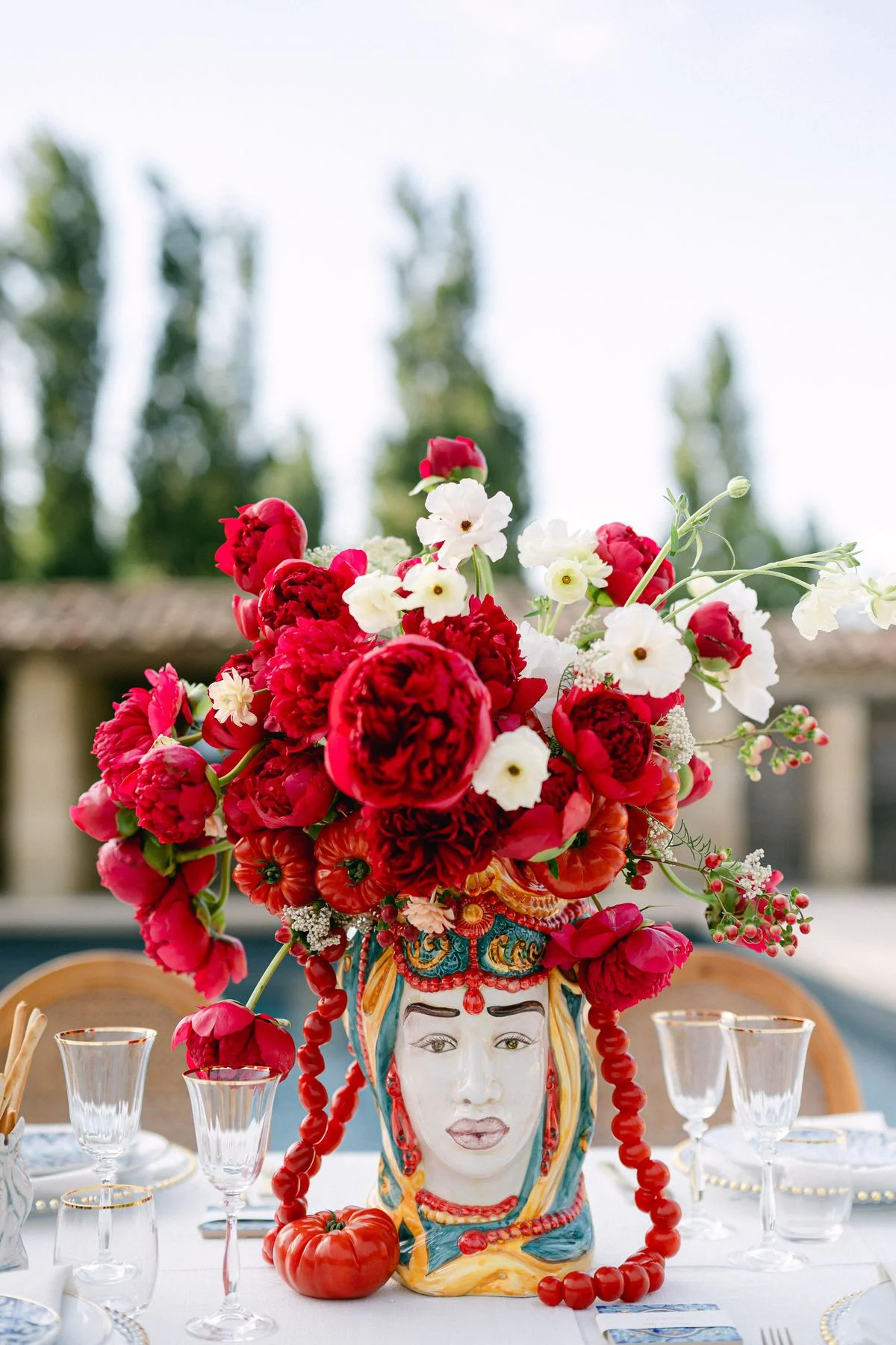 Pensé comme une immersion sensorielle, DOLCE AMORE célèbre un art de vivre méridional, joyeux et assumé. Au cœur de la scénographie : une table festive dressée de linge de maison Dolce & Gabbana, de vaisselle artisanale sicilienne et de vases chinés, mêlés à des têtes siciliennes colorées. Chaque élément raconte une histoire, celle de la main qui a façonné, du temps qui a patiné, du lieu qui a inspiré.