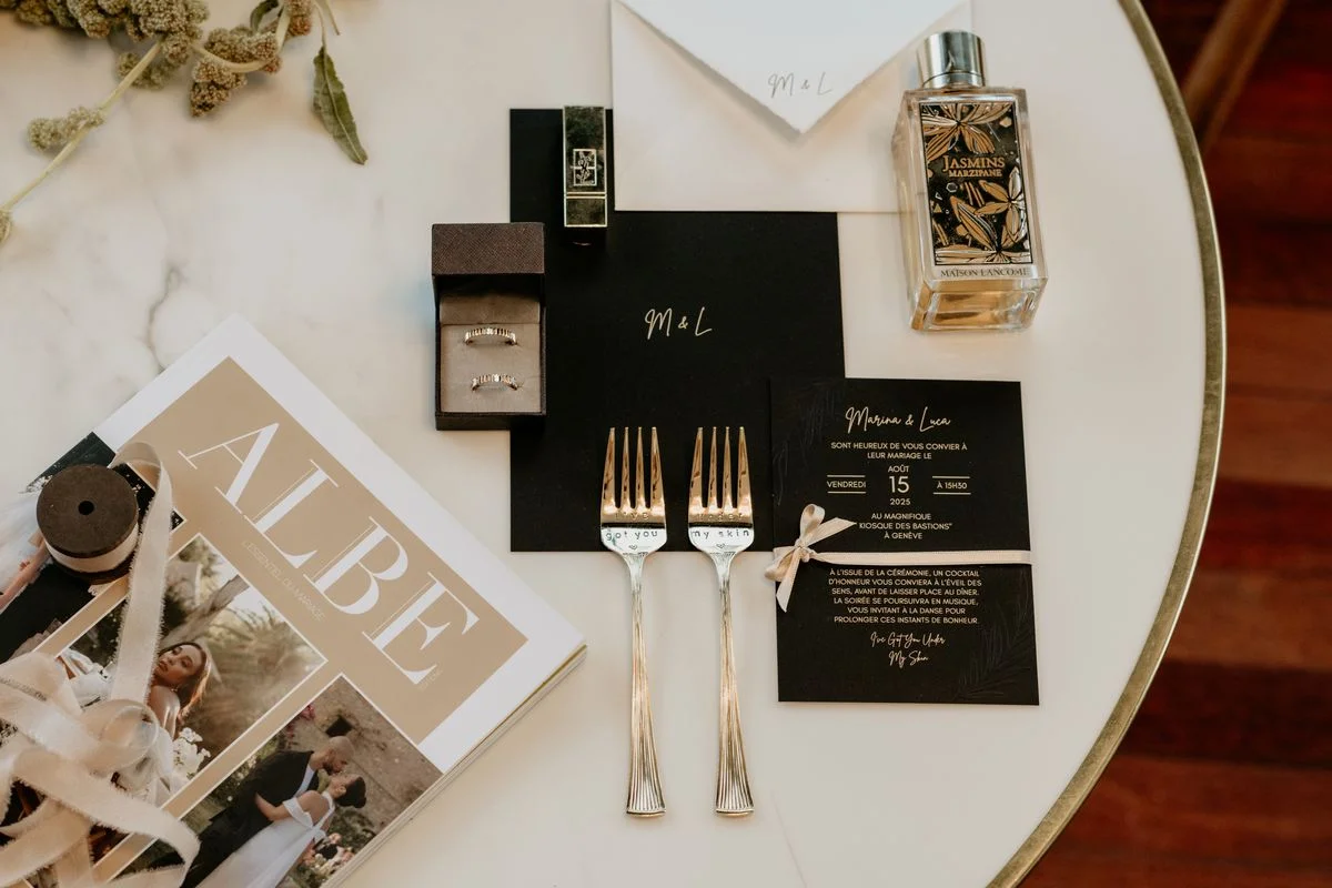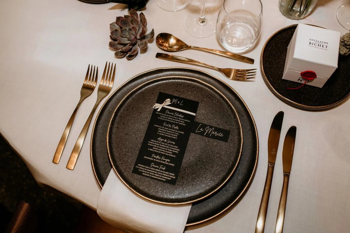 Puis ce fil conducteur, poétique avec la phrase “I’ve got you under my skin”. Elle se retrouve sur les faire-part, murmure une promesse, puis se grave discrètement sur les fourchettes des Mariés. Un détail intime et audacieux qui transforme une simple union en un récit personnel, une célébration de l’amour dans ses manifestations les plus subtiles.