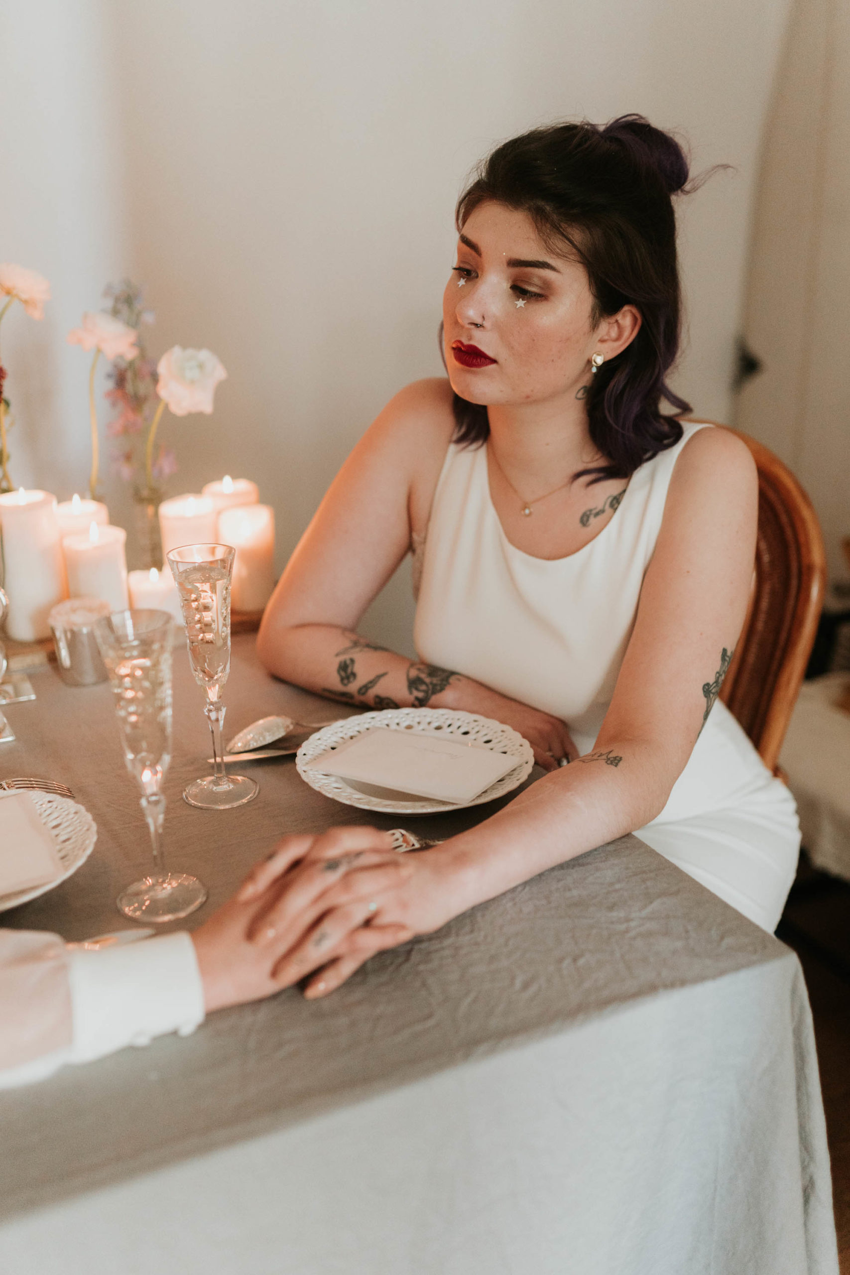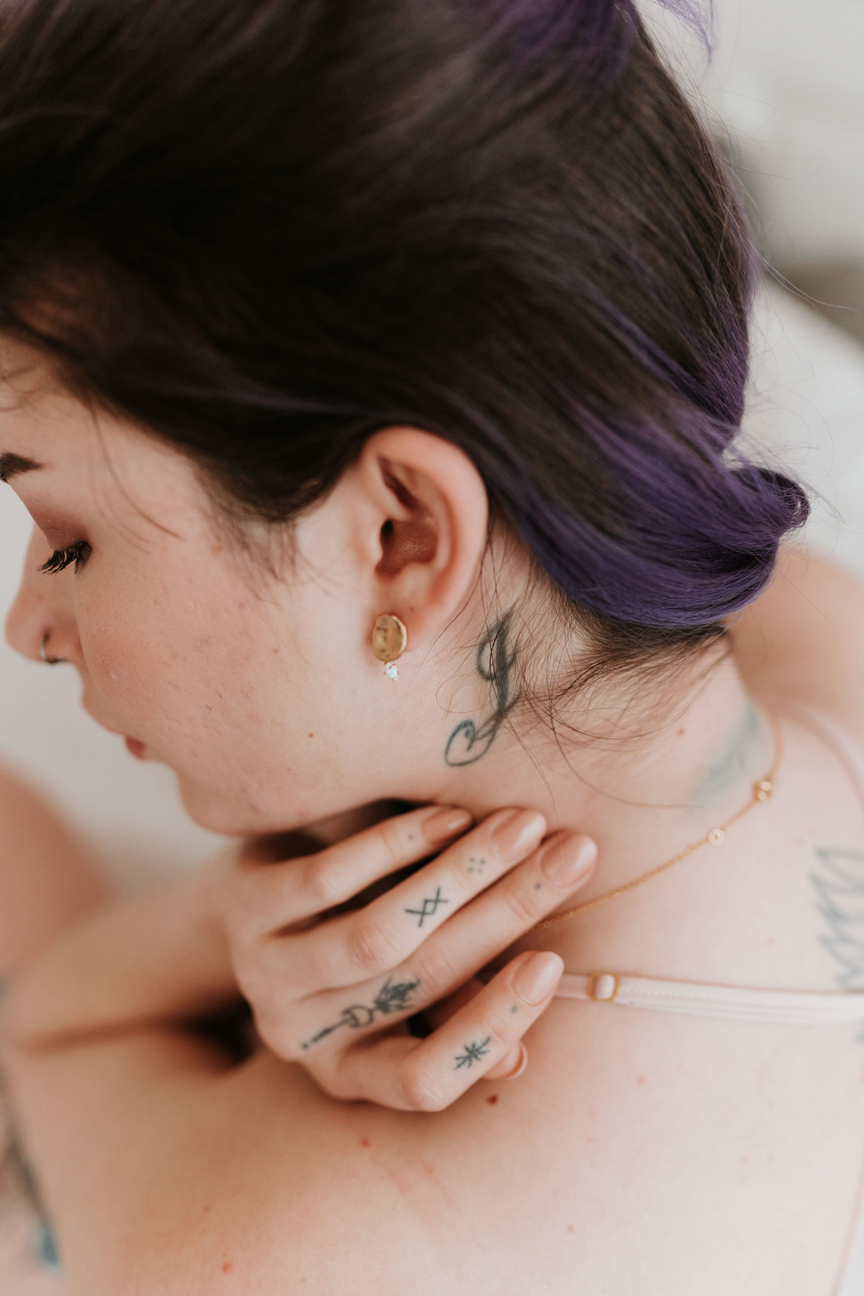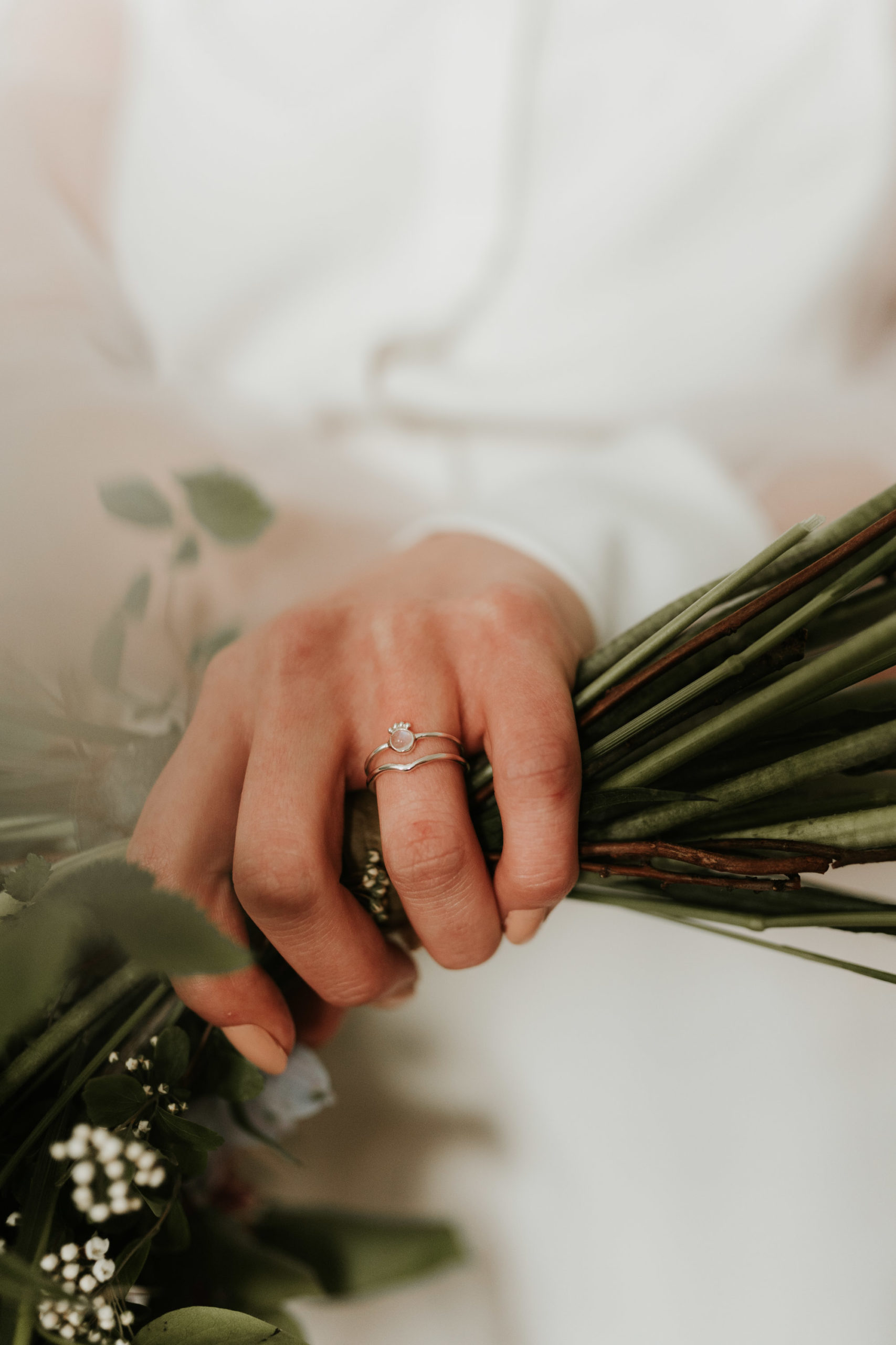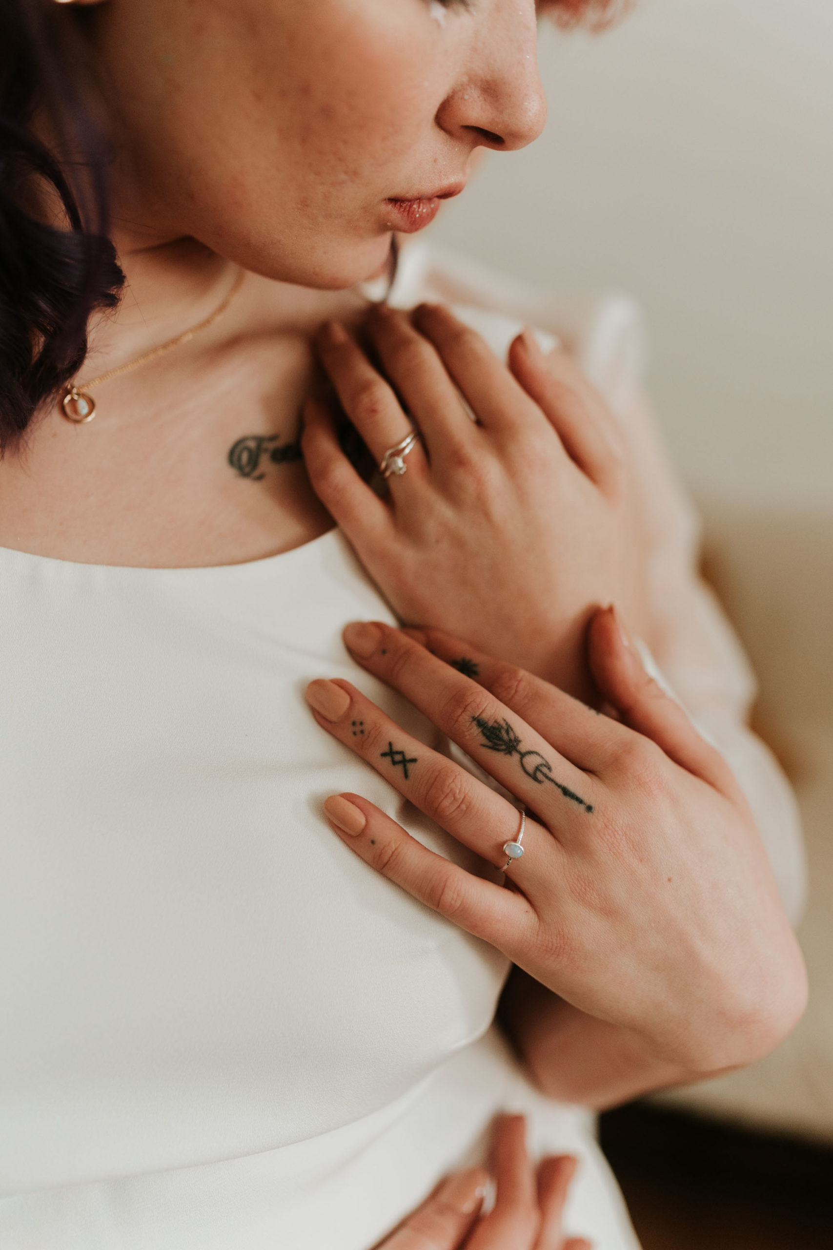 « J’adore les pierres de lunes et opales, elles changent de couleur en fonction de la lumière et ça m’a toujours fascinée. Quand je cherchais des idées pour réaliser un shooting, ça m’est donc très vite venu à l’idée. Le but était de faire une session axée autour de la nature, simple mais moderne. J’ai choisi un vrai couple pour avoir une réelle alchimie entre les deux. Comme je me focalise sur le fait d’immortaliser des émotions, c’était important pour moi de pouvoir photographier un couple qui s’aime vraiment. »