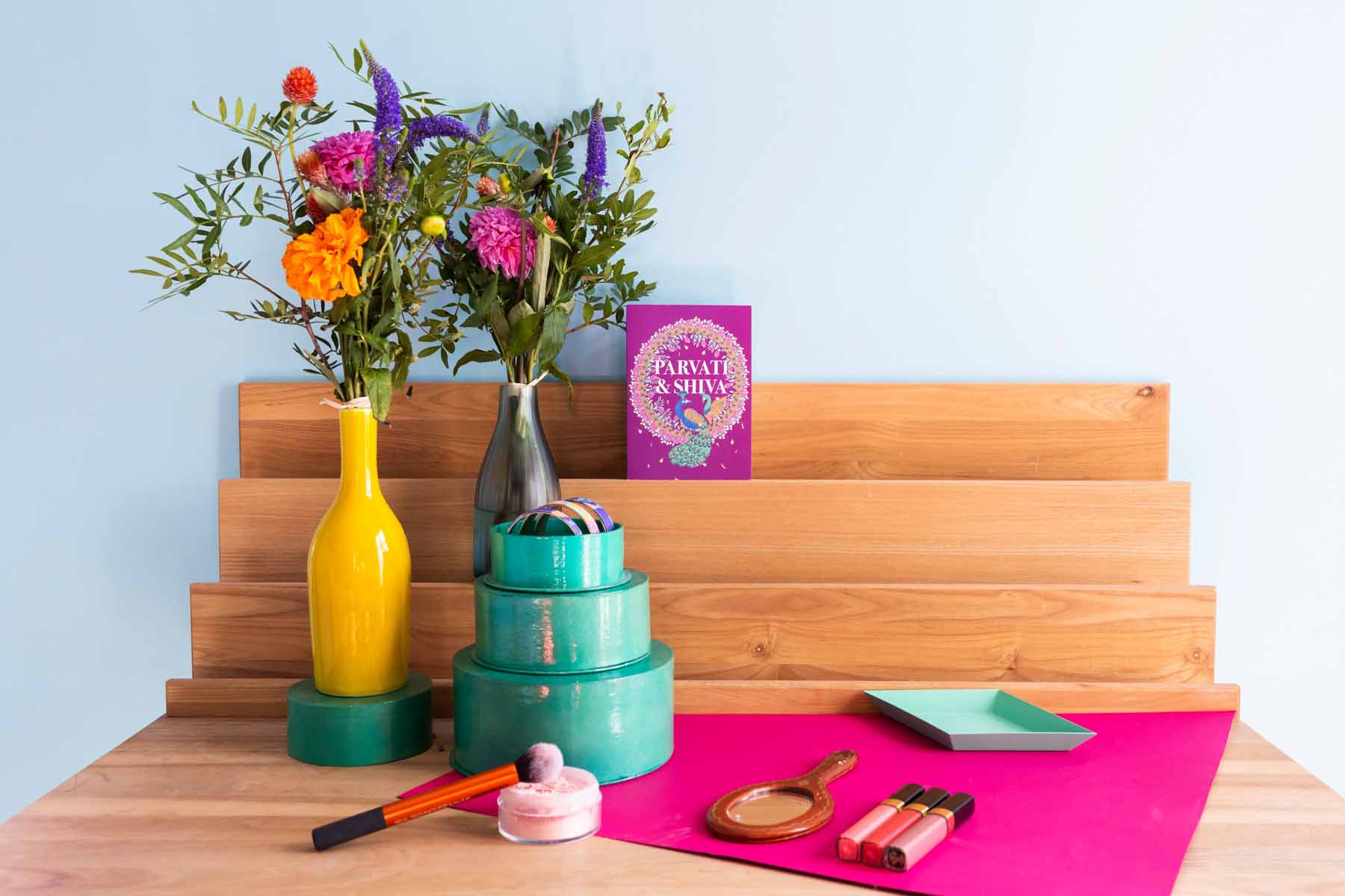 Pour la réalisation de ce shooting, elles ont tenu à apporter de la fraîcheur, du minimalisme et une touche rétro en faisant un clin d’oeil à l’esthétique de Wes Anderson. Pour cela, elles ont opté pour des fonds de couleurs, un travail floral soigné par Désirée, au travers de compositions graphiques, sobres et colorées.